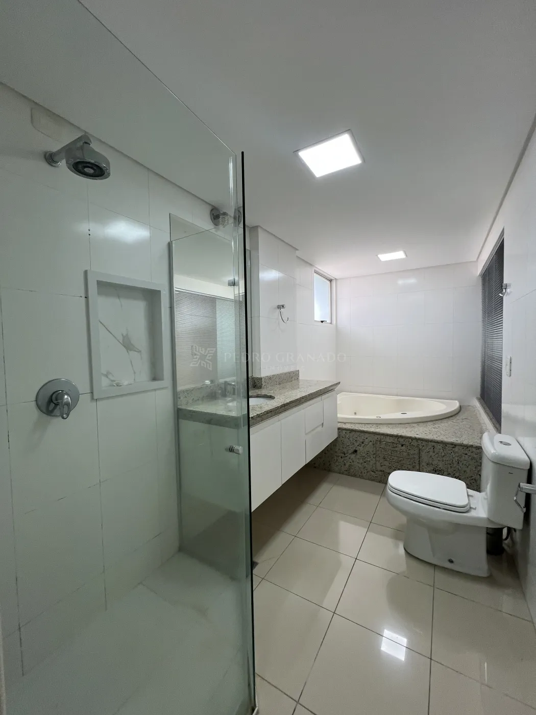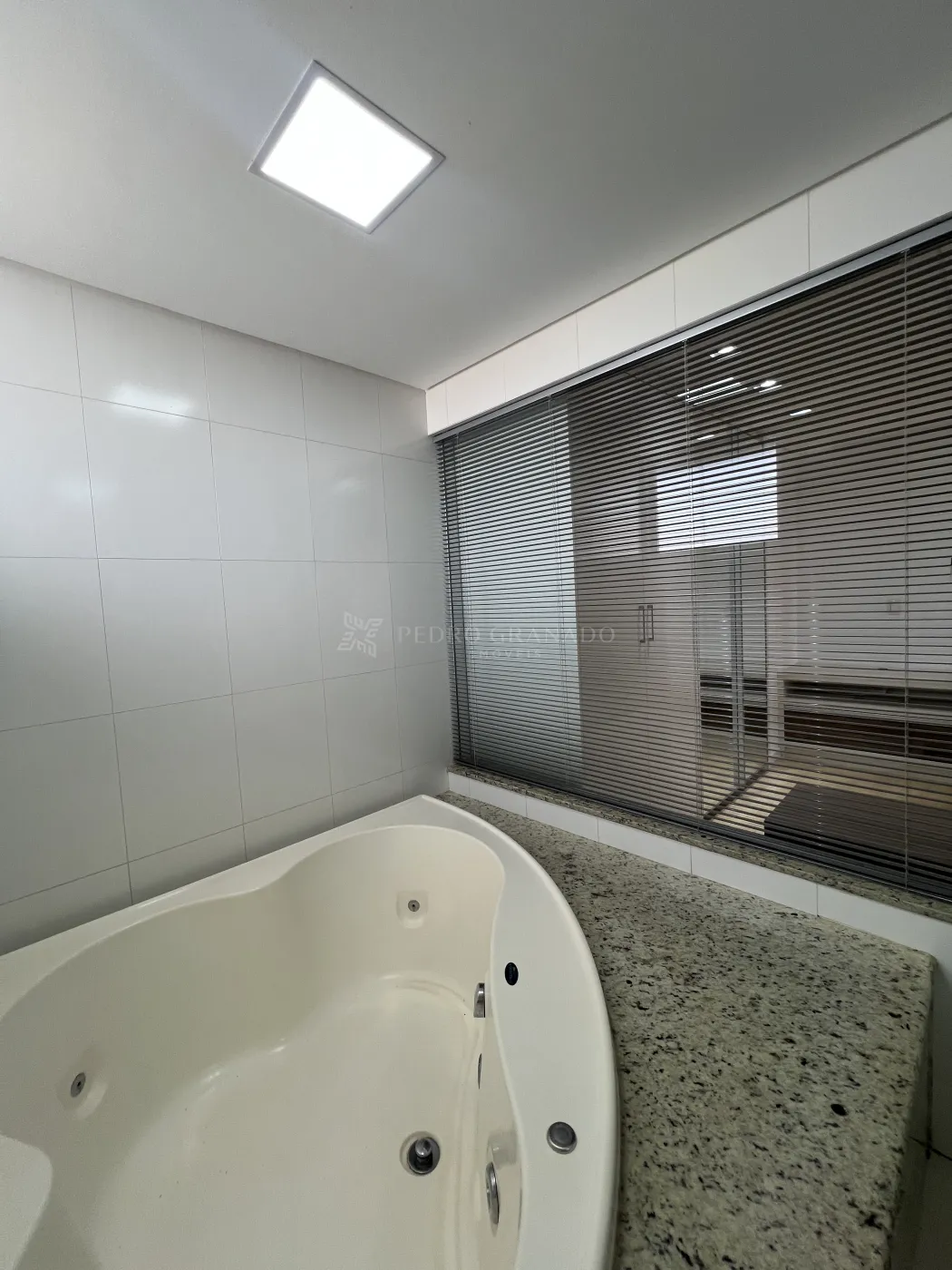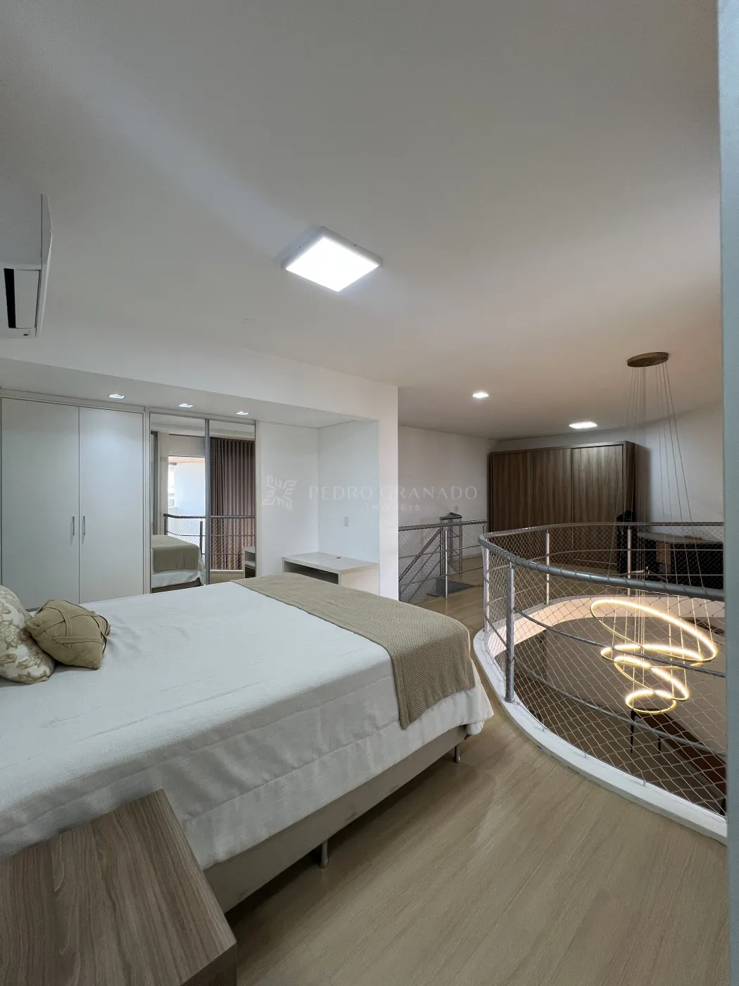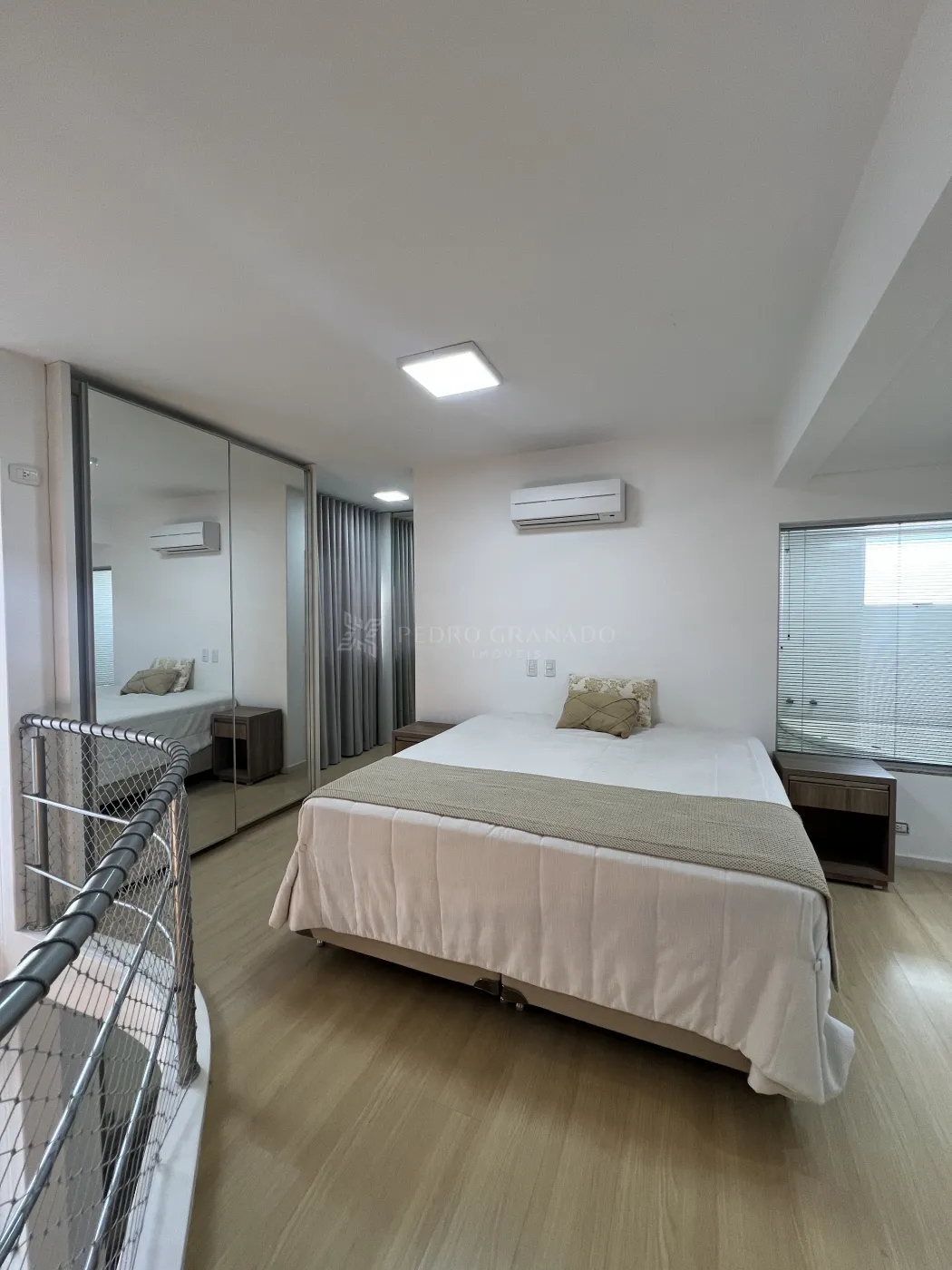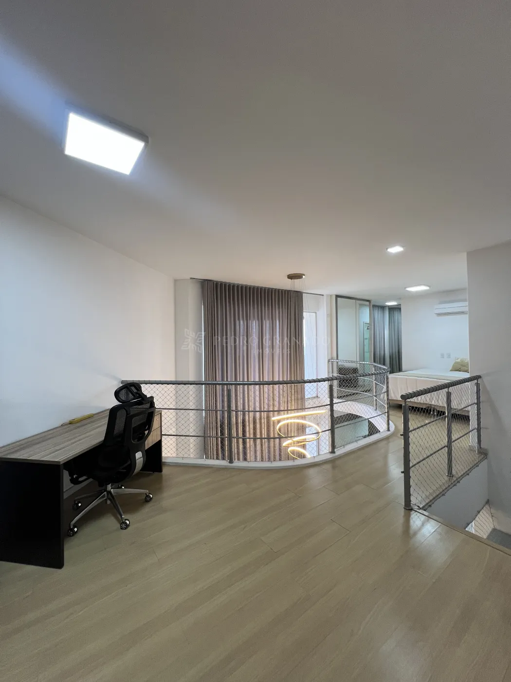 No andar superior, conta com escritório com escrivaninha e 01 suíte com cama, ar-condicionado, guarda-roupa planejado, banheiro da suíte com armário, box e hidromassagem.