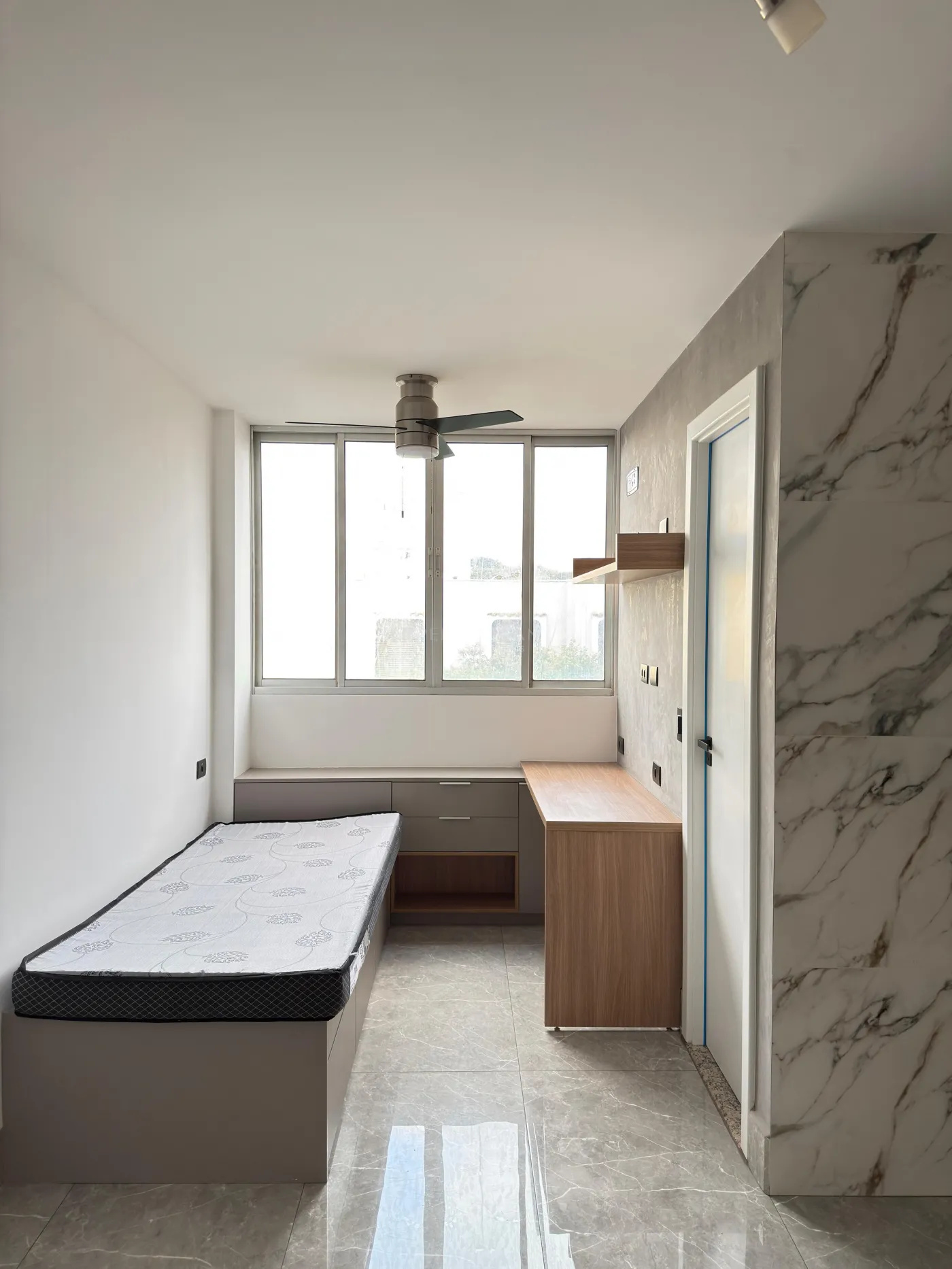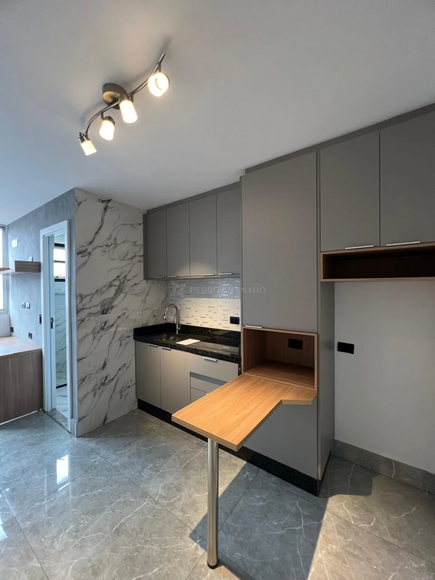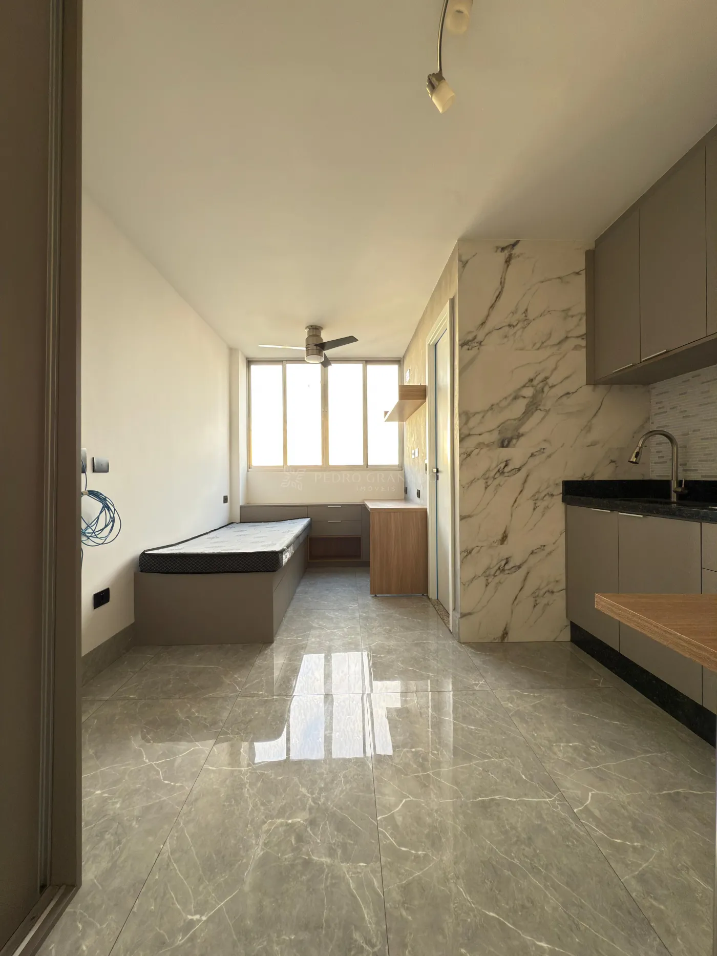 Com cozinha planeja com cooktop, quarto com guarda-roupa planejado, cama de solteiro com 03 gavetões, bancada para estudo e ventilador de teto, banheiro com armário e, box blindex e 01 vaga de garagem