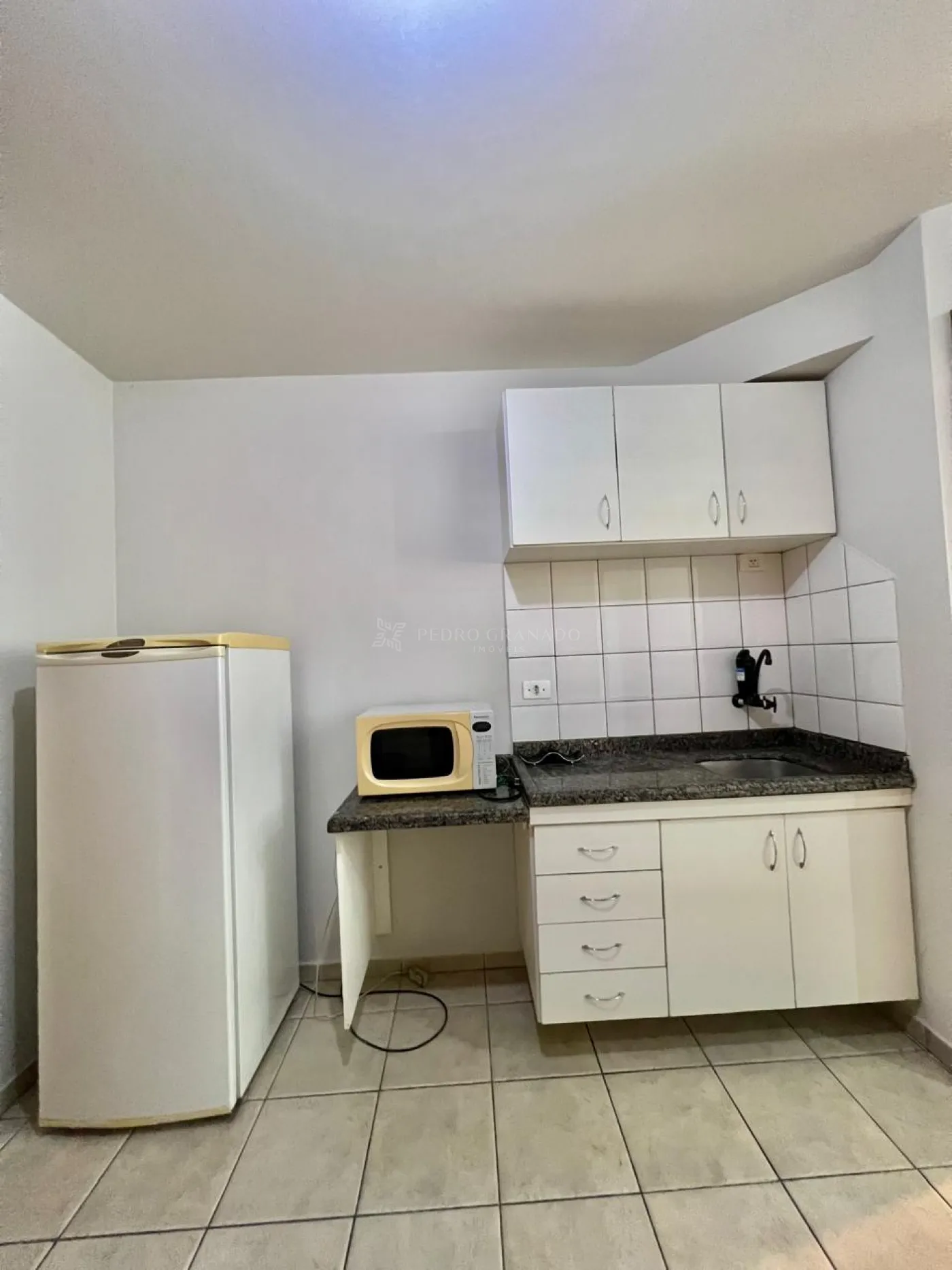 Geladeira, pia em granito com armário embaixo e em cima, suporte em granito para forno micro-ondas.