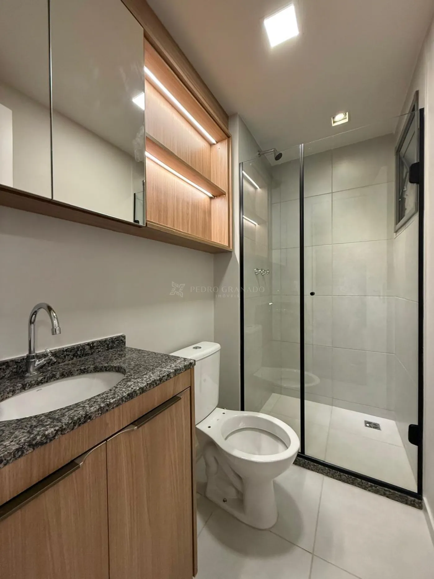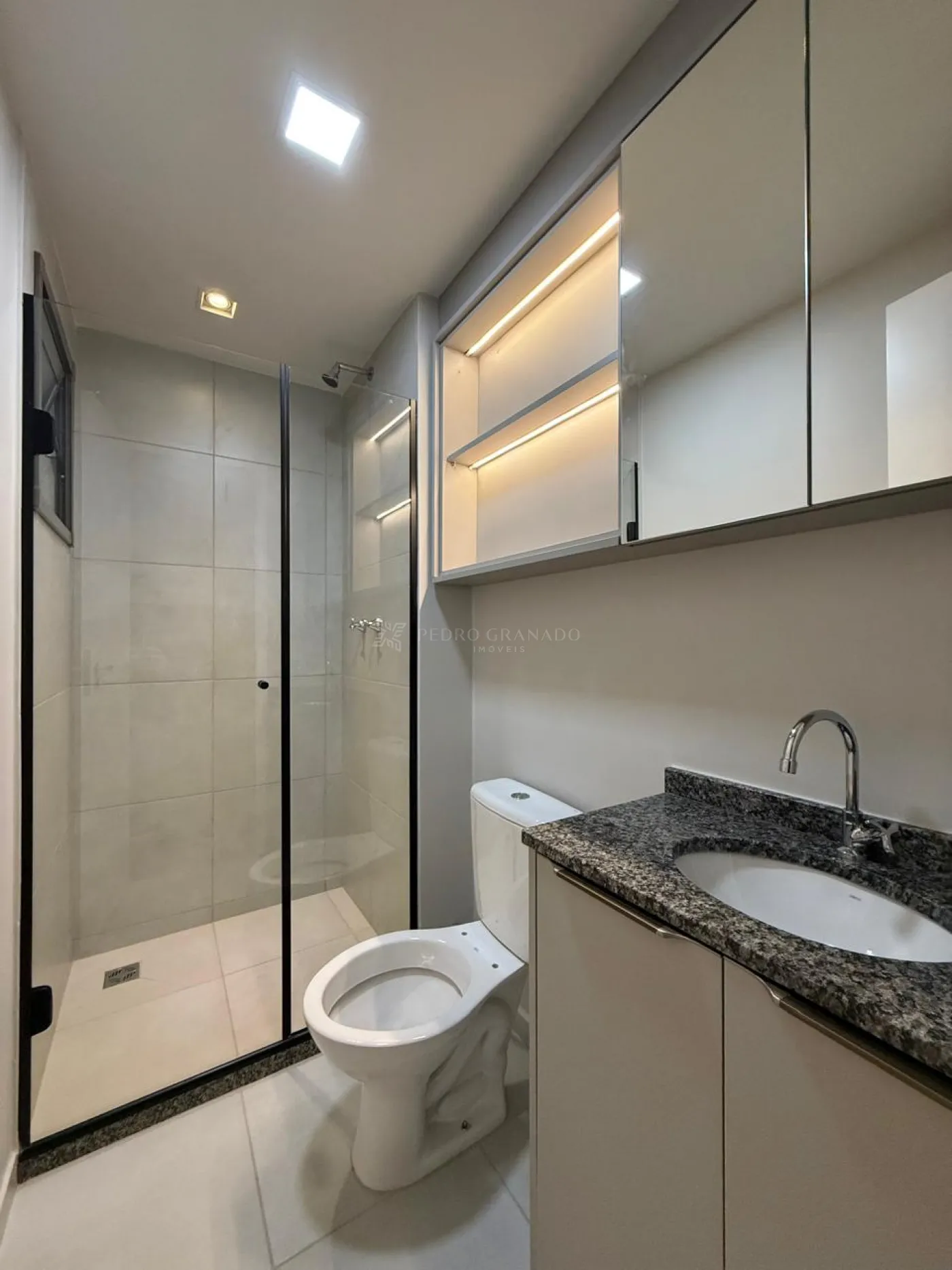 Banheiro social e suíte com box blindex e armários planejados