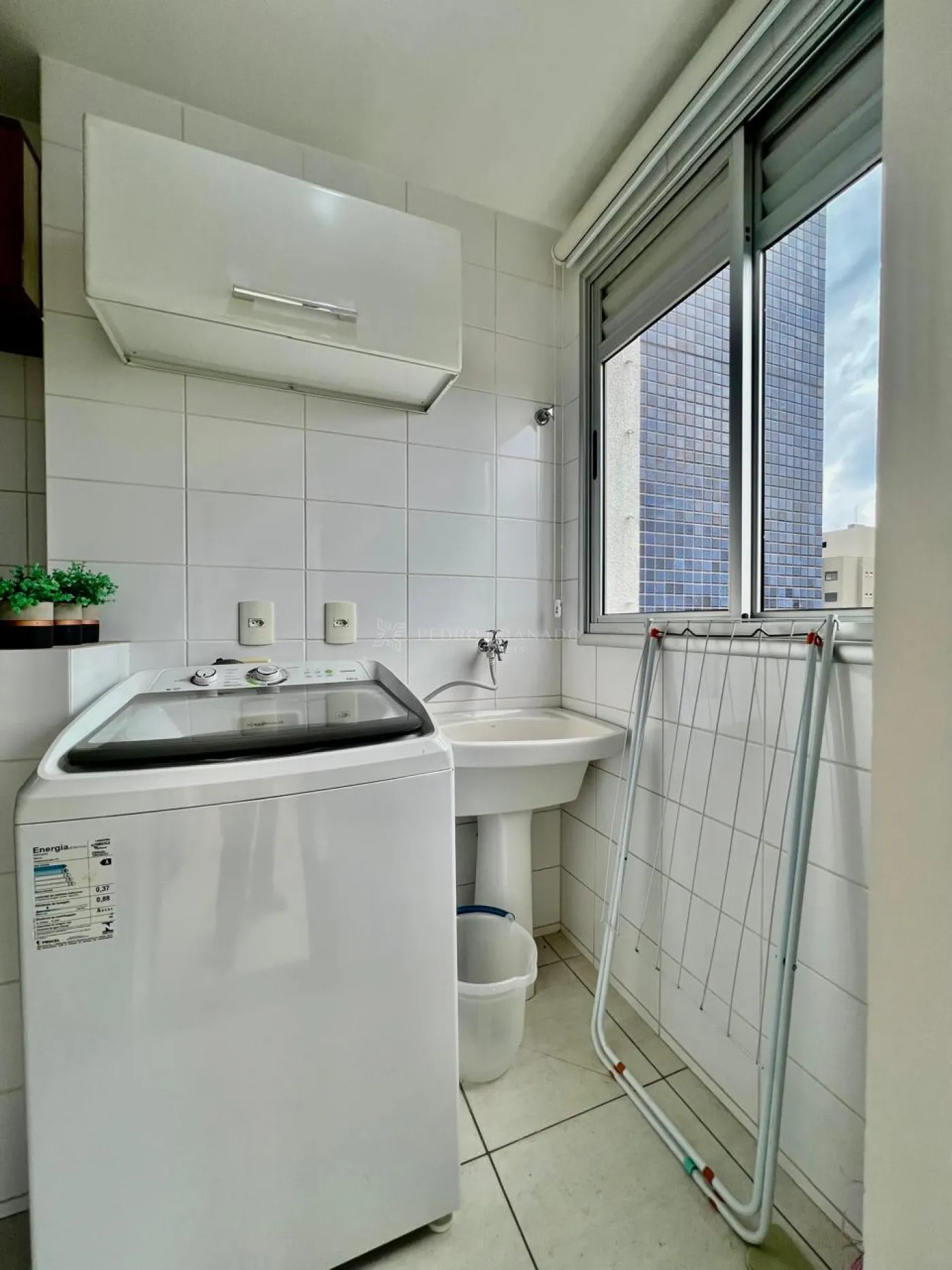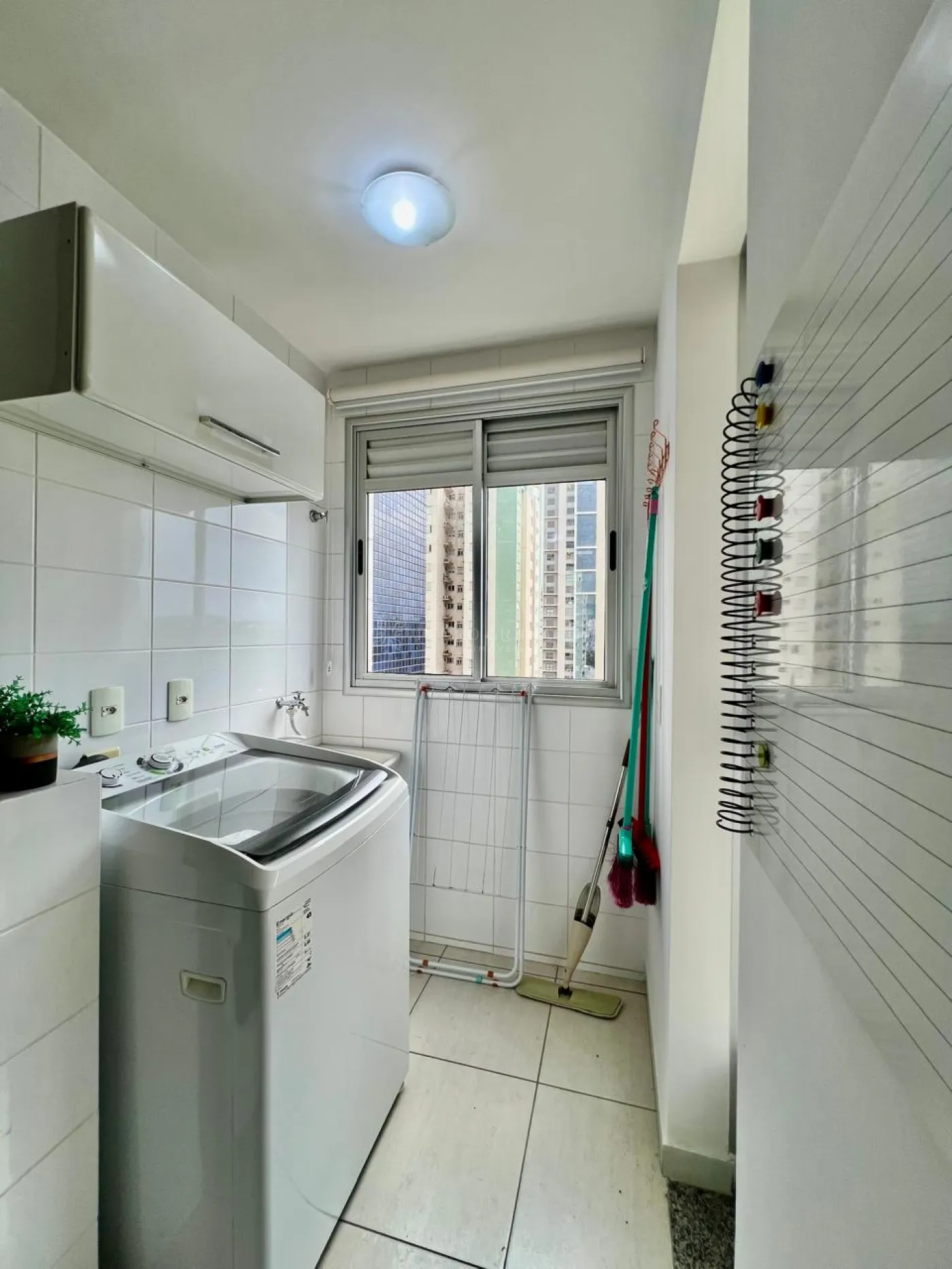 Área de serviço com armário na parede, máquina de lavar roupas e varal de chão.