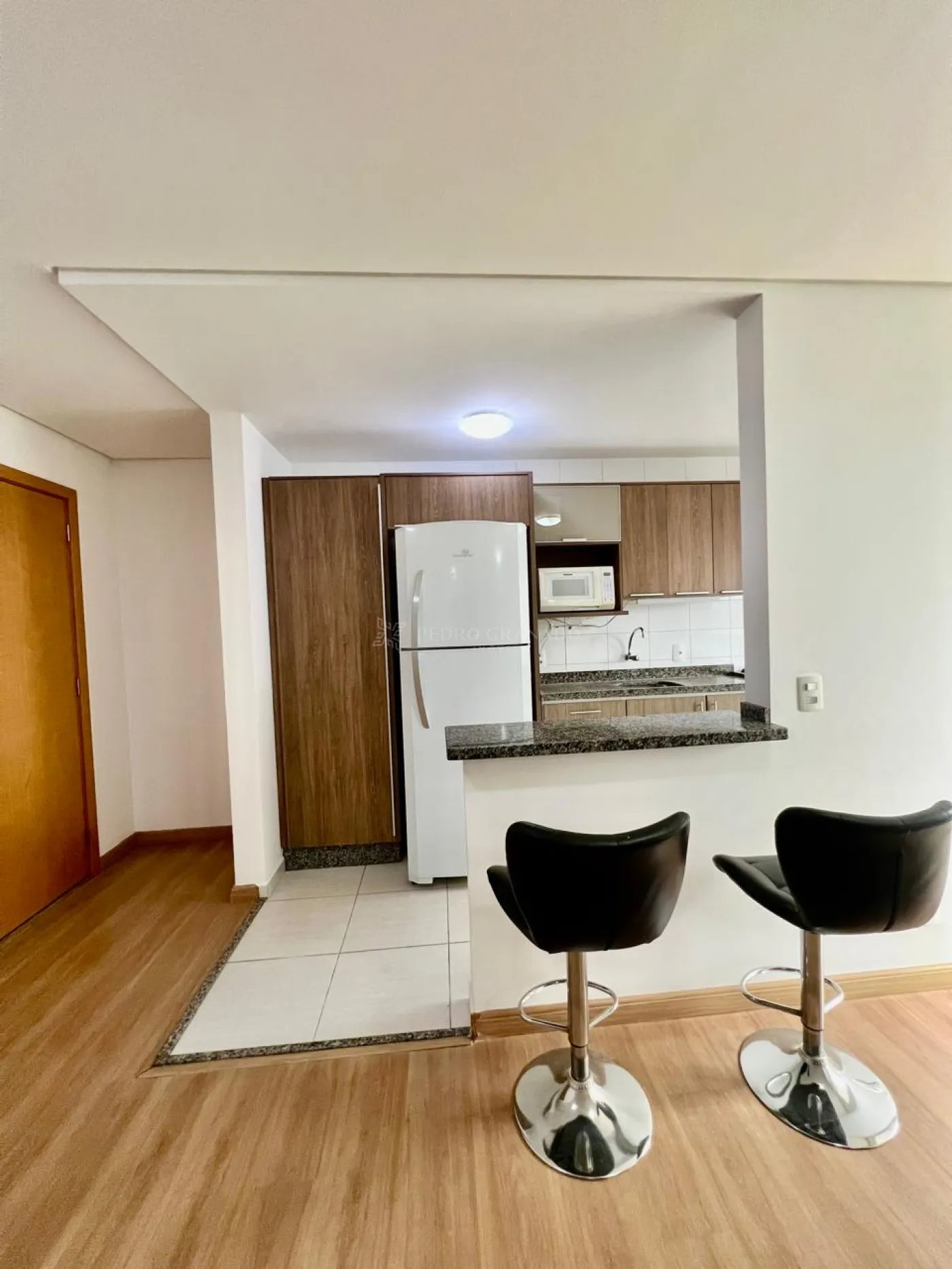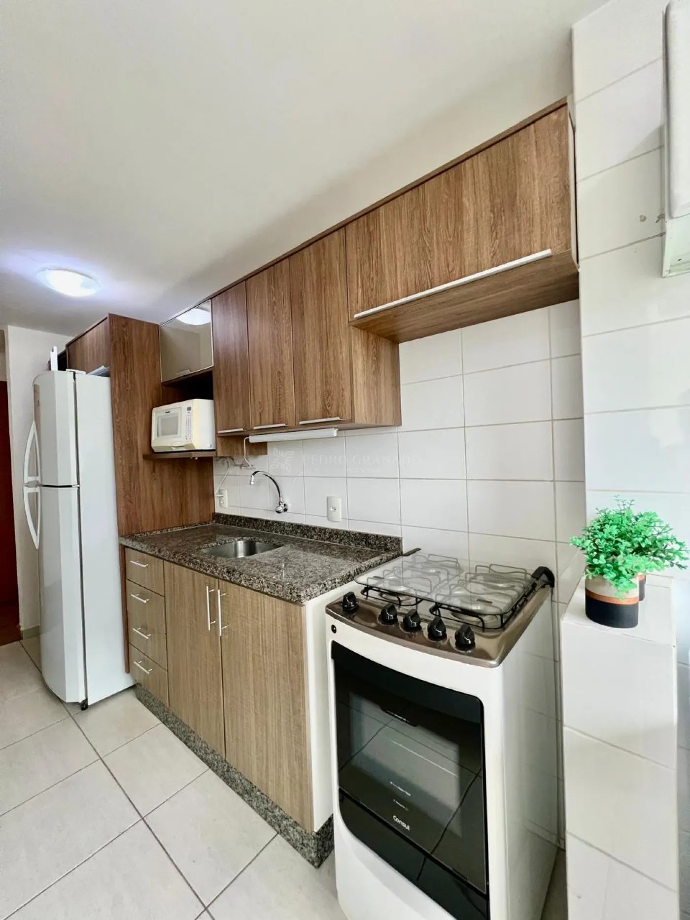Cozinha planejada com armários, pia em granito e cuba em inox, com fogão e forno à gás, geladeira frost free, forno micro-ondas, bancada em granito com 02 banquetas.