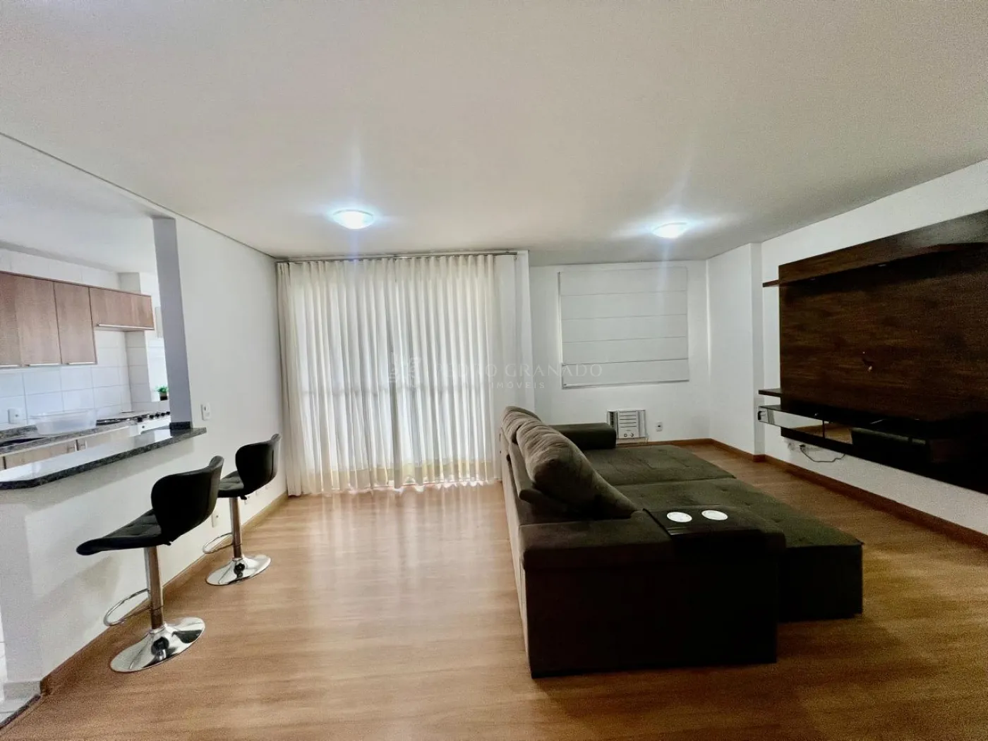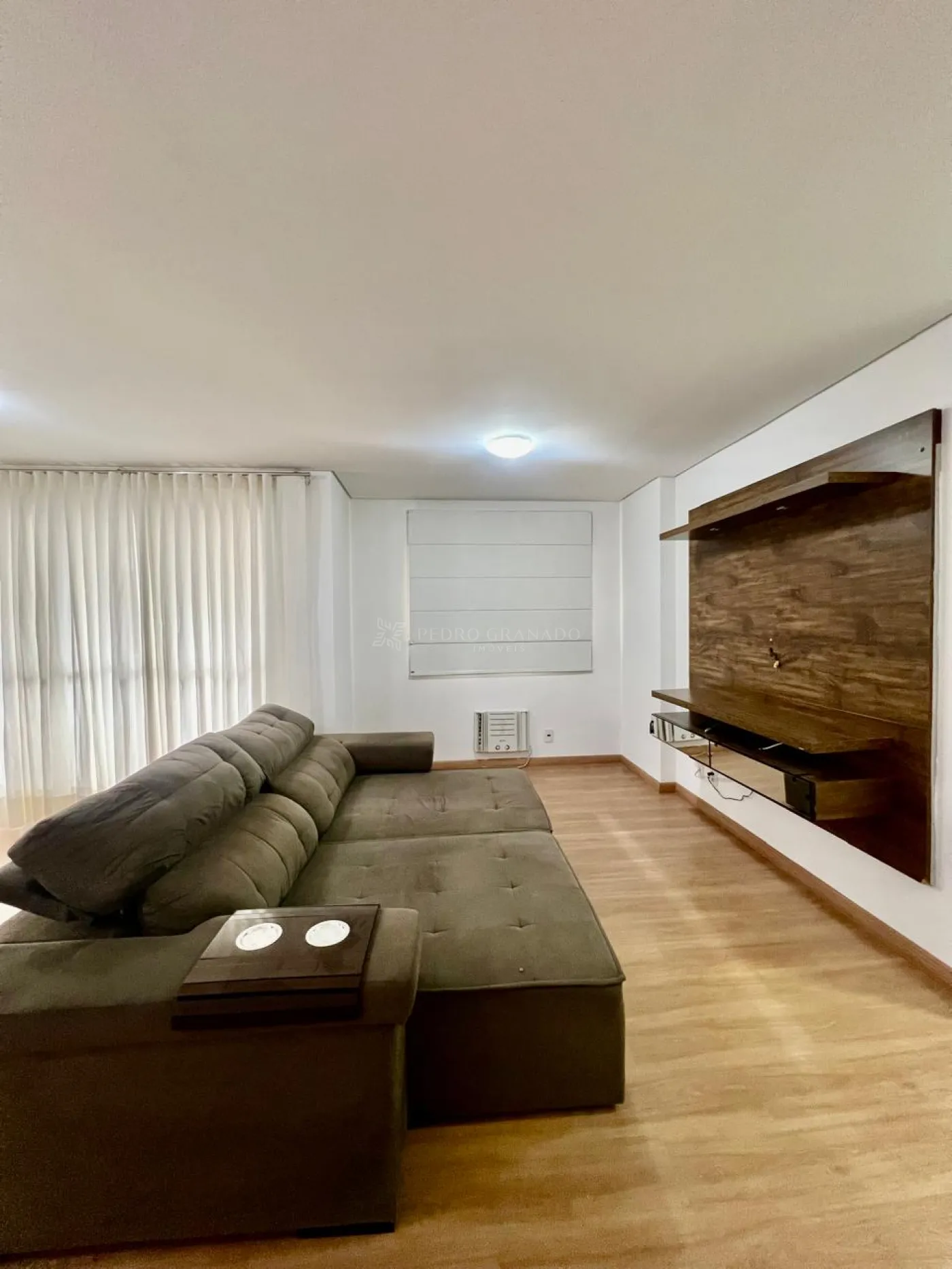 Sala ampla dois ambientes com sacada, painel e rack para televisão, sofá retrátil de dois lugares, ar condicionado, e persiana e cortina nas janelas.