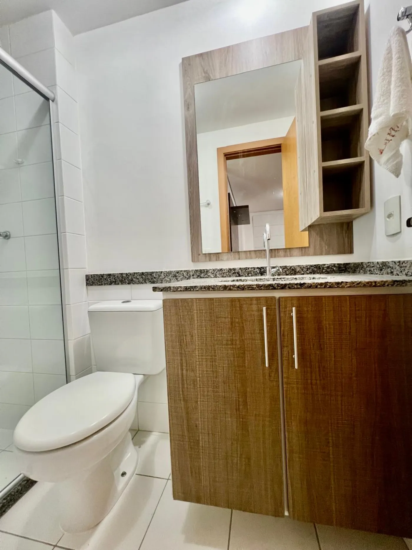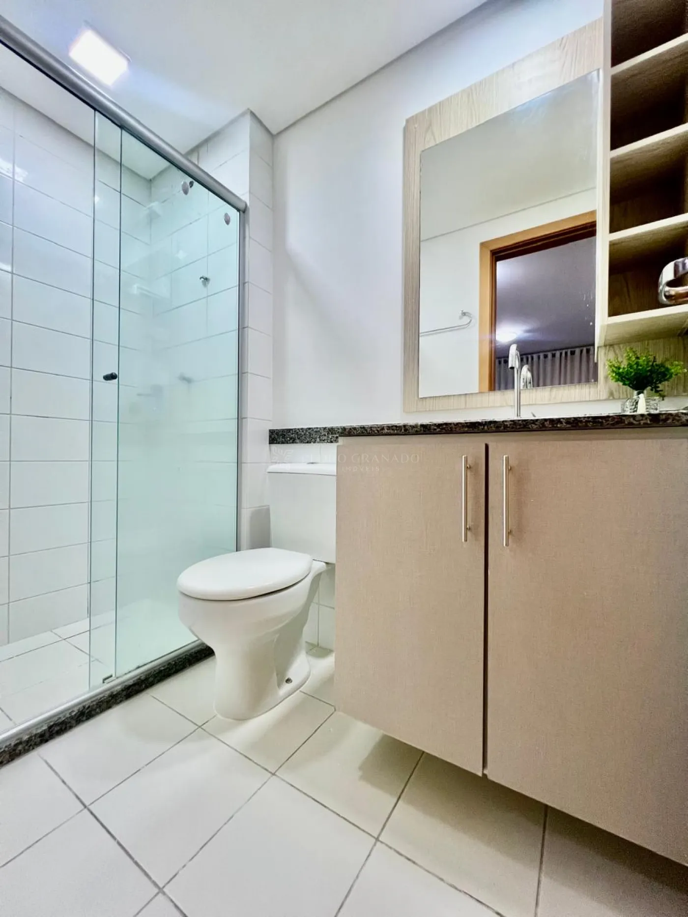 Banheiro social e da suíte com armário e box blindex.