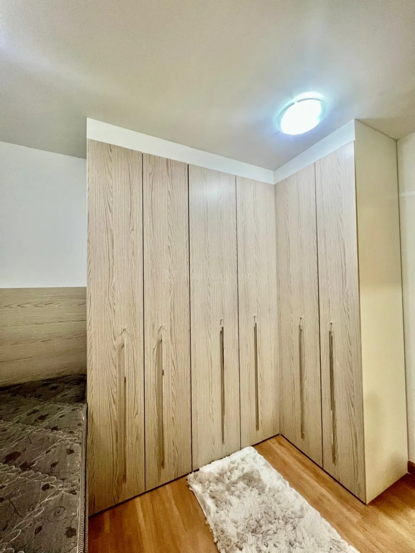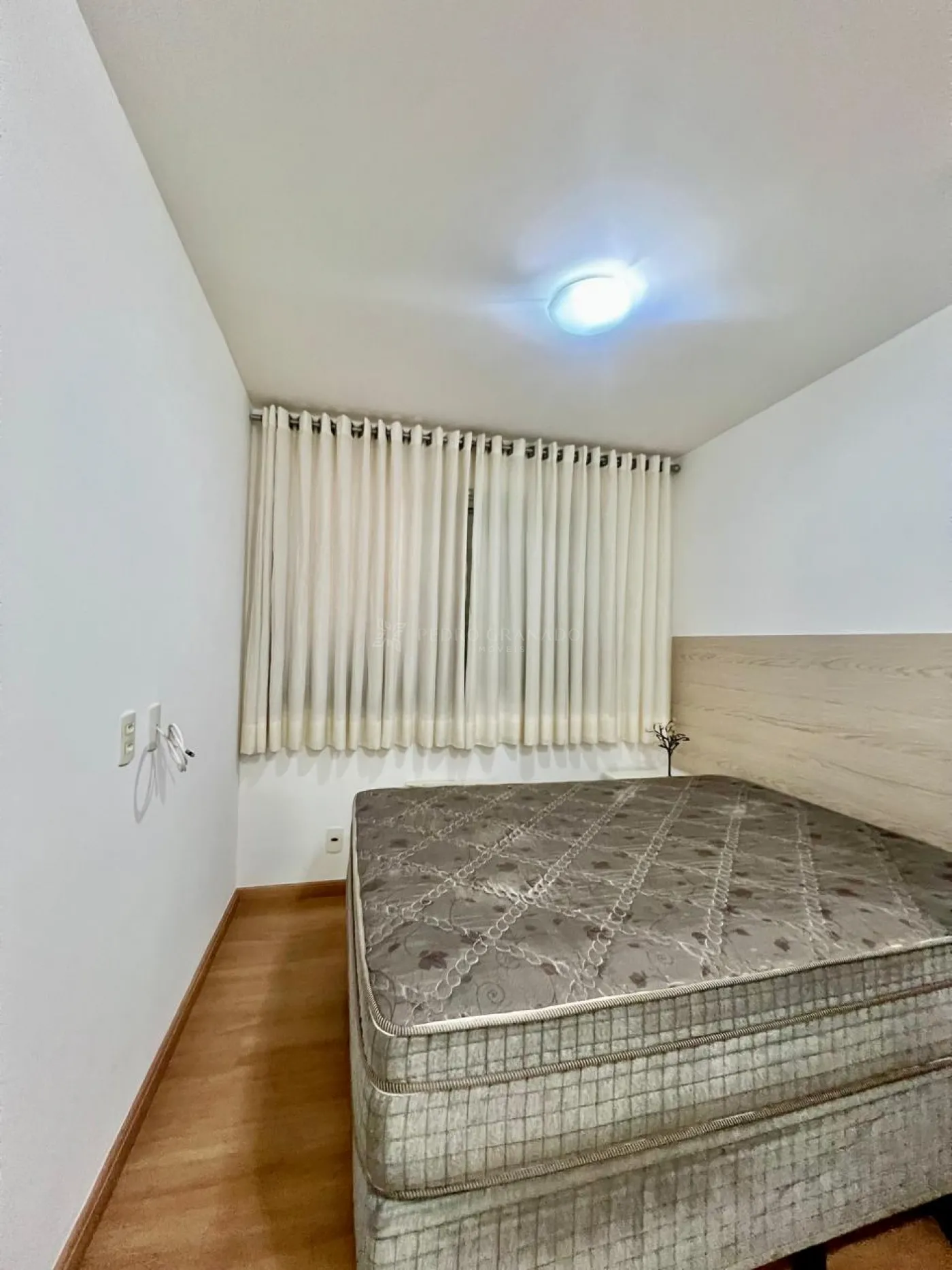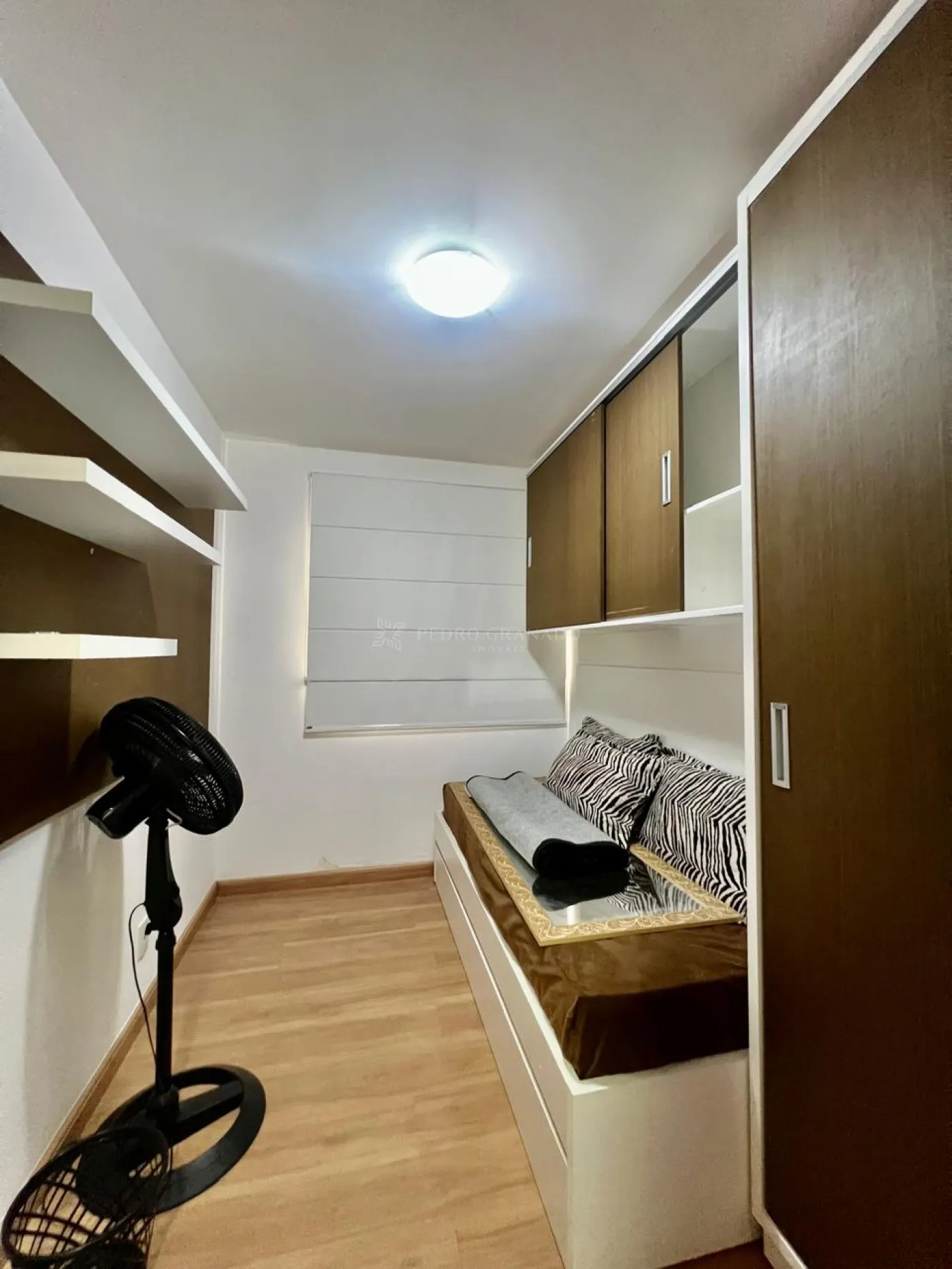 02 dormitórios, sendo um deles com sofá-cama, armários e ventilador de pé e uma suíte com guarda roupas, cama box de casal, cabeceira e cortina.