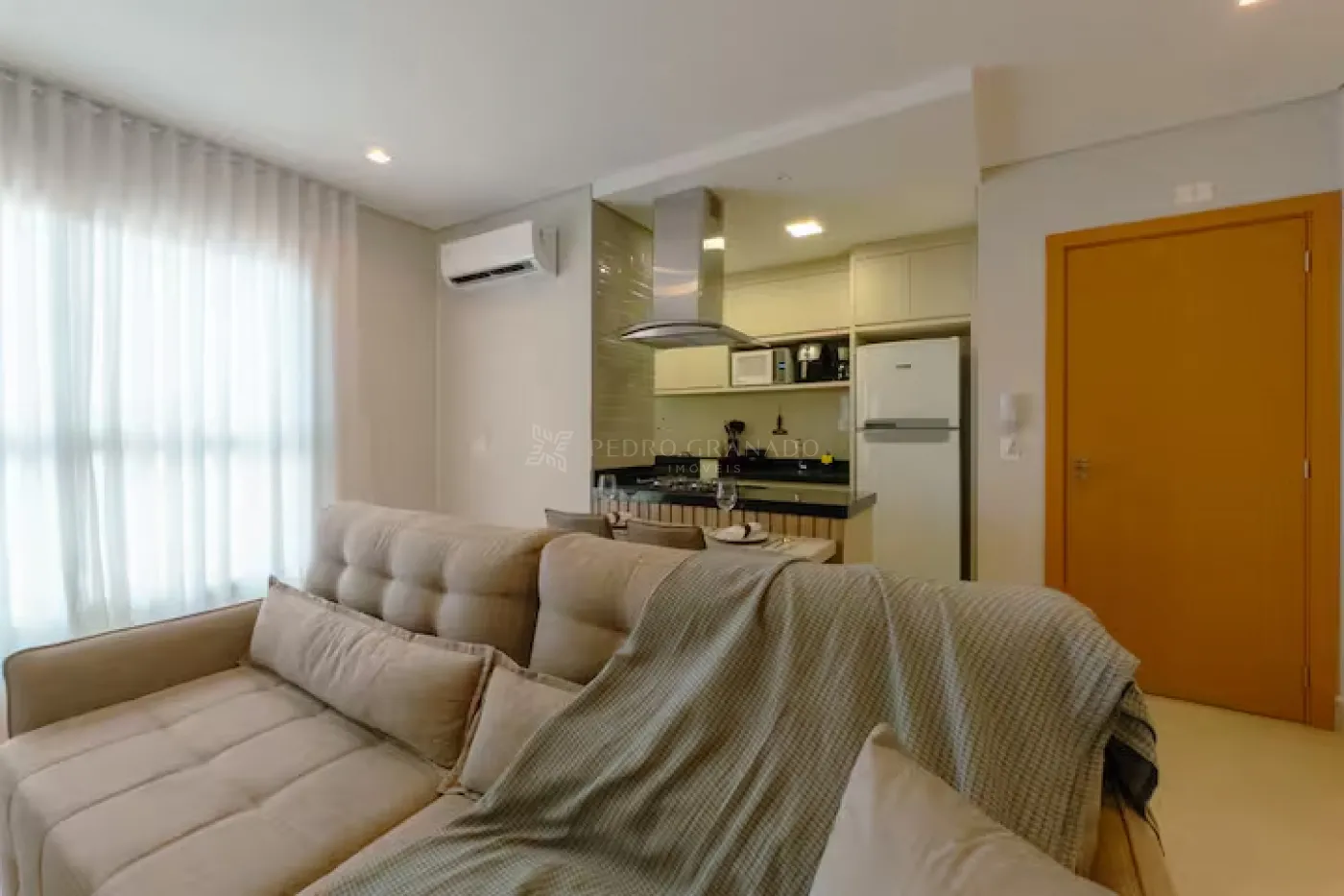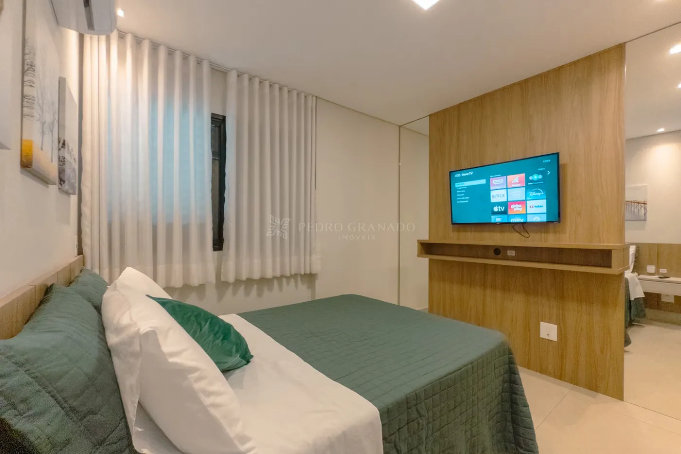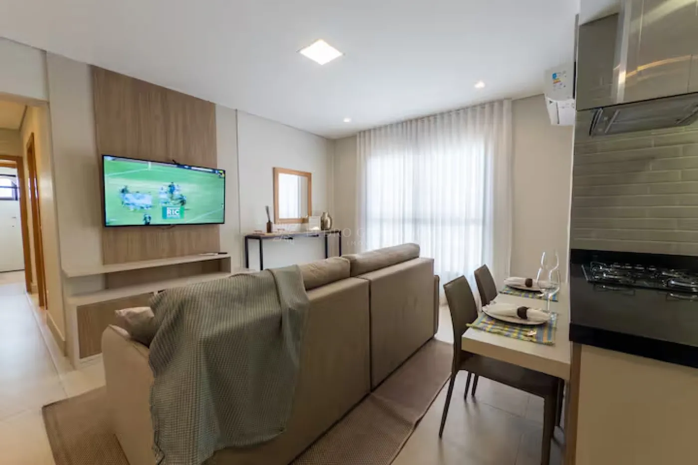 Com uma área útil de 58,00 m², este apartamento conta com sala de estar com sofá retrátil 02 lugares, painel com rack e TV e aparador, cozinha planejada cooktop, depurador, micro-ondas, forno elétrico e geladeira, 02 dormitórios, sendo 01 suíte com guarda-roupas, cama de casal, painel de Tv e ar-condicionado e 01 dormitório de solteiro com guarda-roupas e mesa de estudo, banheiro social e da suíte com armário e box blindex, área de serviço planejada com tanque e máquina de lavar e 01 vaga de garagem.