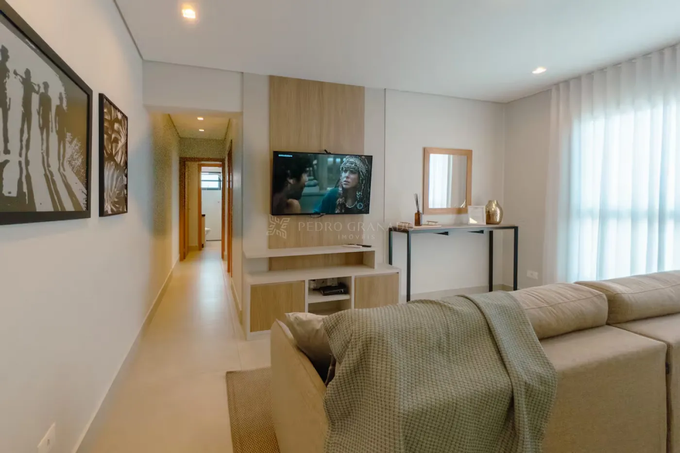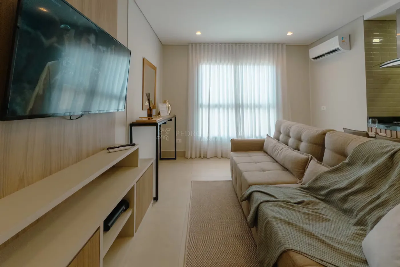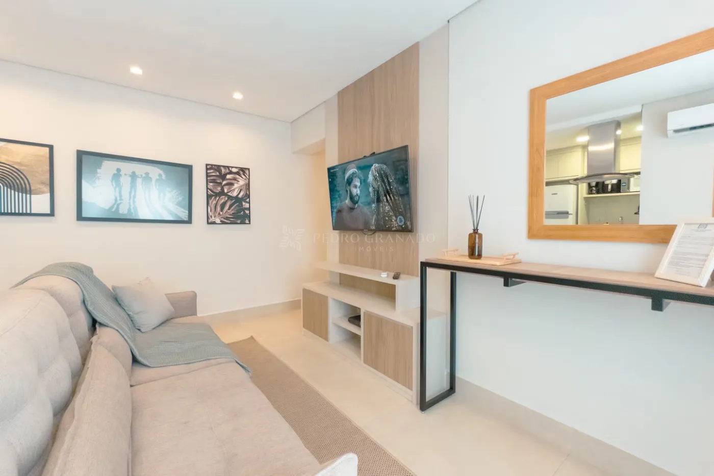 Com uma área útil de 58,00 m², este apartamento conta com sala de estar com sofá retrátil 02 lugares, painel com rack e TV e aparador, cozinha planejada cooktop, depurador, micro-ondas, forno elétrico e geladeira, 02 dormitórios, sendo 01 suíte com guarda-roupas, cama de casal, painel de Tv e ar-condicionado e 01 dormitório de solteiro com guarda-roupas e mesa de estudo, banheiro social e da suíte com armário e box blindex, área de serviço planejada com tanque e máquina de lavar e 01 vaga de garagem.