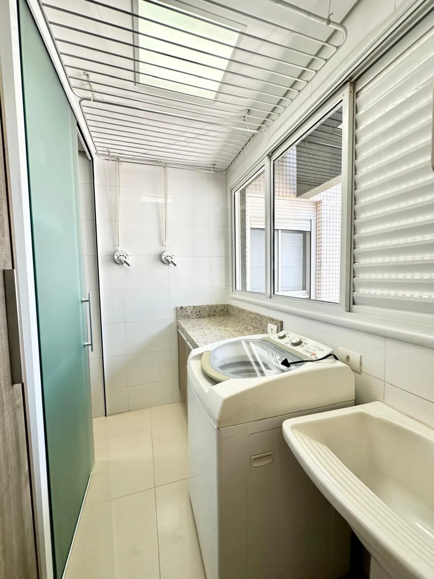 Área de serviço com armários, varal de teto e maquina de lavar;