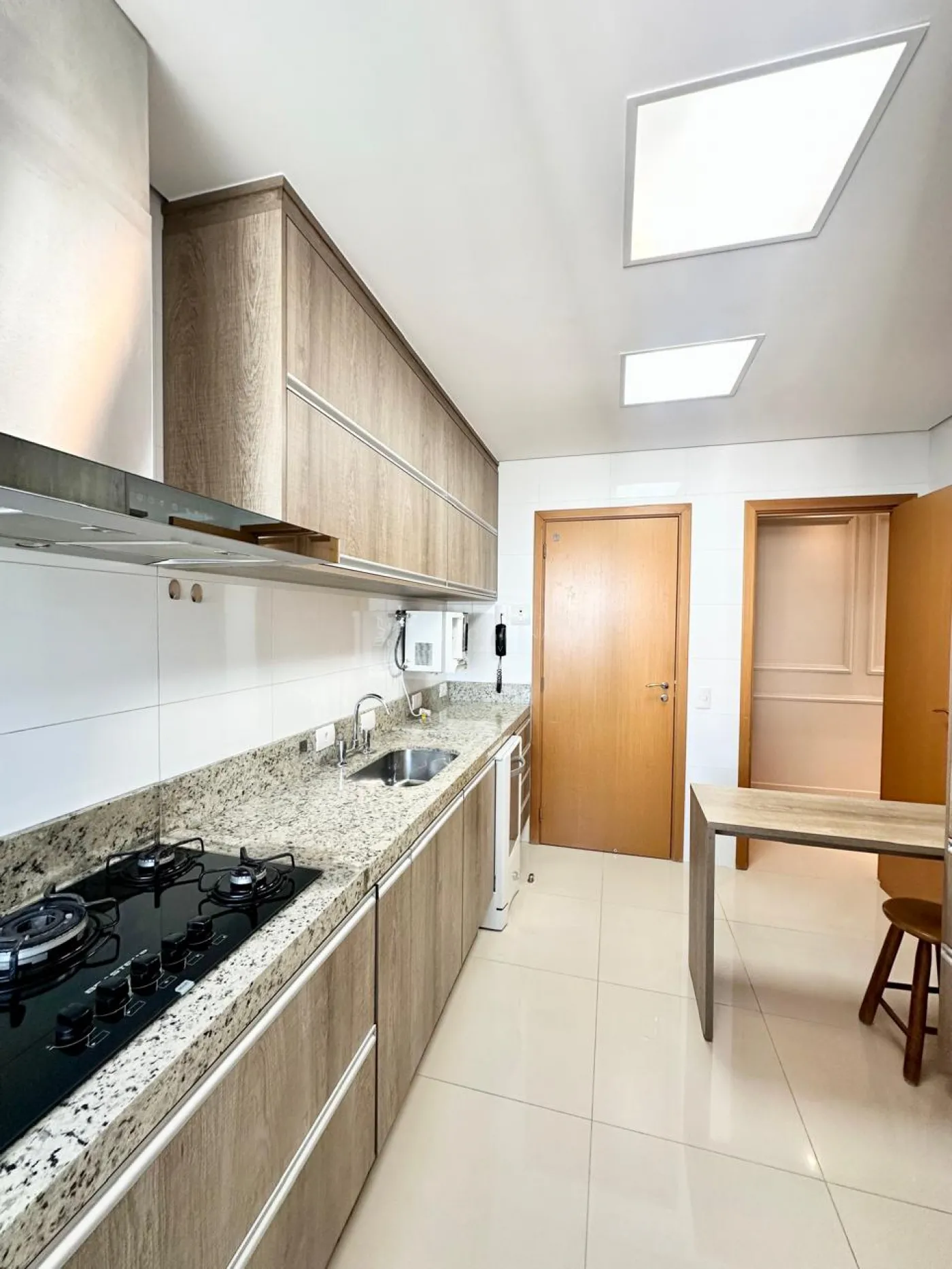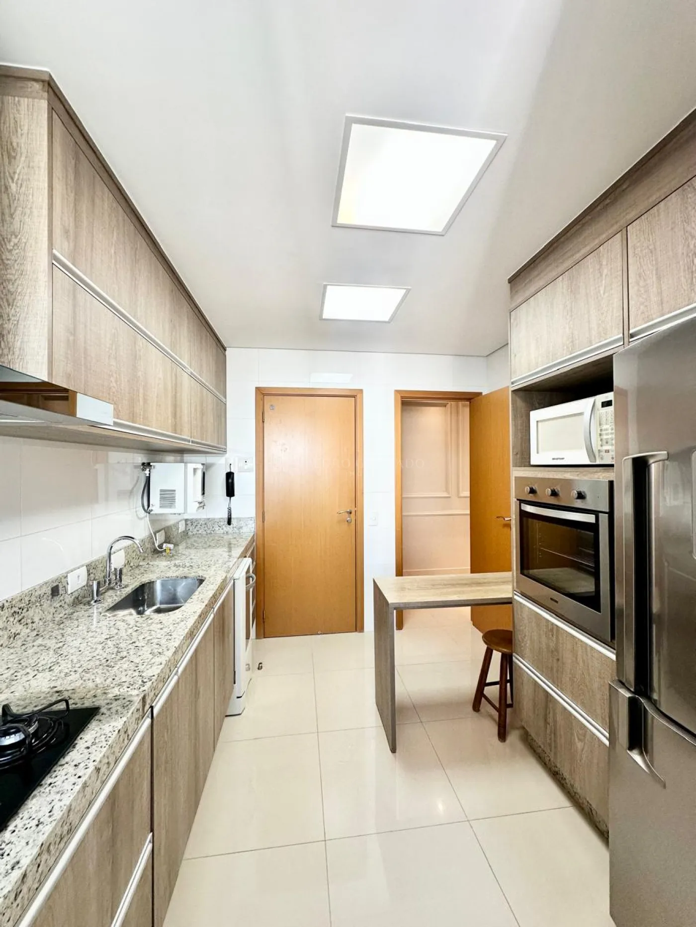Cozinha com armários planejados, cooktop, coifa, forno, geladeira, lava louça, microondas, purificador de água;