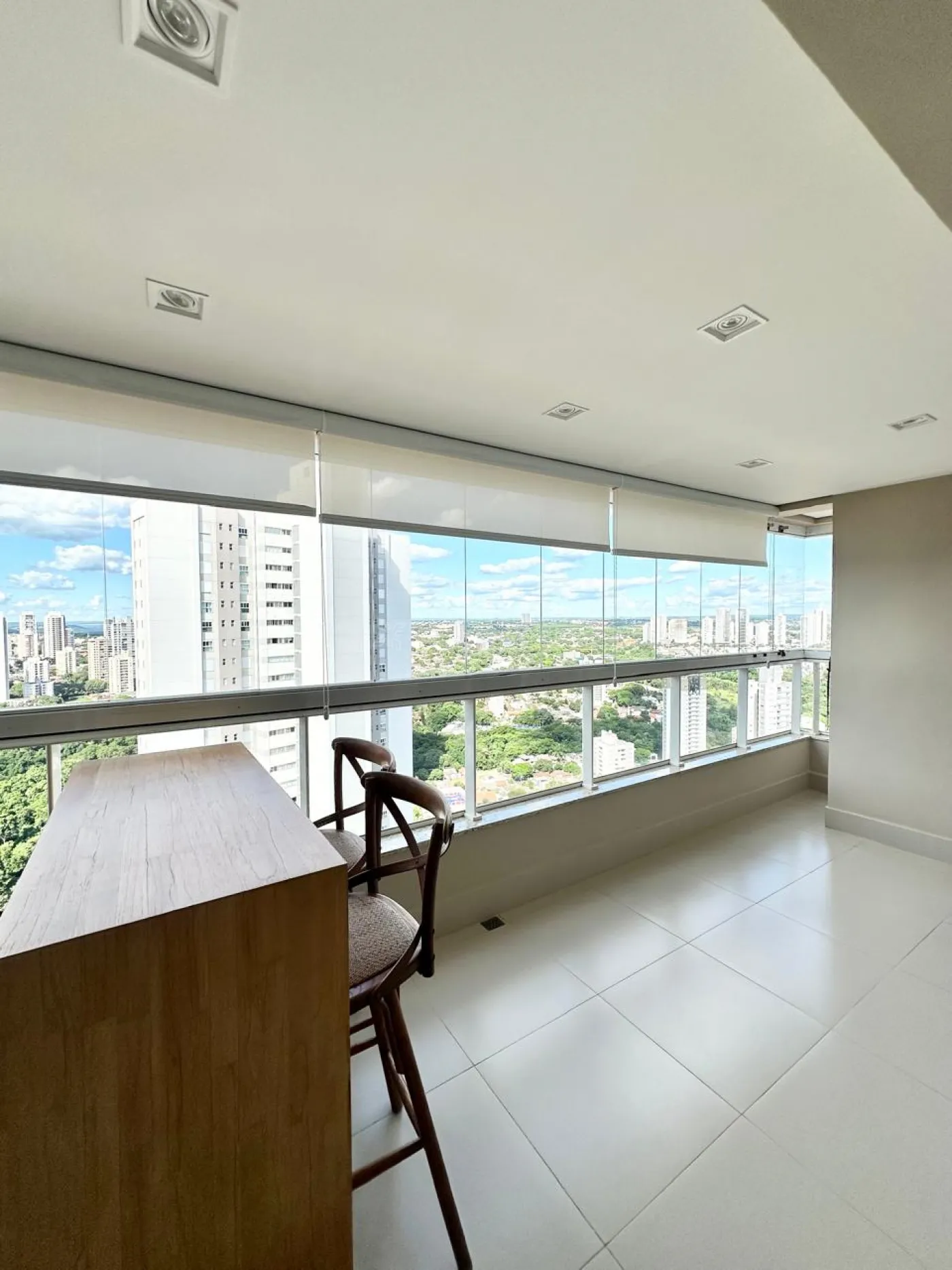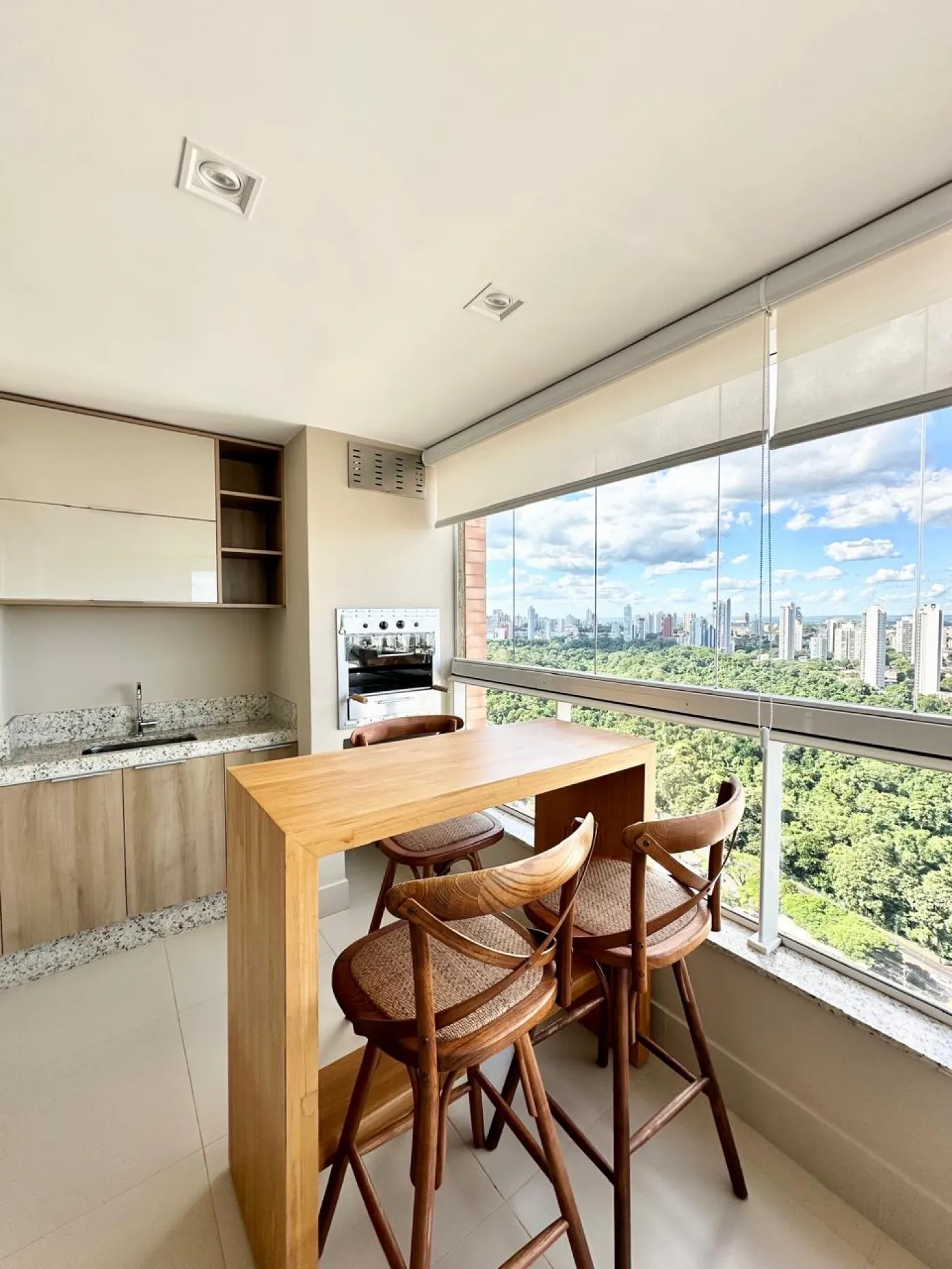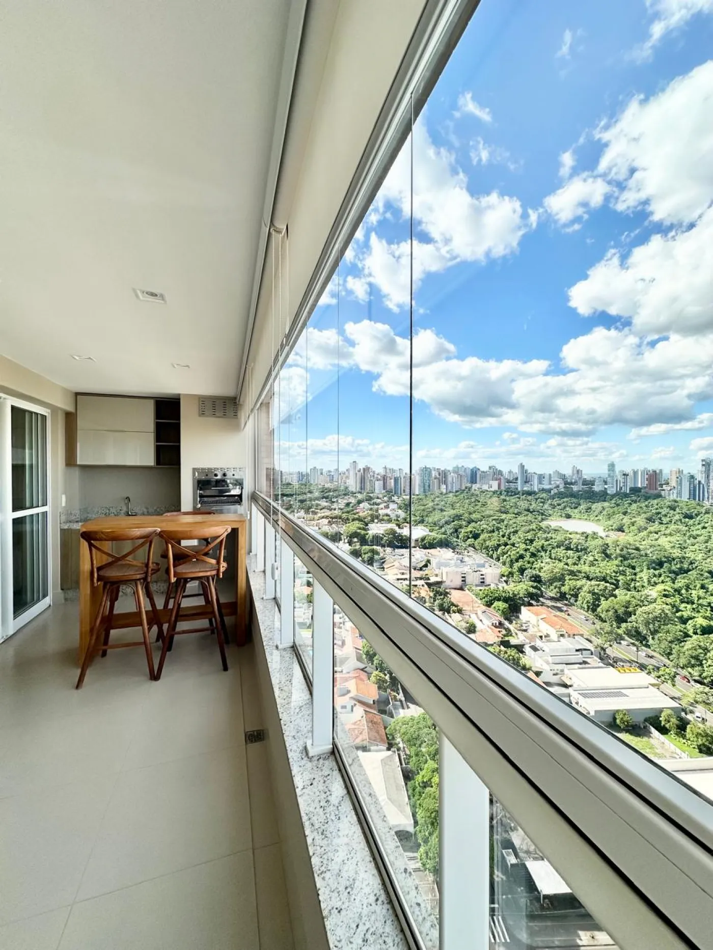 Sacada integrada com fechamento em blindex, churrasqueira, banquetas;