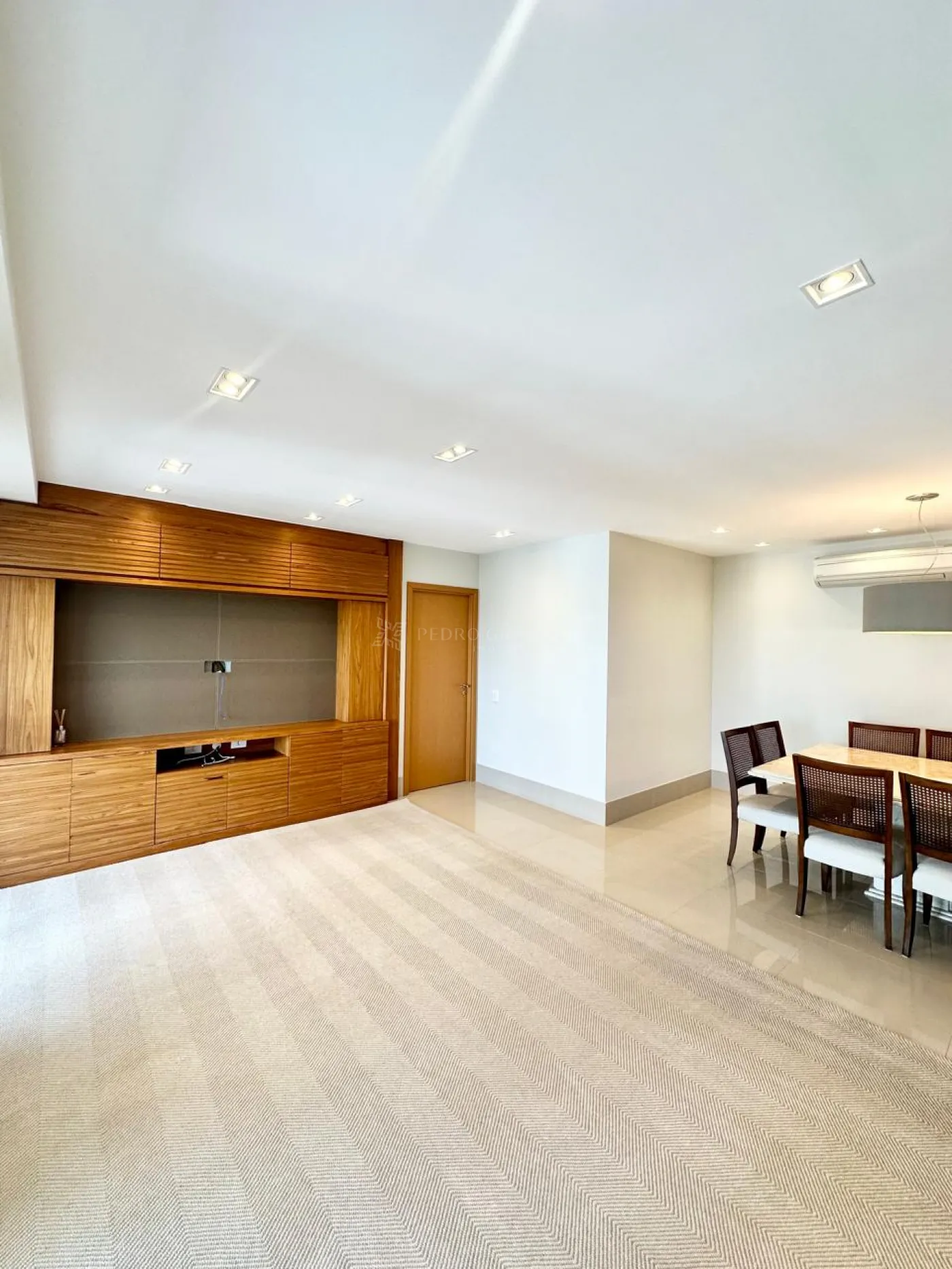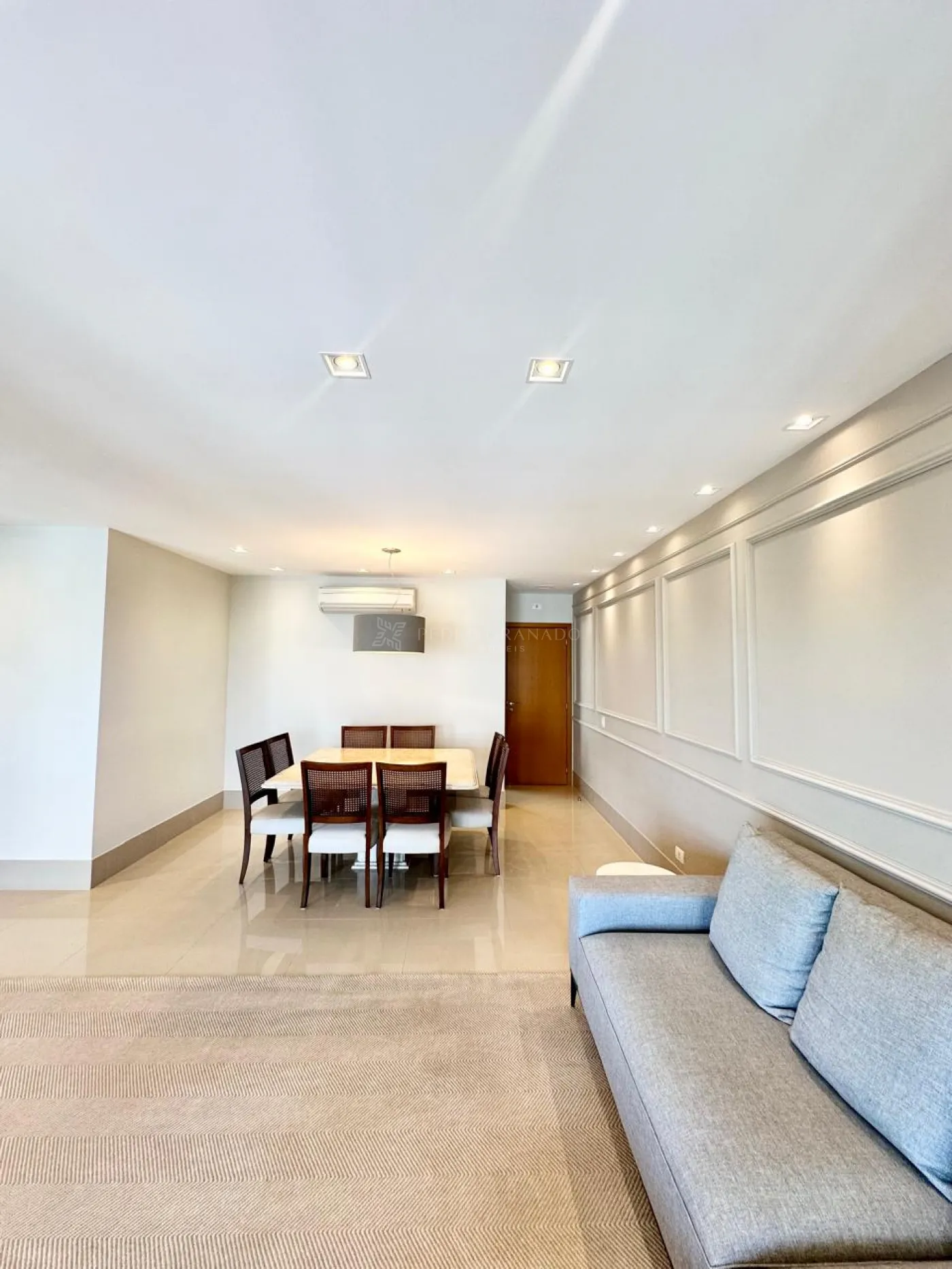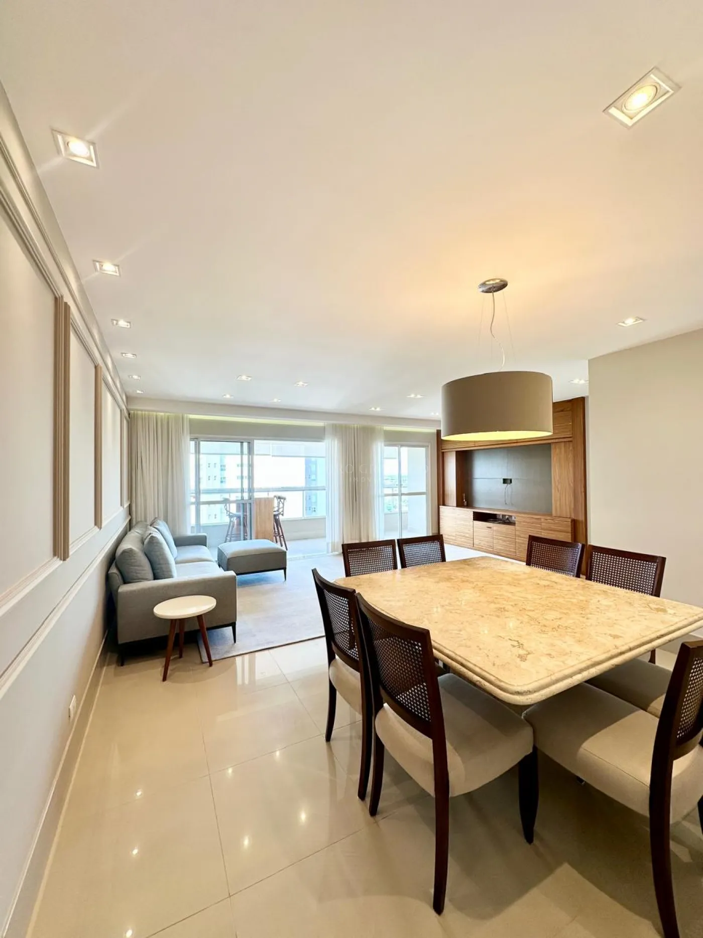 Sala com 02 ambientes, sofá, ar-condicionado, painel de TV, mesa 08 lugares, ar condicionado, tapete, belíssima iluminação;