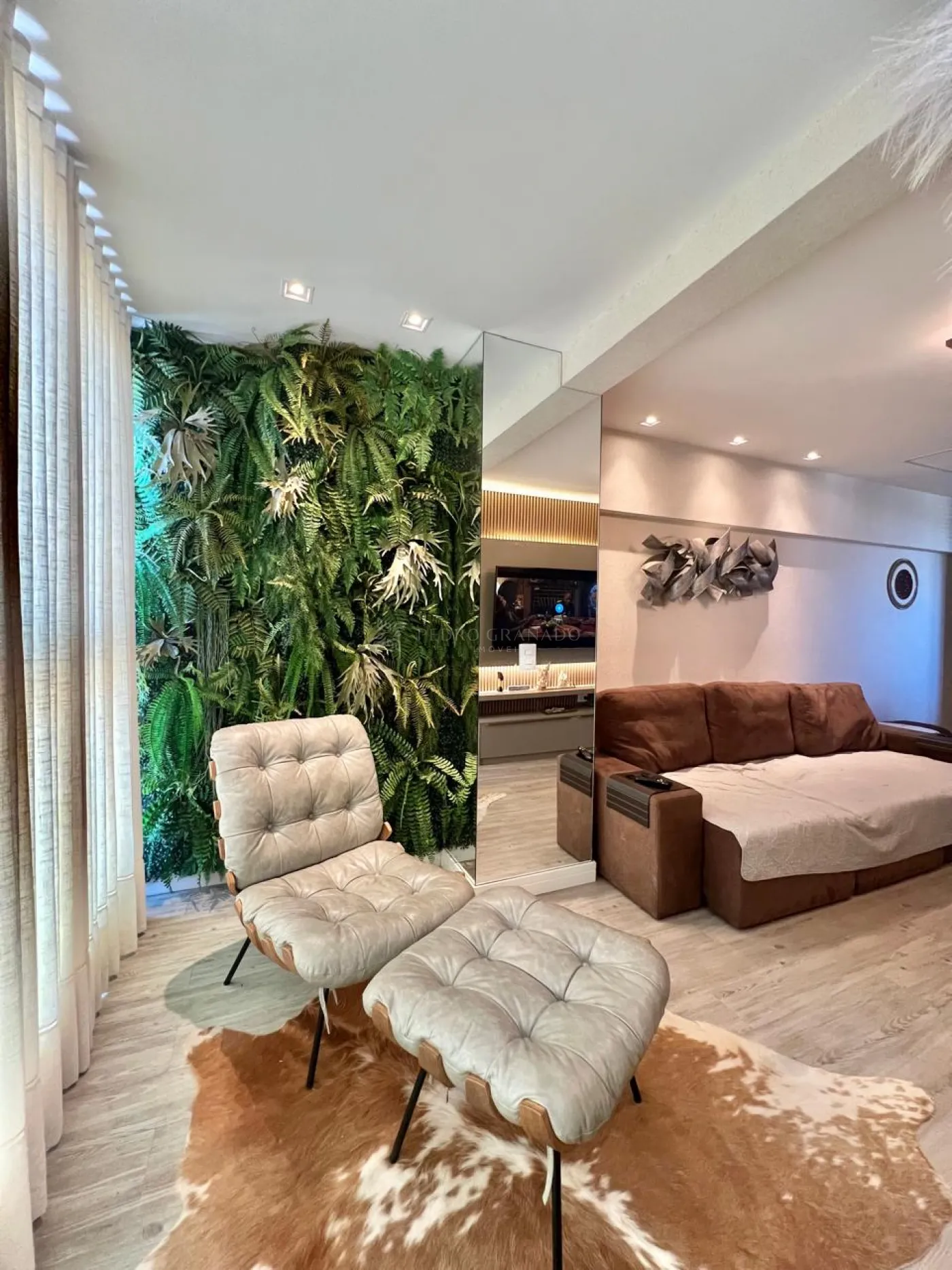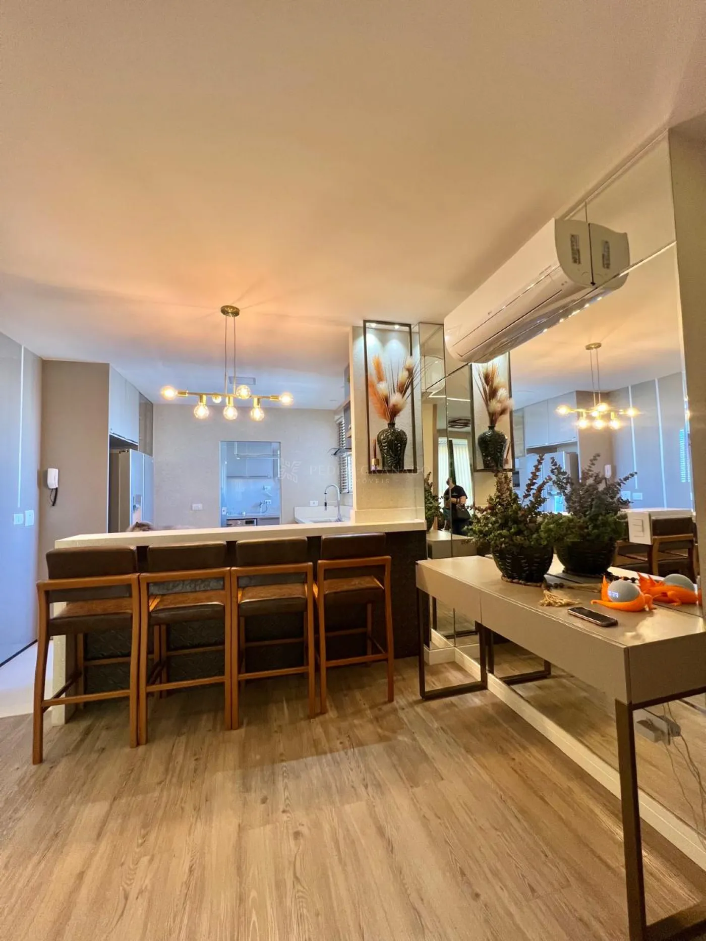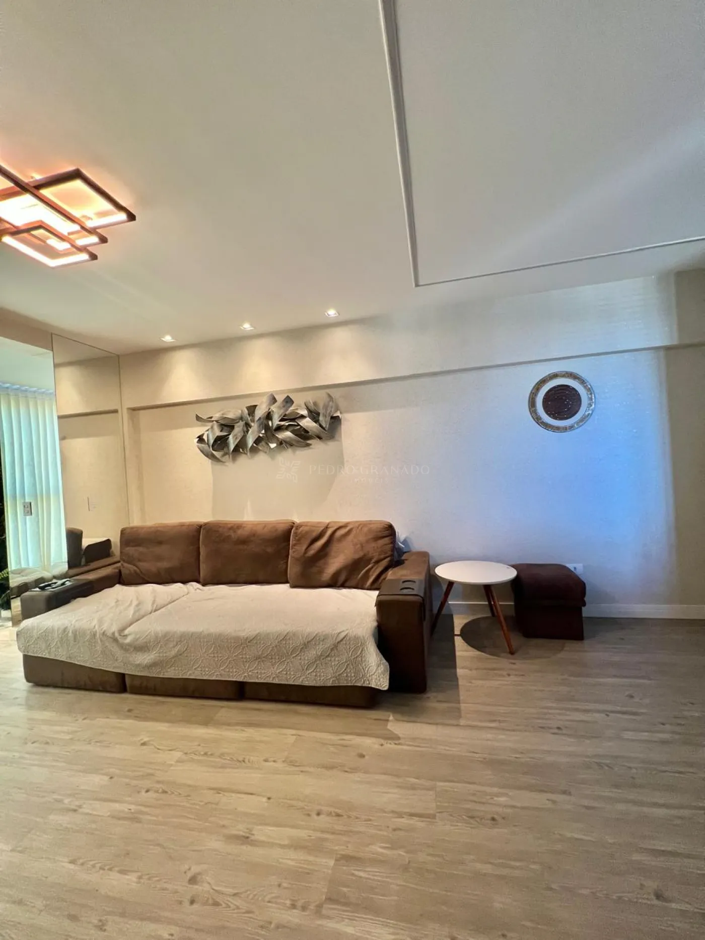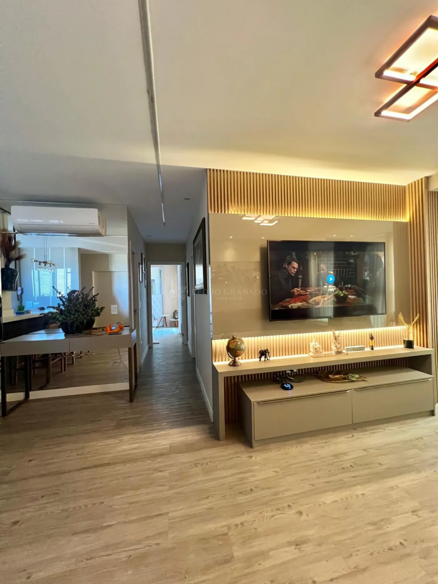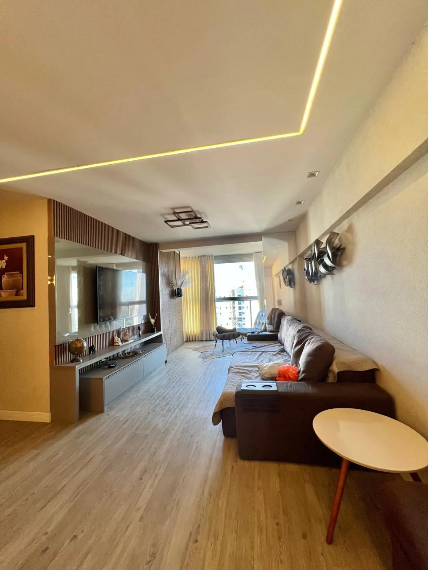 Com uma área útil de 101,00 m², este apartamento conta com uma sala dois ambientes, que integra com a cozinha, aparador, sofá retrátil com 03 lugares, lindo painel e rack para televisão, parede ripada, aconchegante espriguiçadeira e ar condicionado.