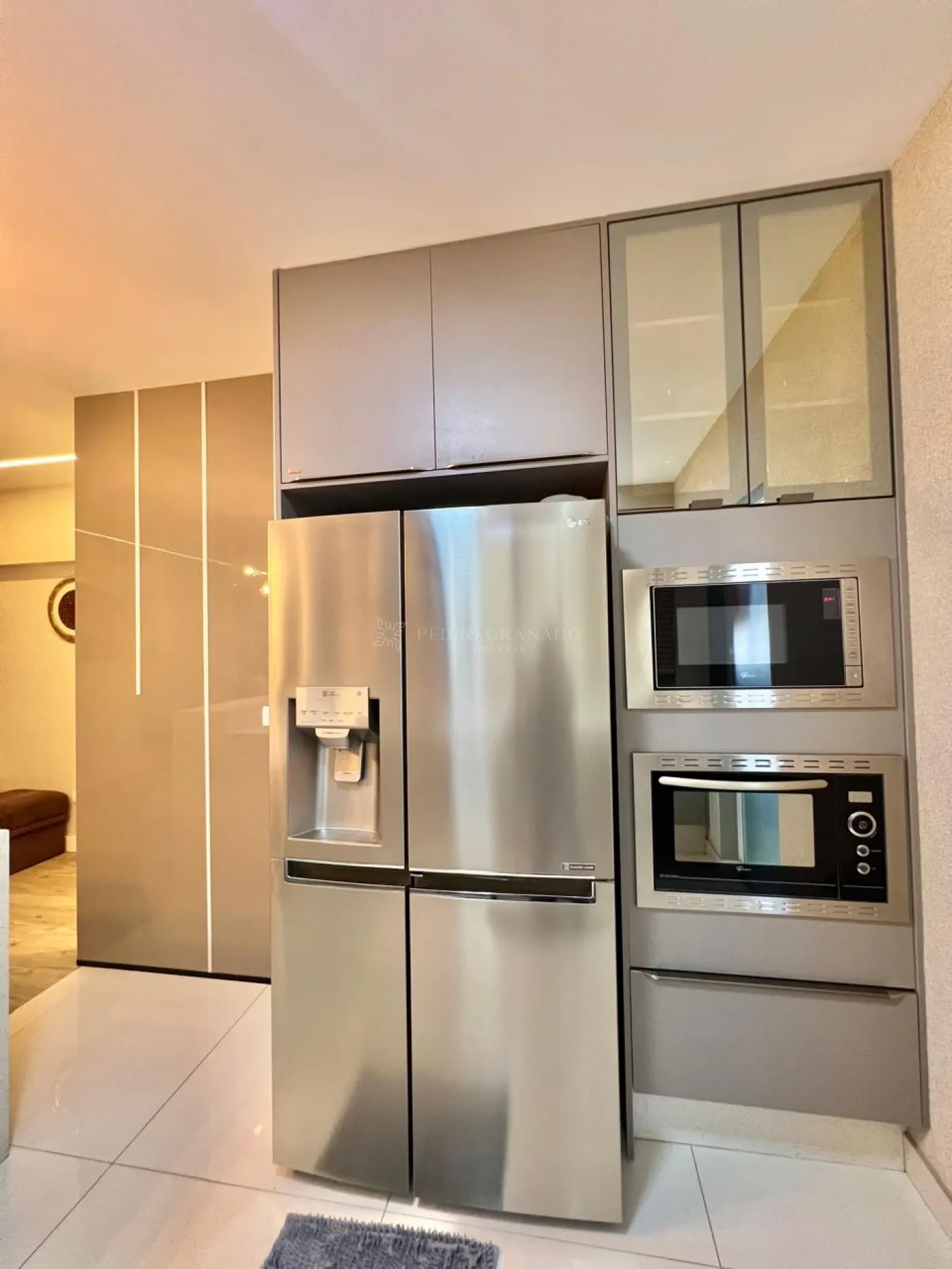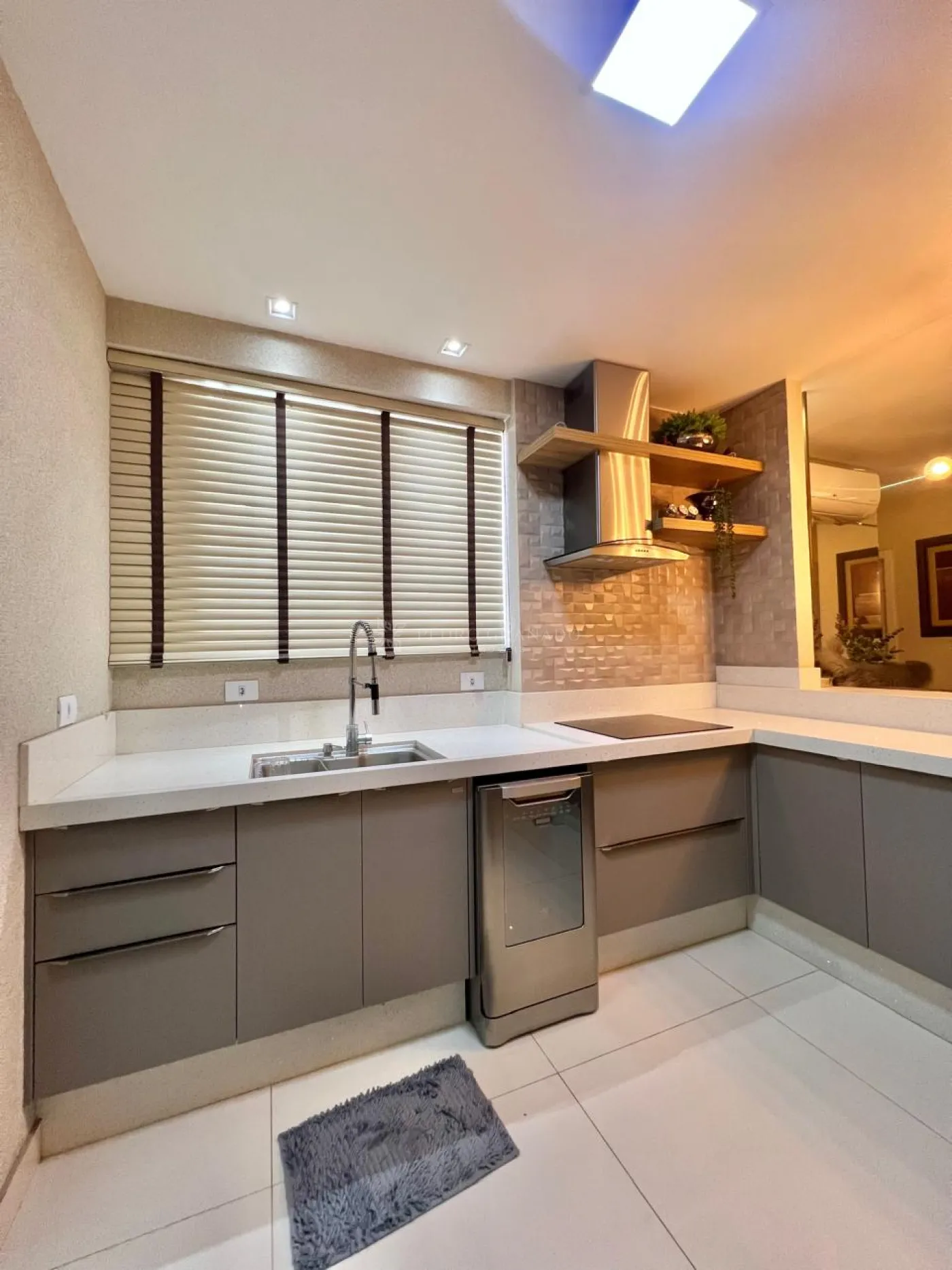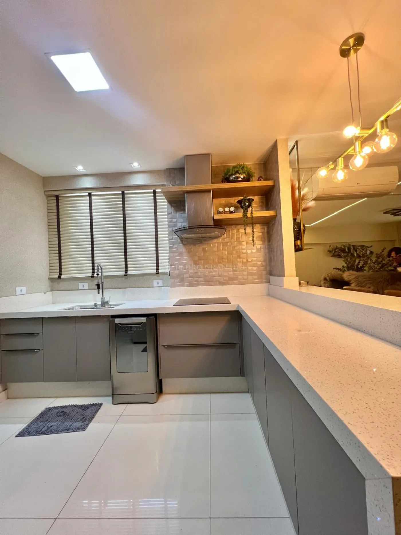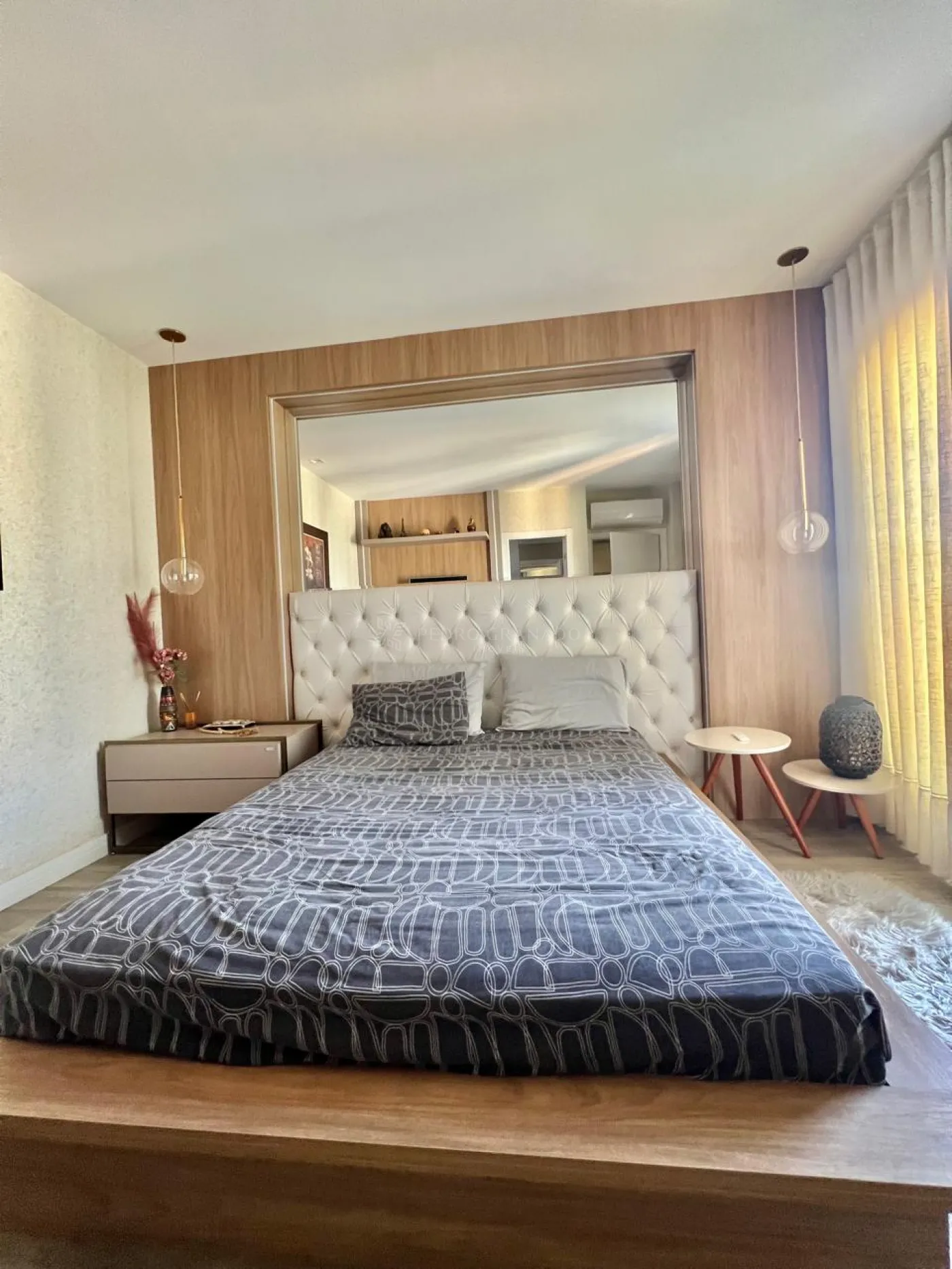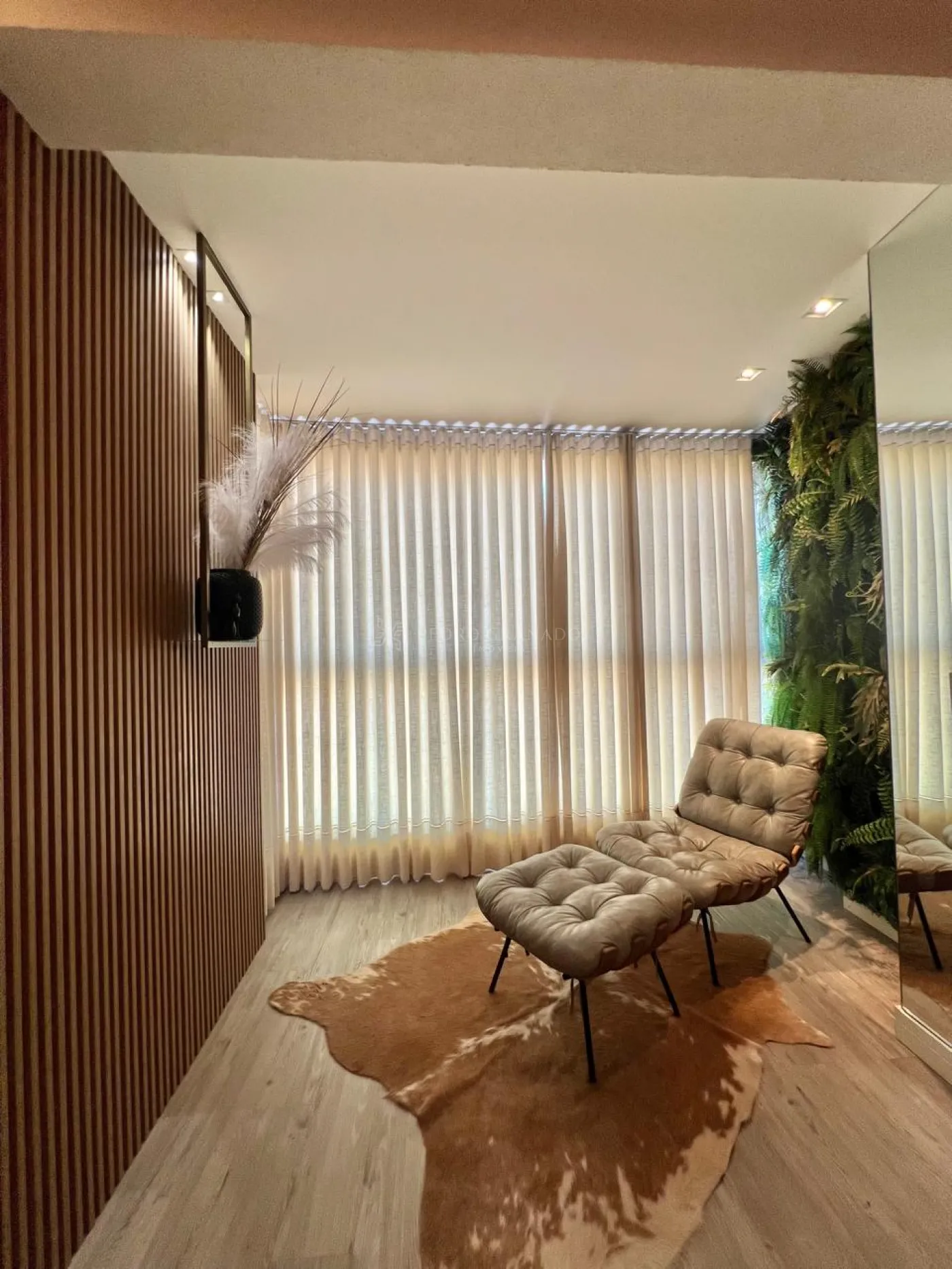 Com uma área útil de 101,00 m², este apartamento conta com uma sala dois ambientes, que integra com a cozinha, aparador, sofá retrátil com 03 lugares, lindo painel e rack para televisão, parede ripada, aconchegante espriguiçadeira e ar condicionado.
