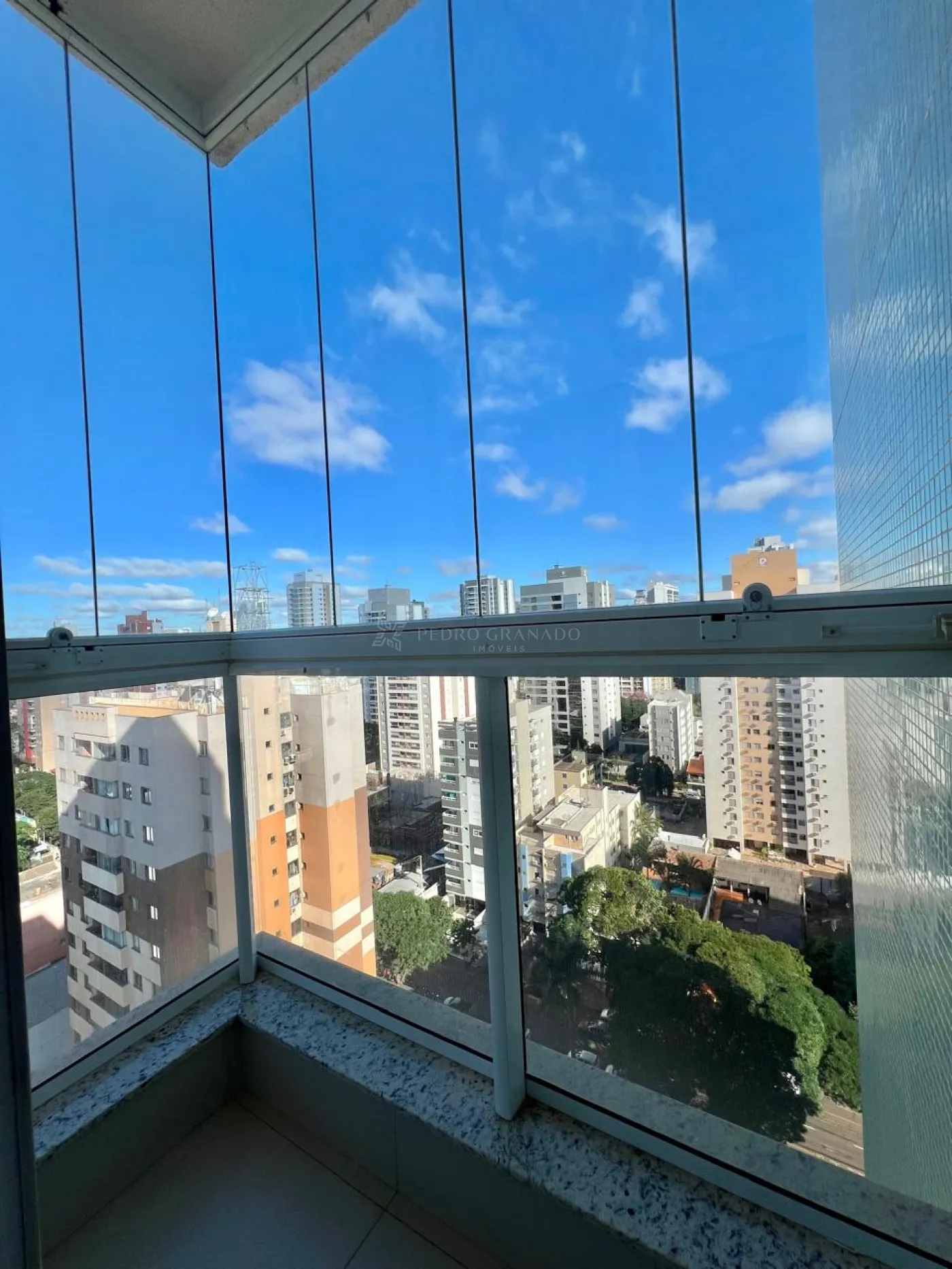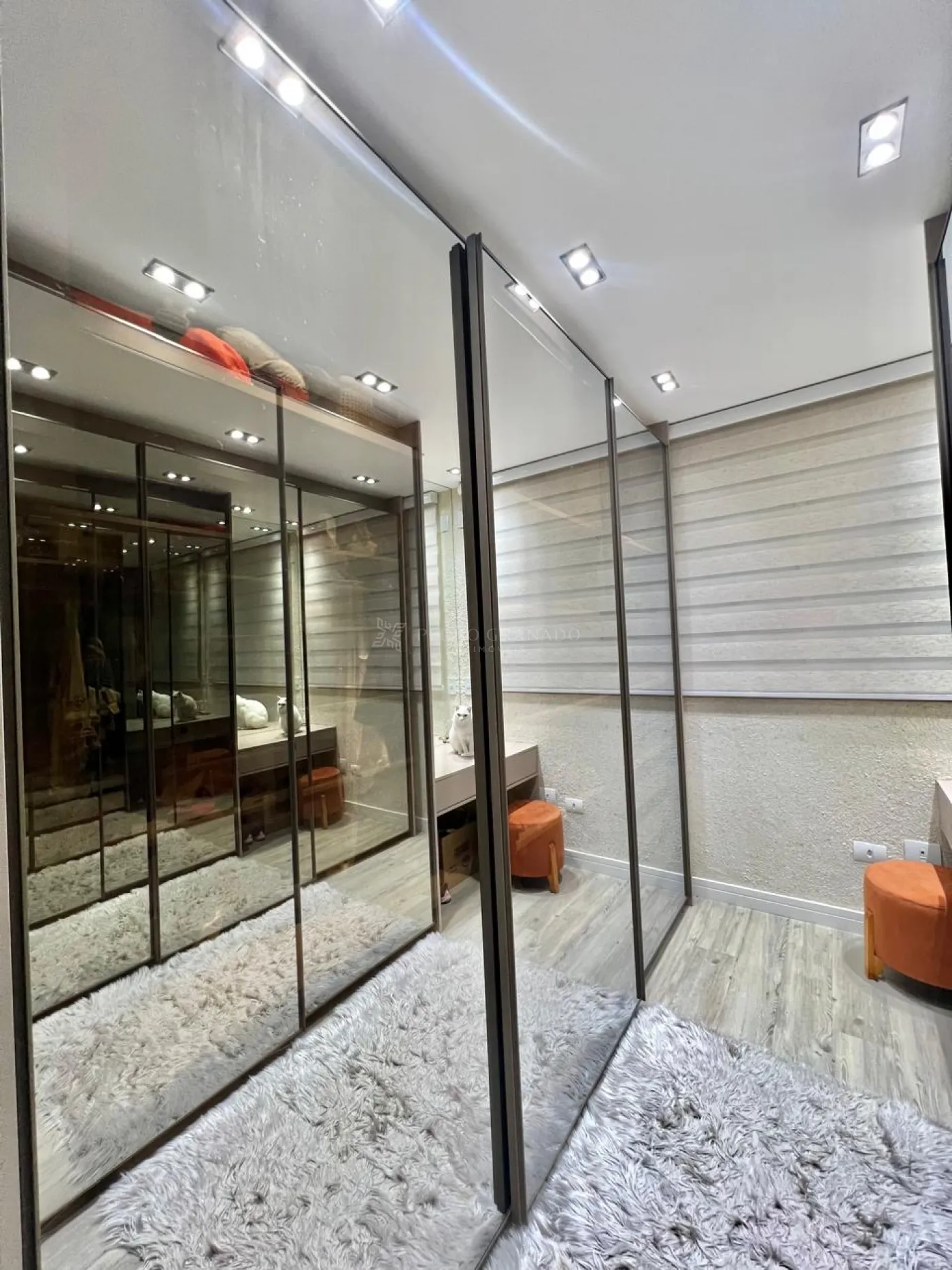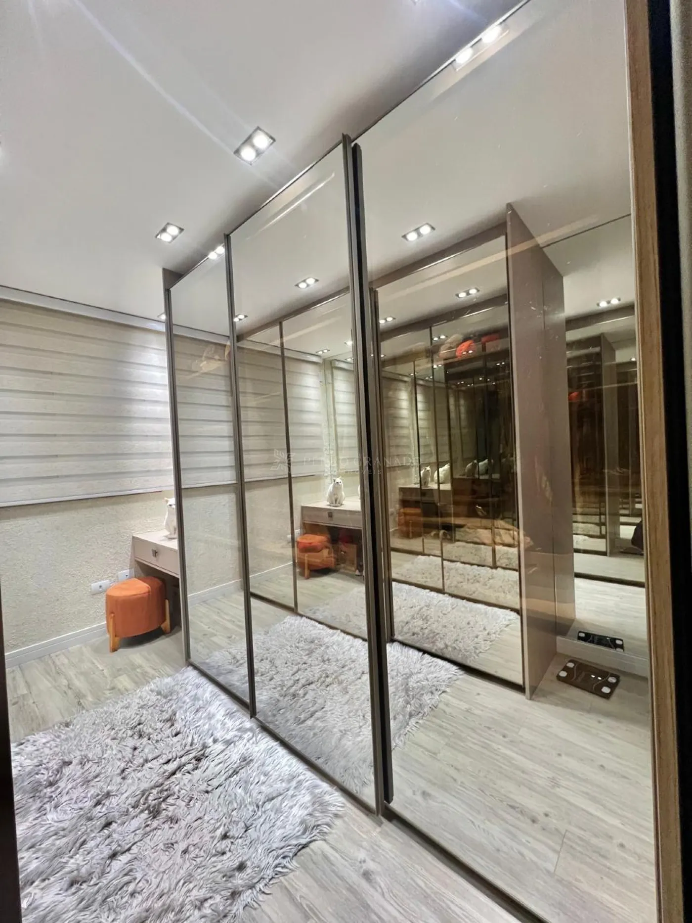 Suíte, amplo closet, bancada para fazer maquiagem e sacada com vista maravilhosa para a cidade, banheiro com box blindex, ducha, bancada em granito na pia, espelho.
