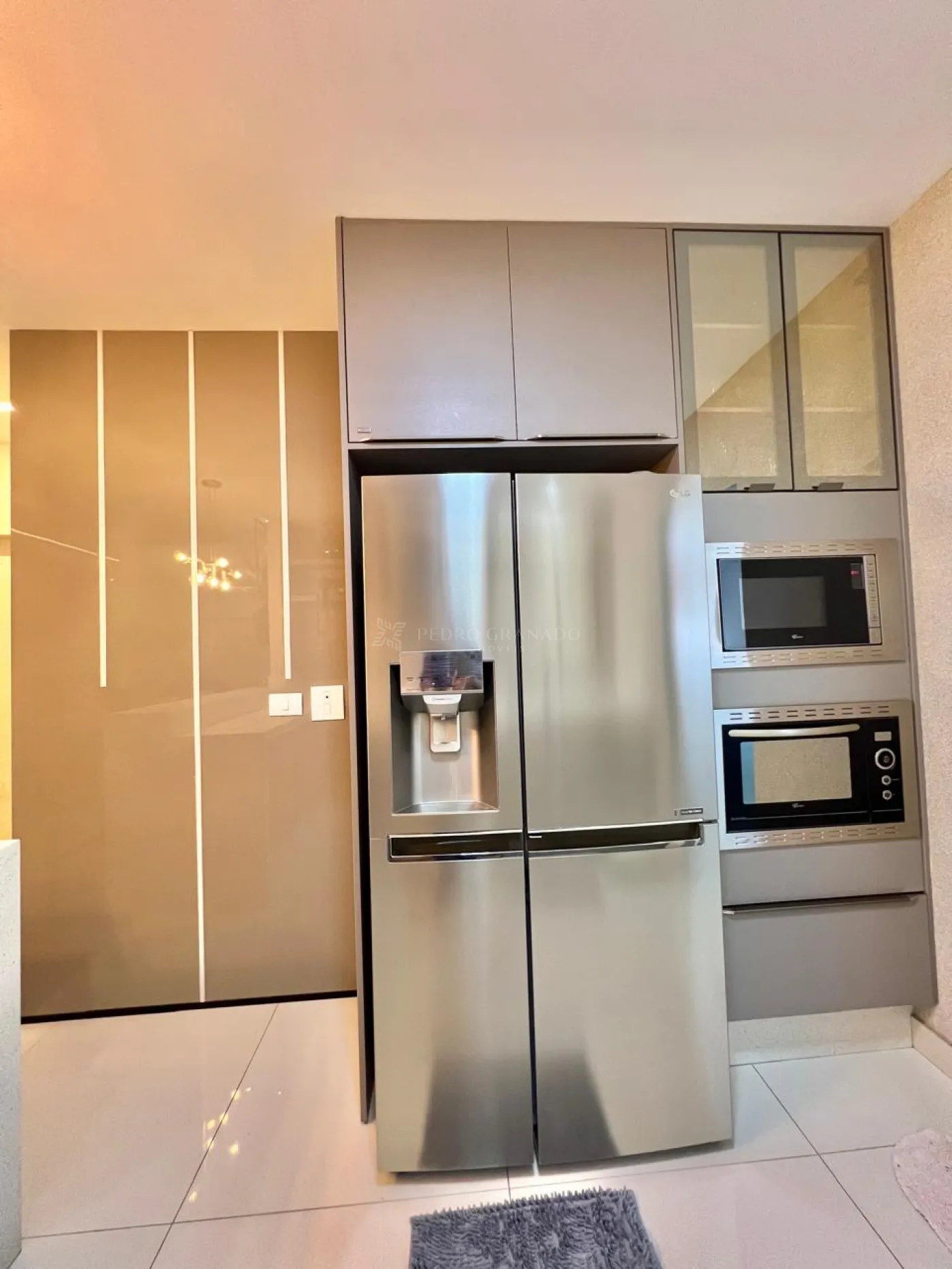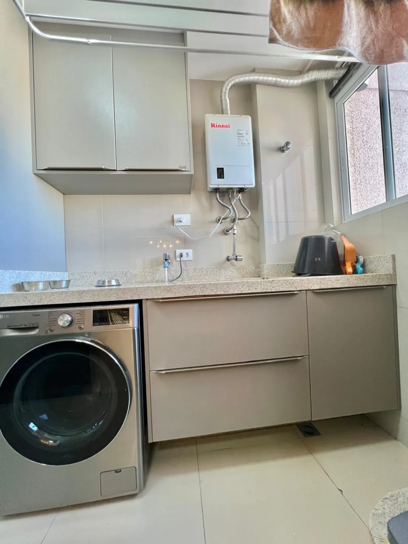 Área de serviço com armários, bancada em granito.