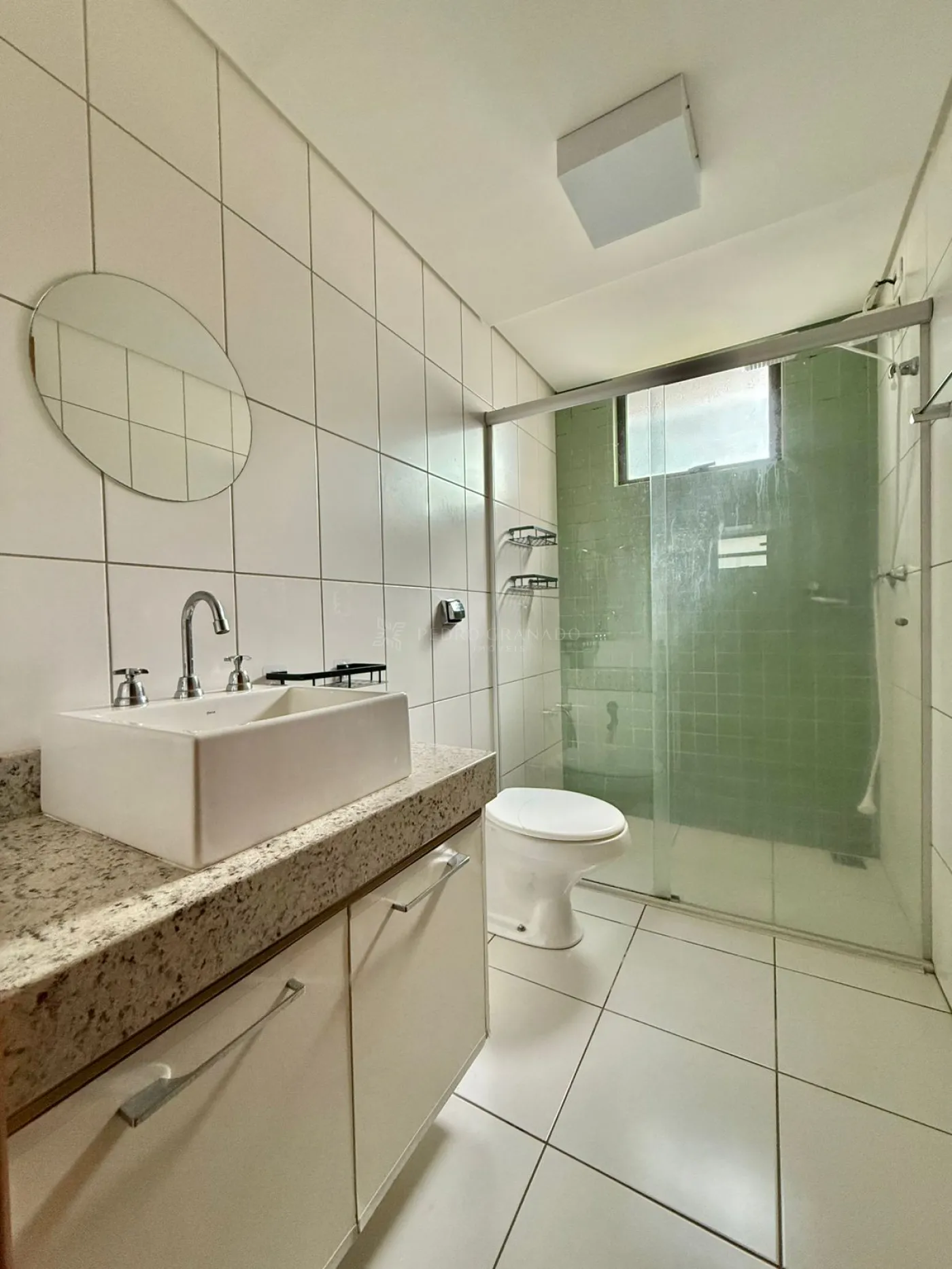 Banheiro com box blindex, armário e chuveiro