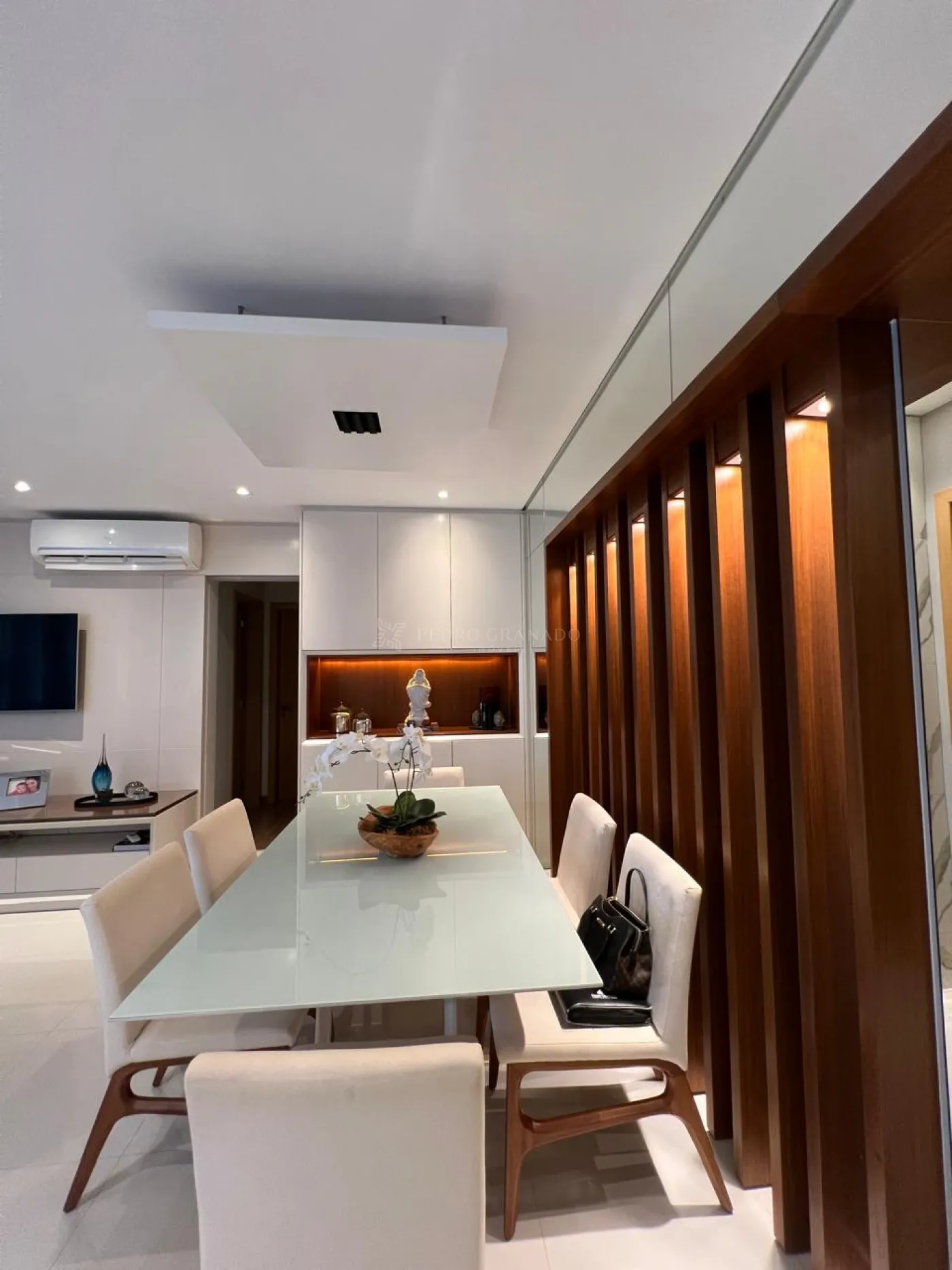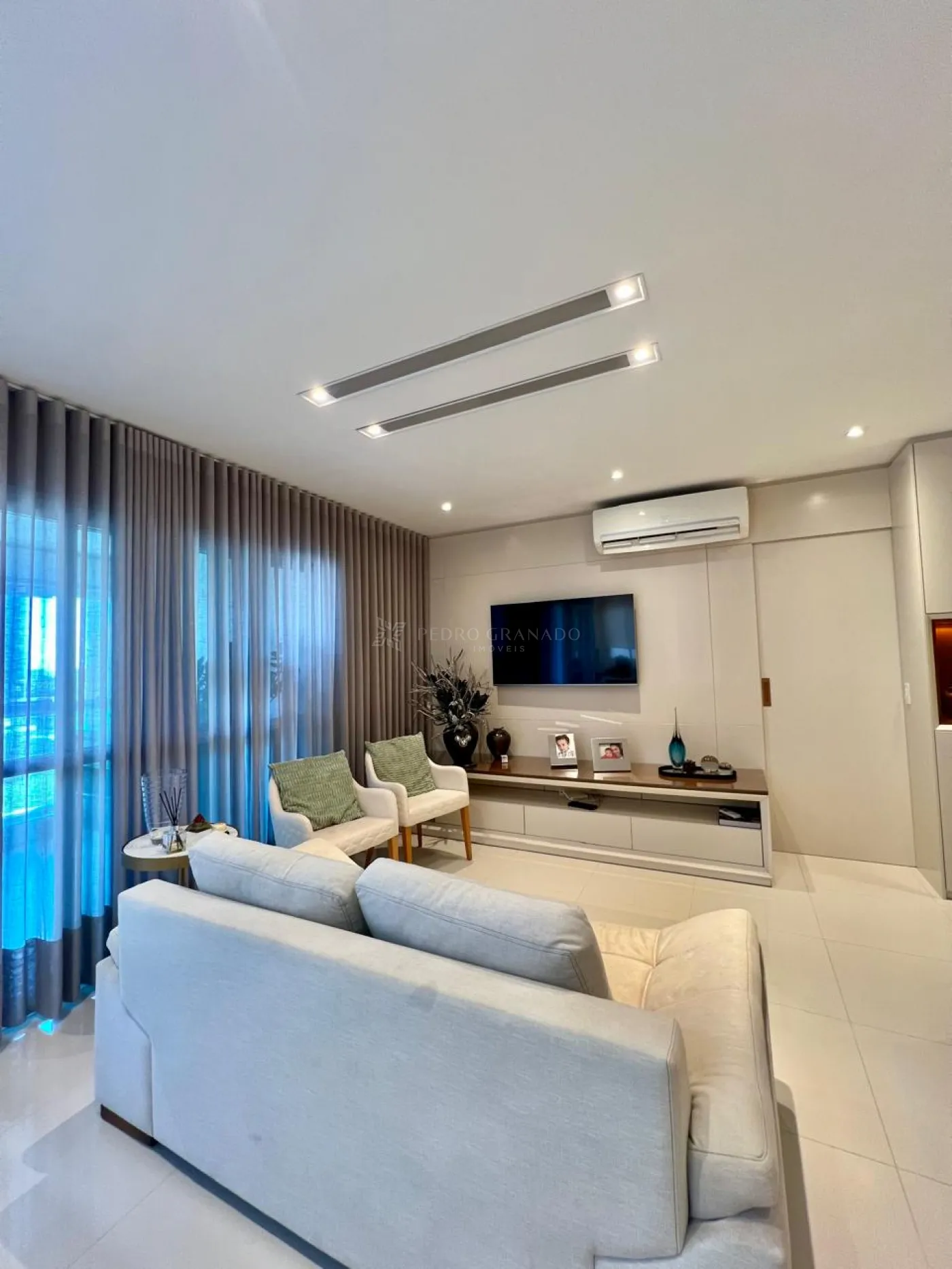 Sala de Estar com sofá com 02 lugares e 02 poltronas, lustre, ar condicionado, painel e rack de televisão, armários