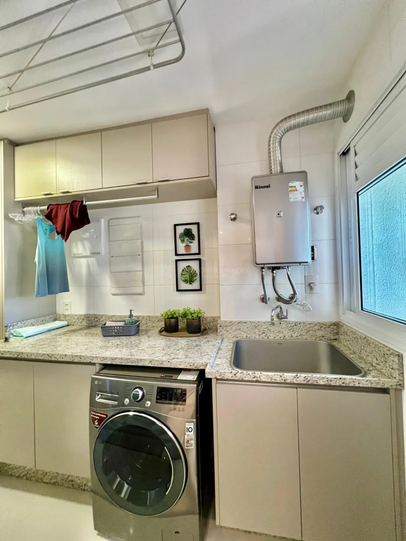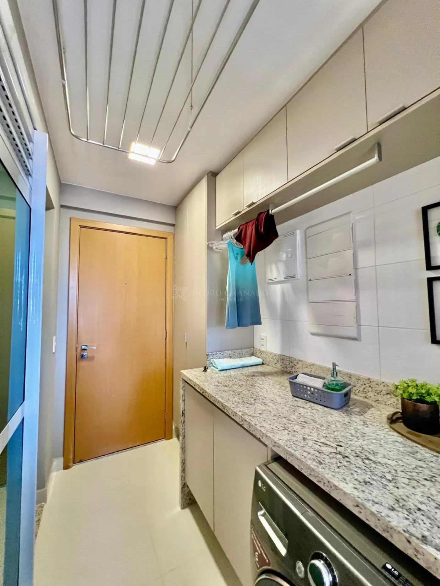 Área de serviço ampla com máquina de lavar e armários planejados.
