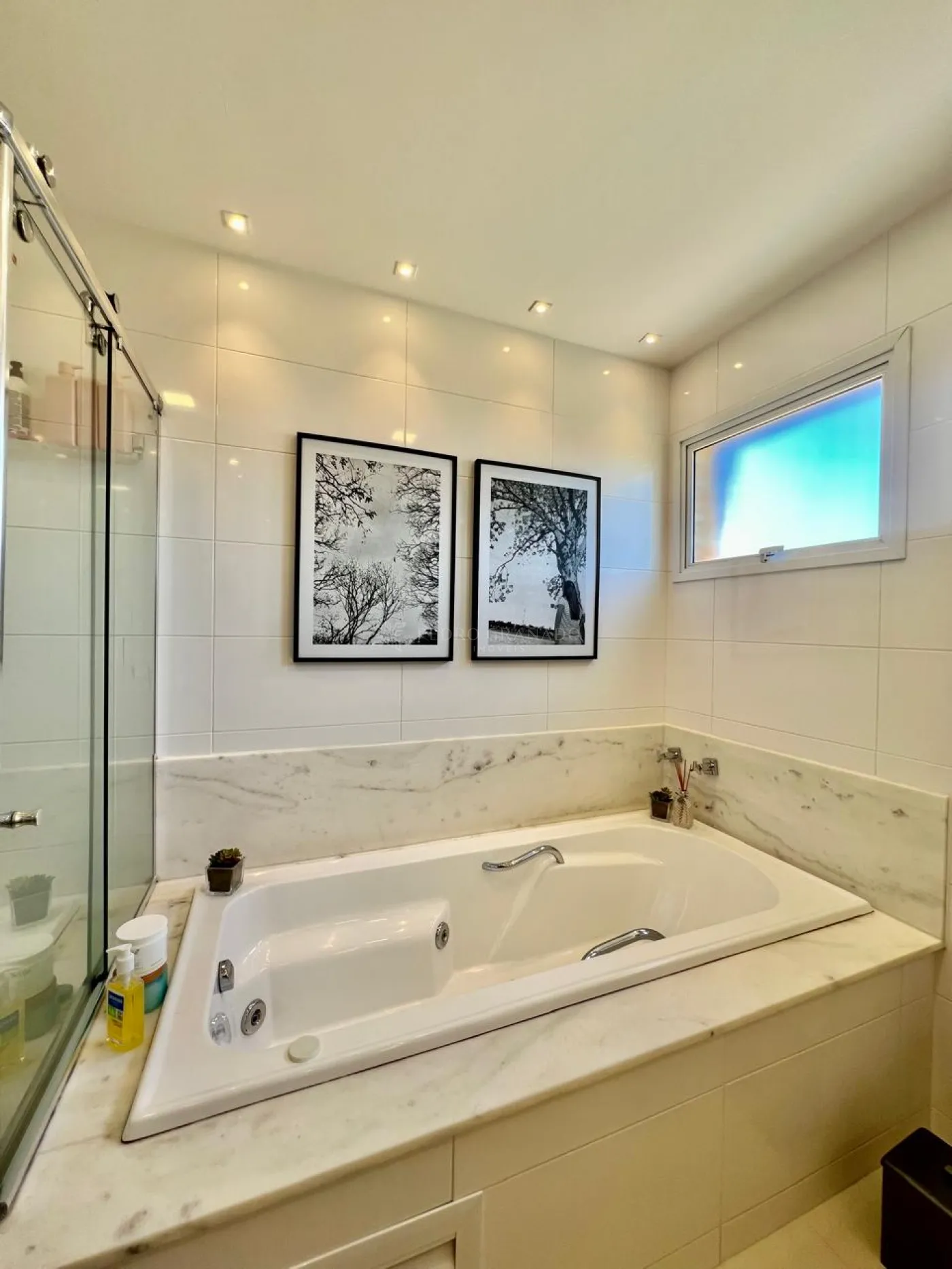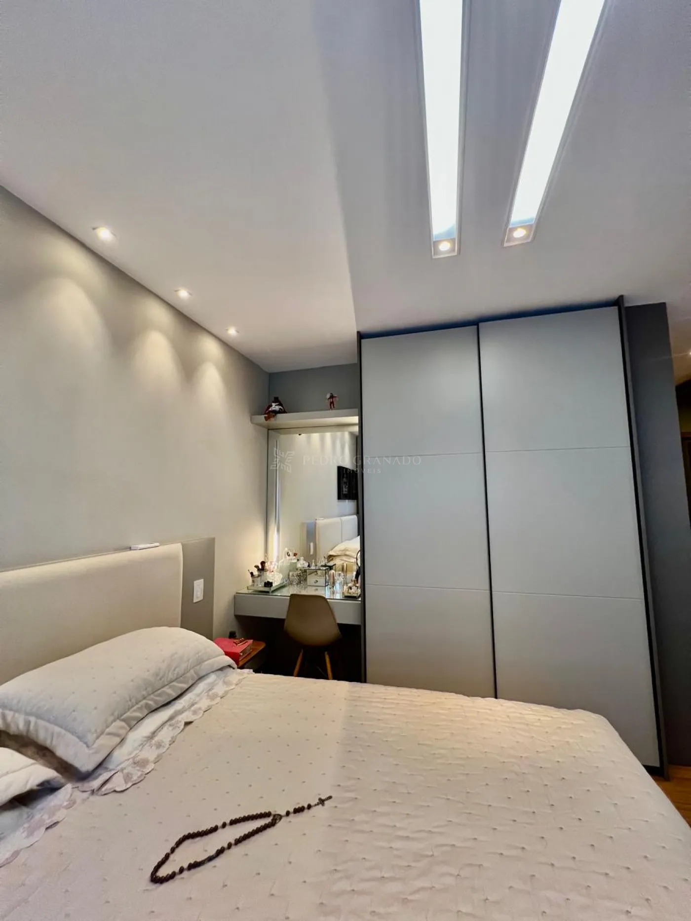 01 Suíte Master ampla, com móveis planejados, ar condicionado, cama box com cabeceira planejada e armários espelhados, closet amplo, penteadeira com suporte para bijouterias, painel para televisão, persiana automatizada, banheiro com banheira e box com 02 cubas.