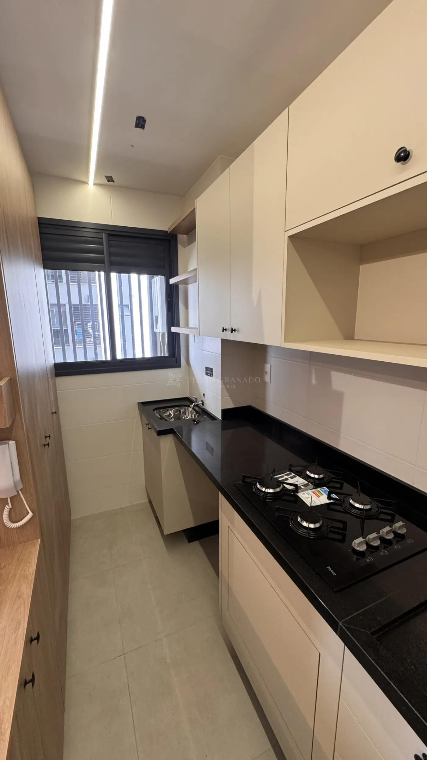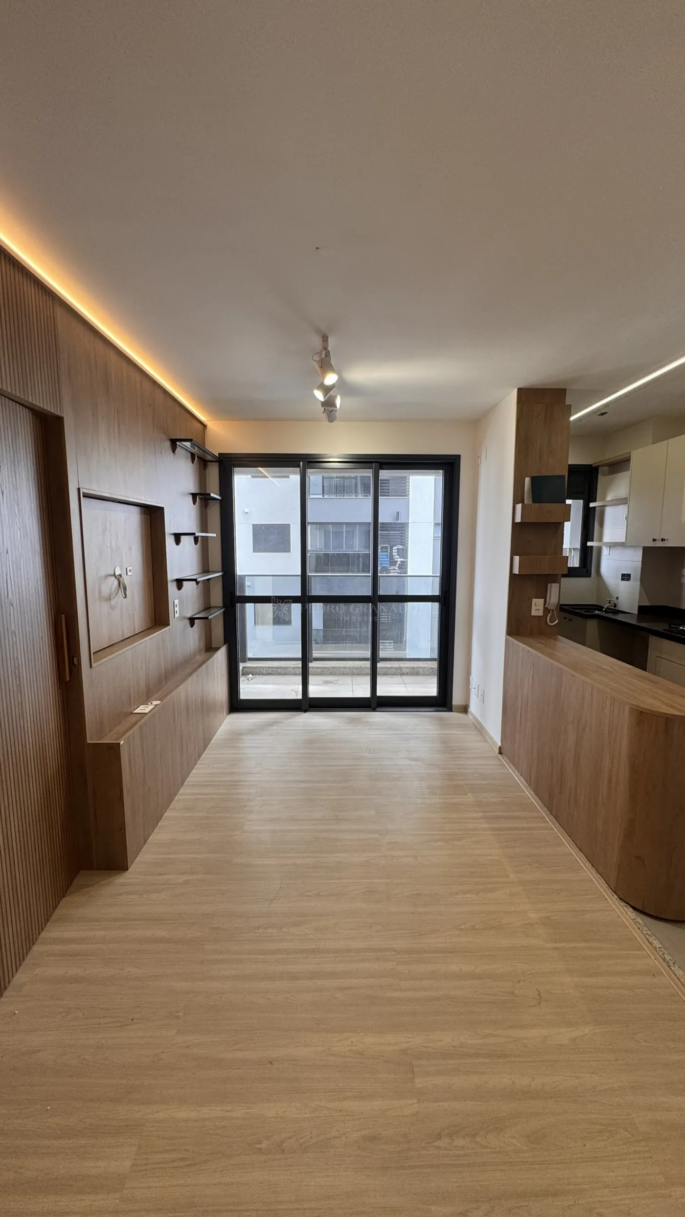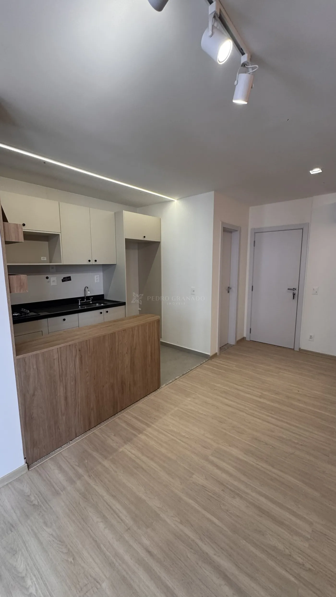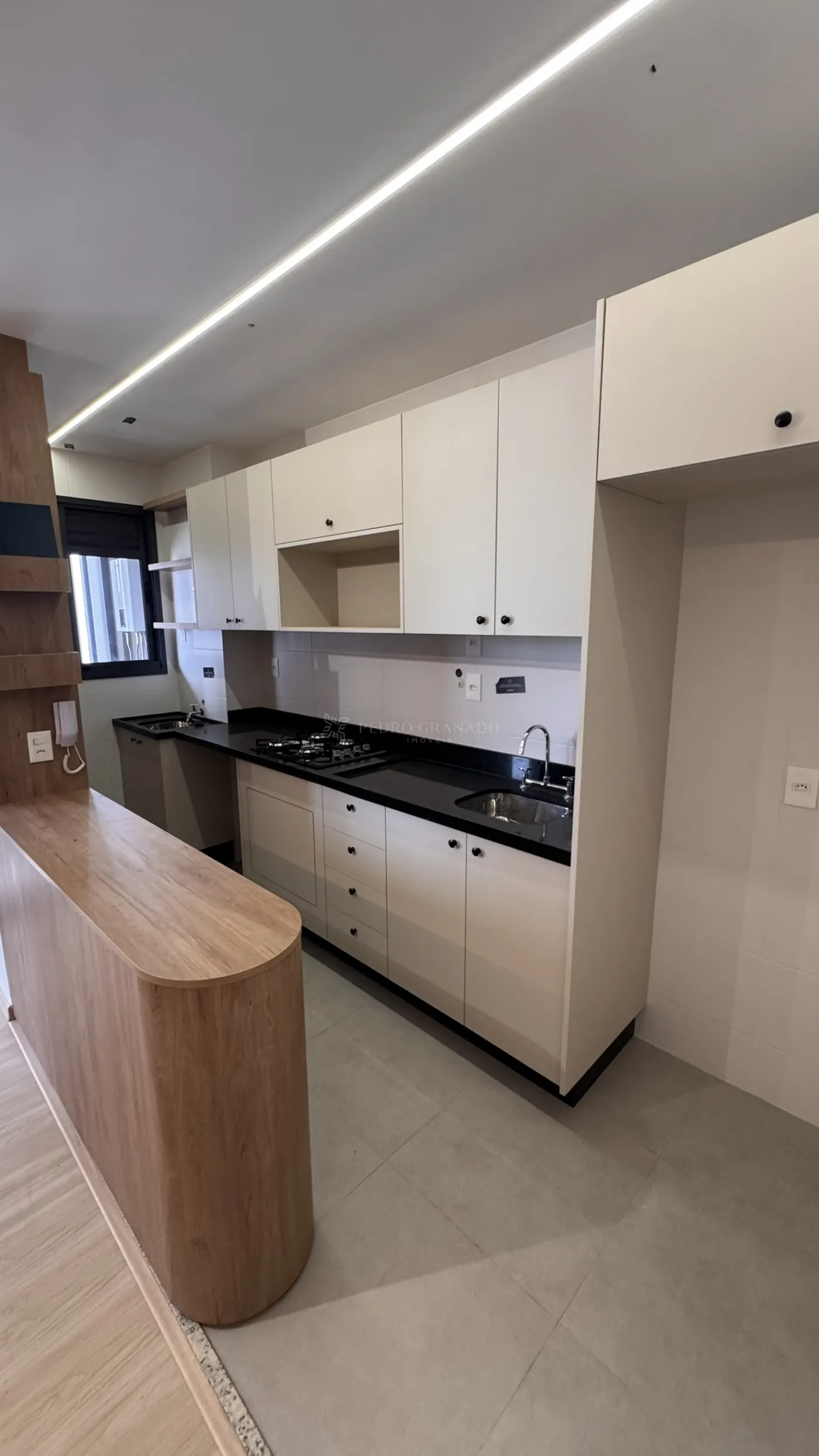 O imóvel conta com cozinha planejada A sala possui painel de TV e iluminação em LED, trazendo modernidade e conforto ao ambiente.