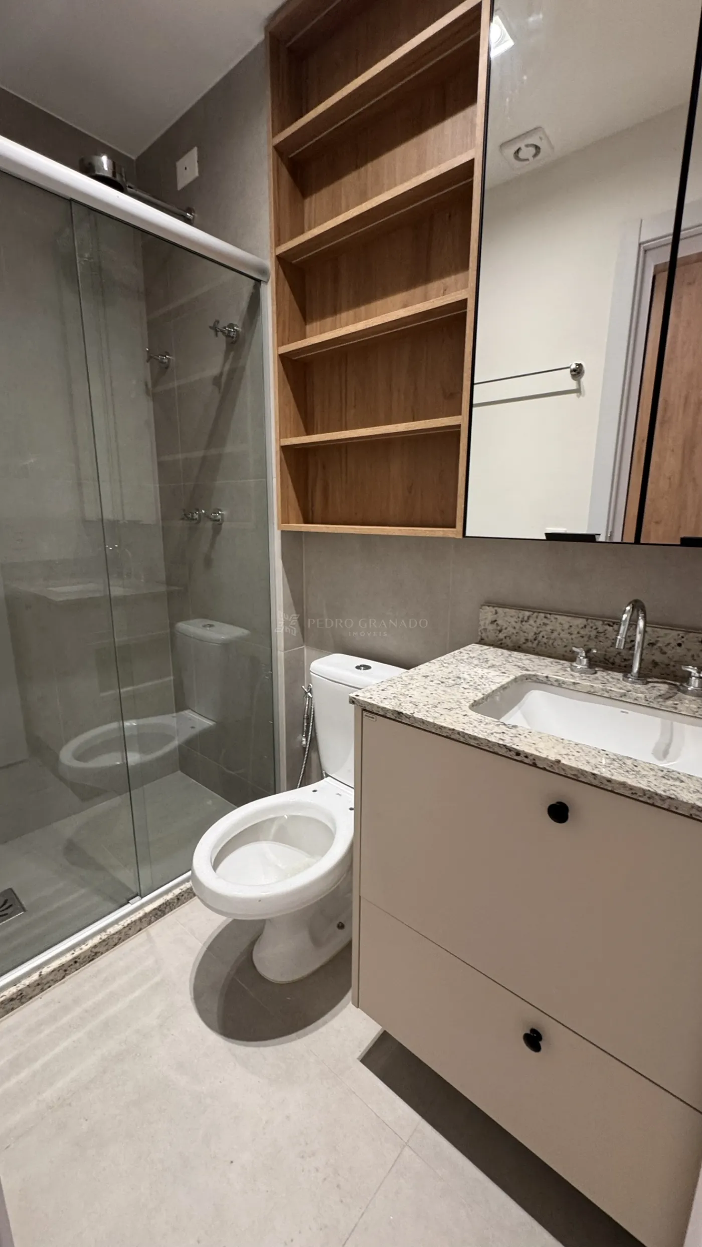 O dormitório dispõe de ar-condicionado e guarda-roupa planejado. O banheiro é completo, com armários e box Blindex.