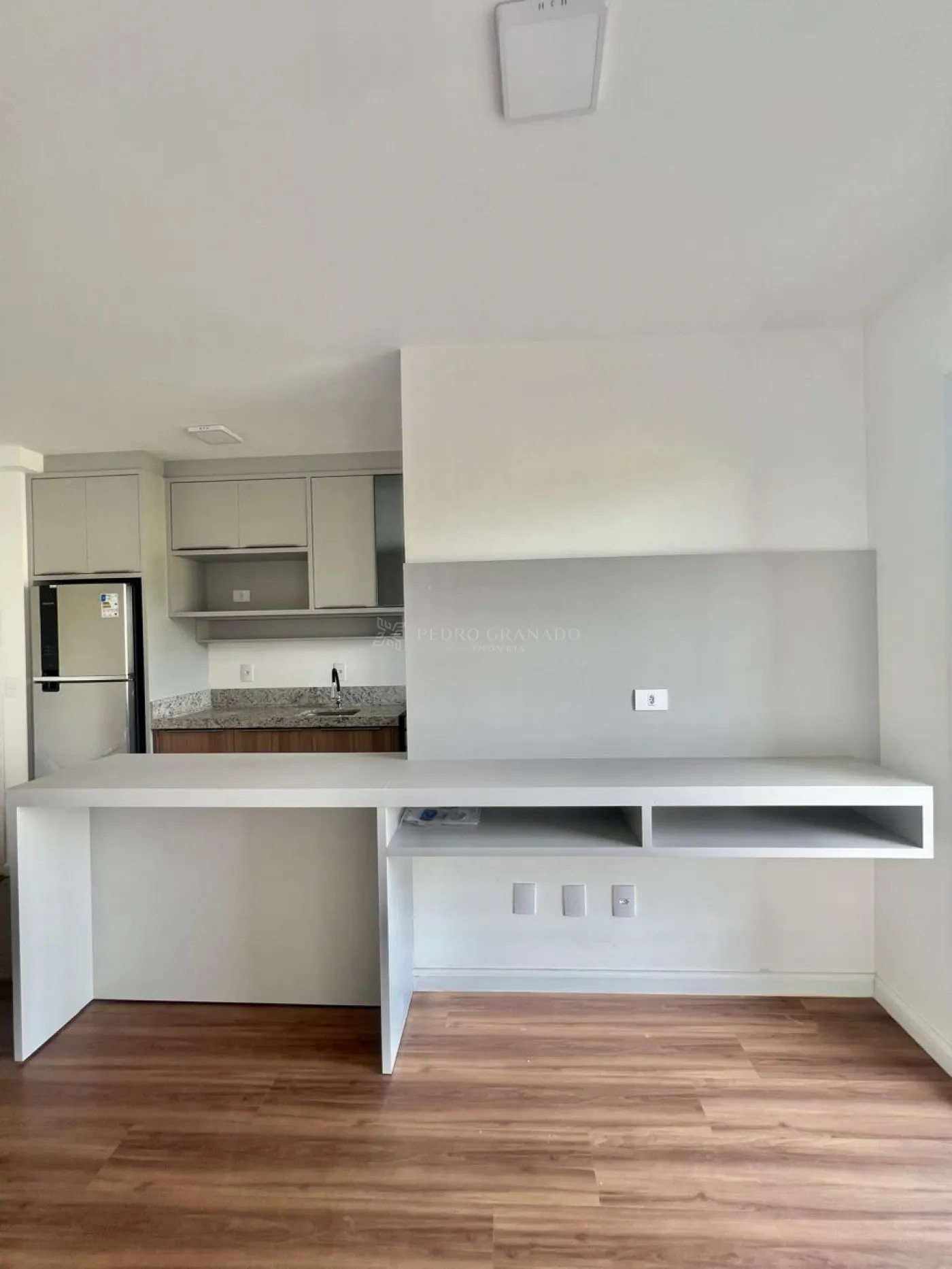 Sala dois ambientes, sendo a sala de estar com painel, rack para televisão e bancada em madeira