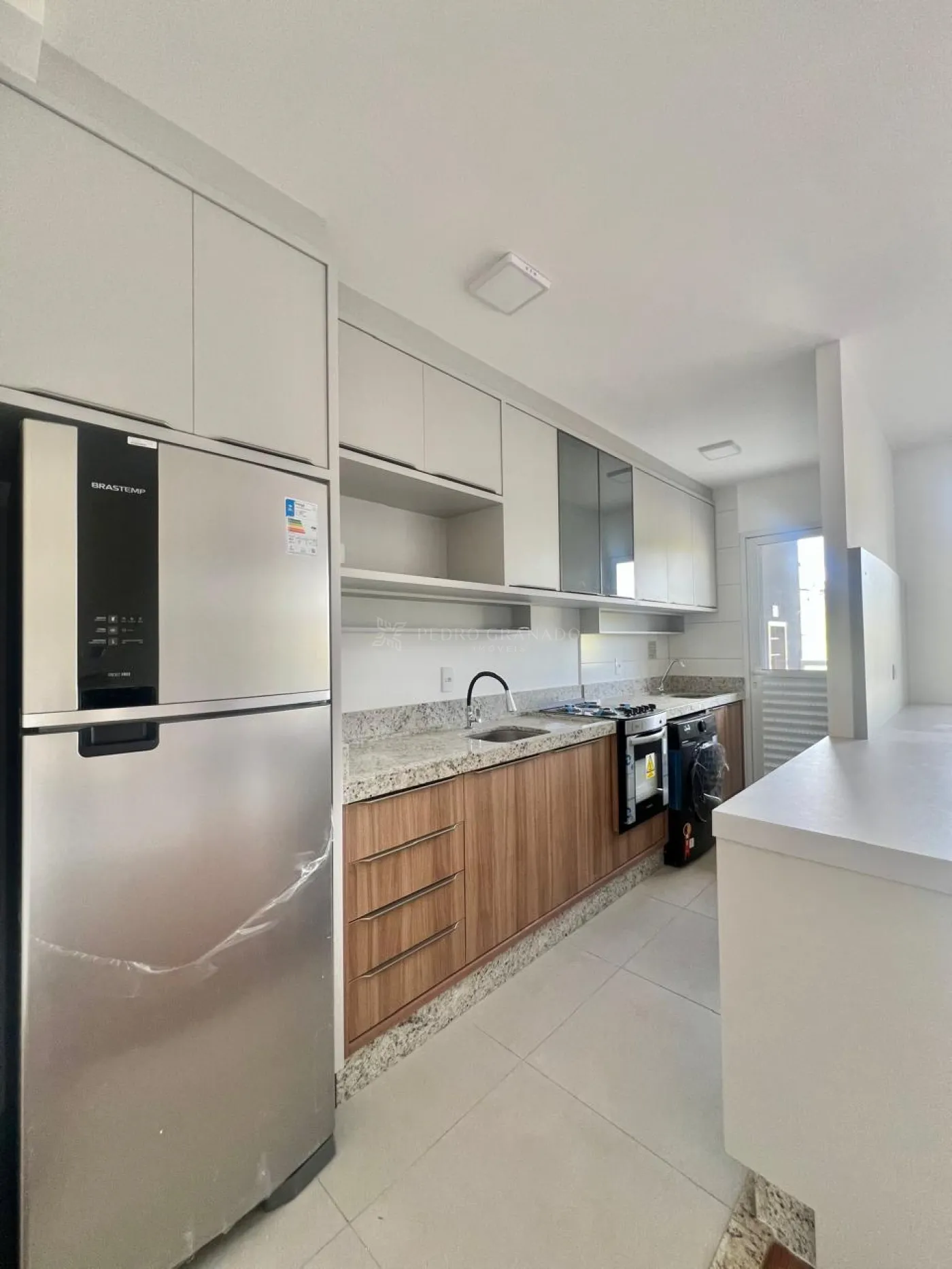Cozinha planejada com lindos armários, geladeira frost-free, fogão e forno a Gás, bancada da pia em granito e cuba em inox.
