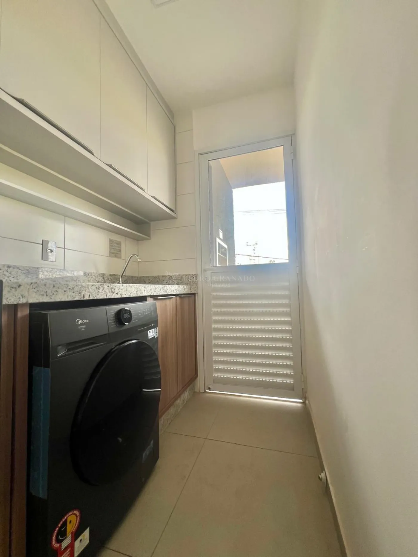 Área de serviço com armário, tanque em inox, e máquina de lavar roupas.