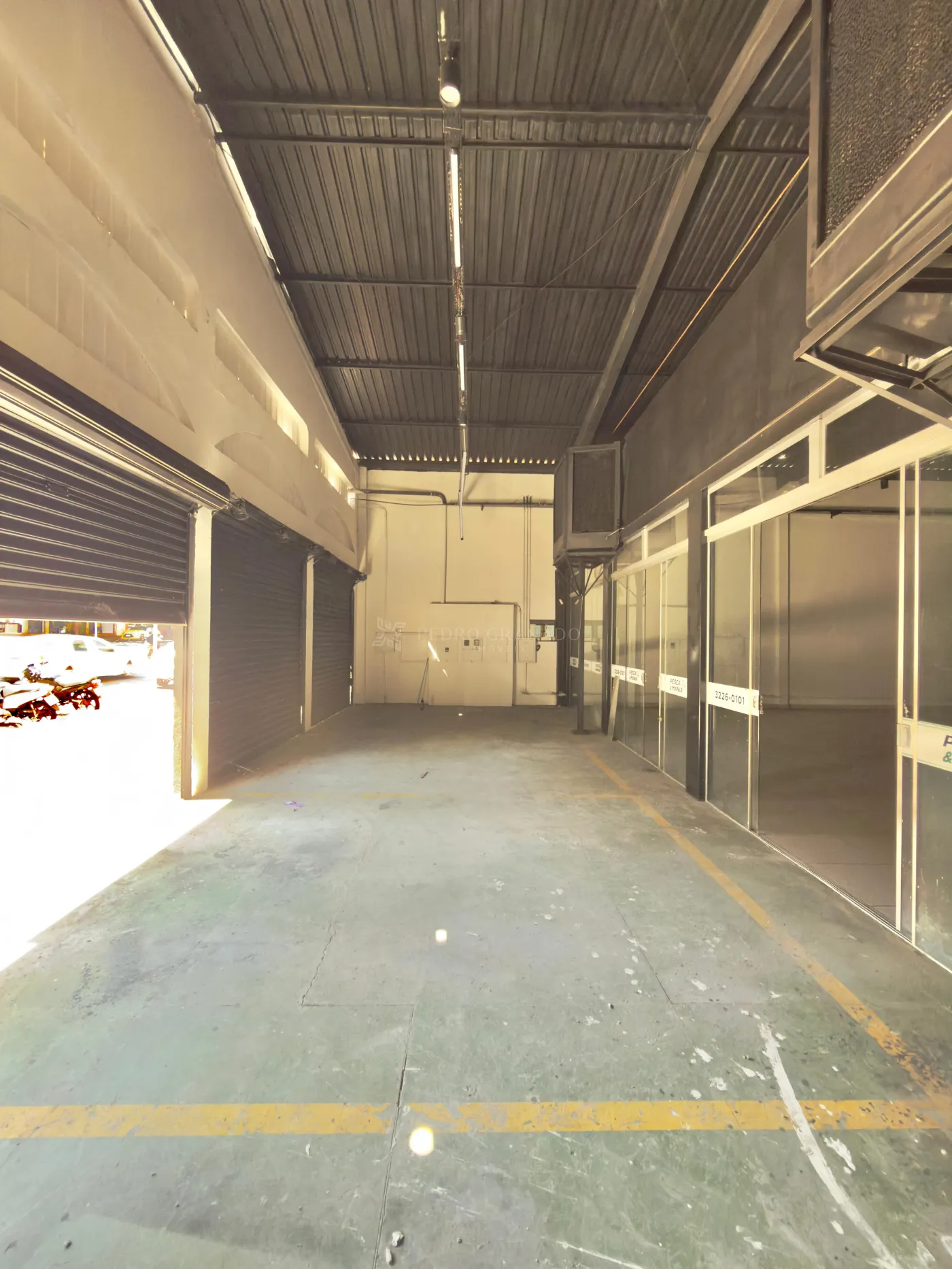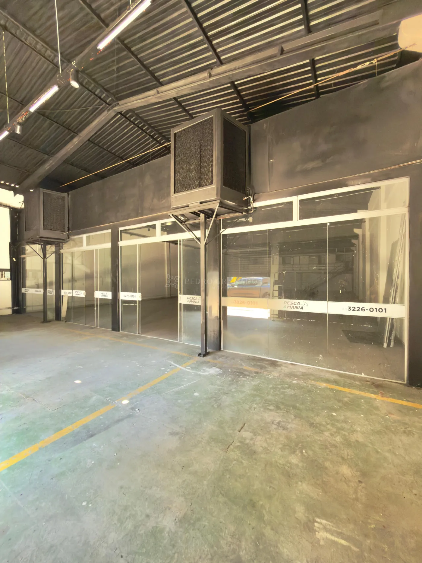 Para maior conforto e ventilação do ambiente, o barracão dispõe de dois ventiladores industriais (tipo exaustores), contribuindo para melhor circulação de ar no espaço interno.