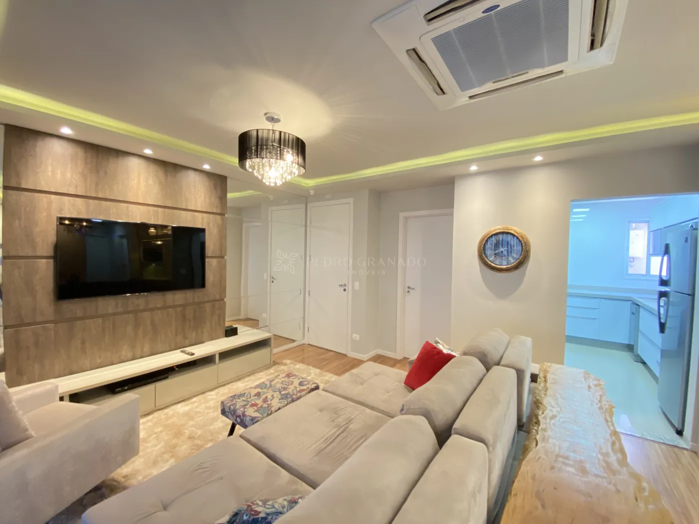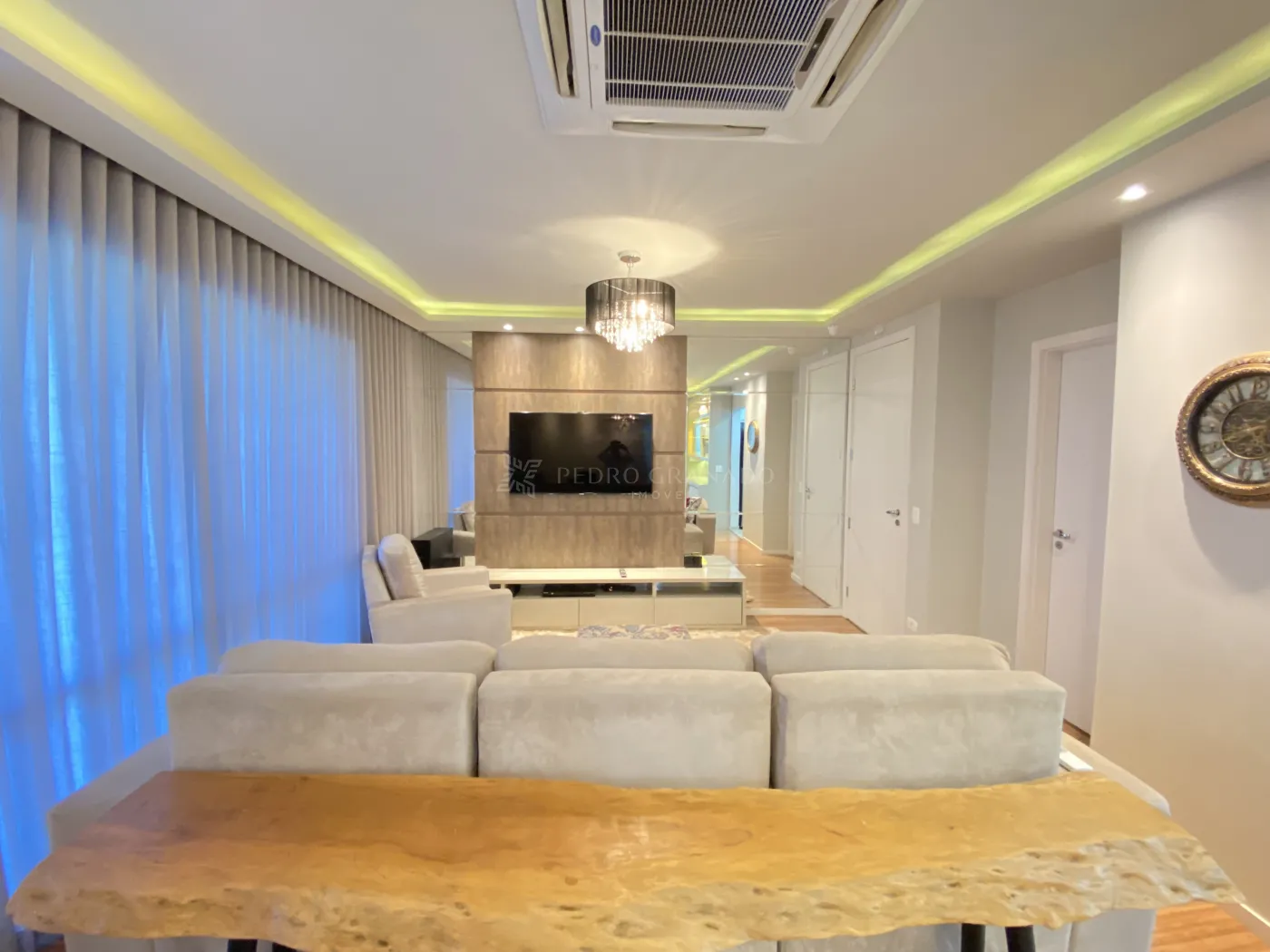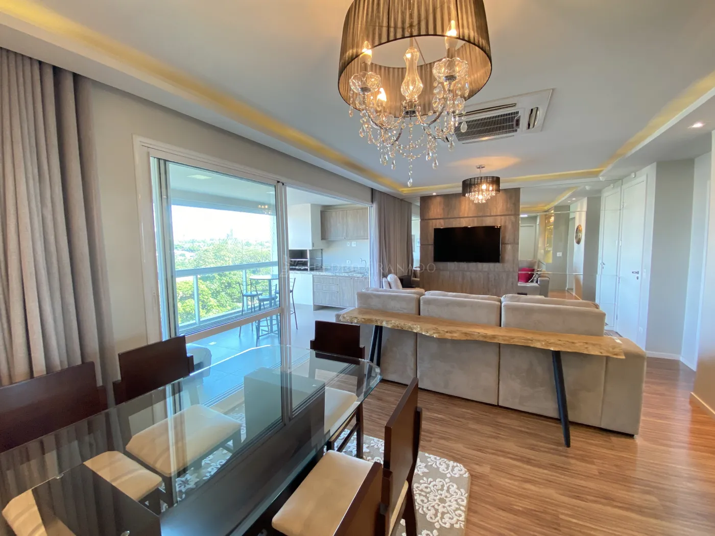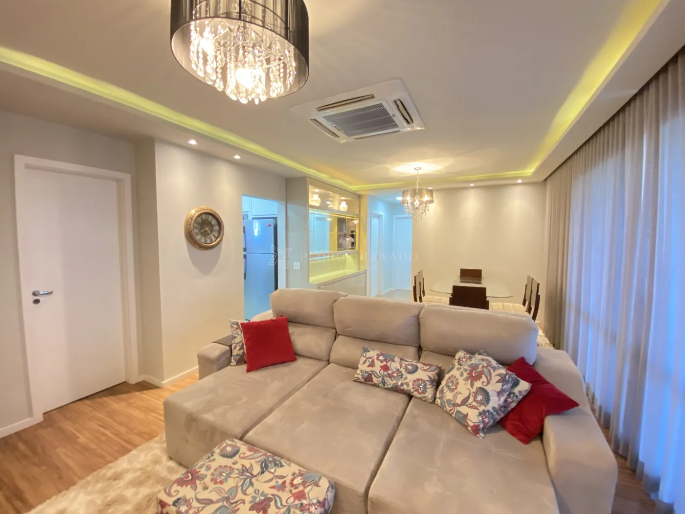 * Ampla sala: Dois ambientes confortáveis, equipados com ar-condicionado, sofá retrátil de 3 lugares, TV 55`, Home Theater, e uma elegante área de jantar com mesa de 6 lugares, cristaleira e adega, ambas realçadas por belos lustres.