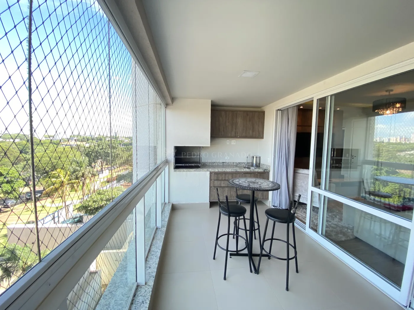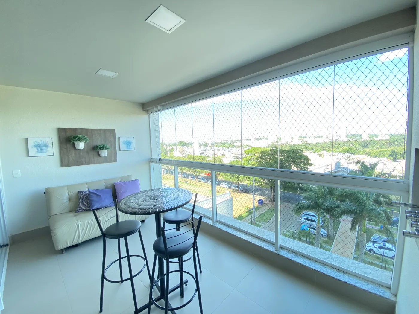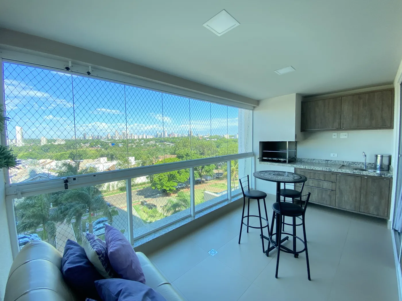 * Espaço de lazer: Varanda gourmet com churrasqueira, mesa de centro (com 3 cadeiras) e sofá de 2 lugares, perfeita para receber.