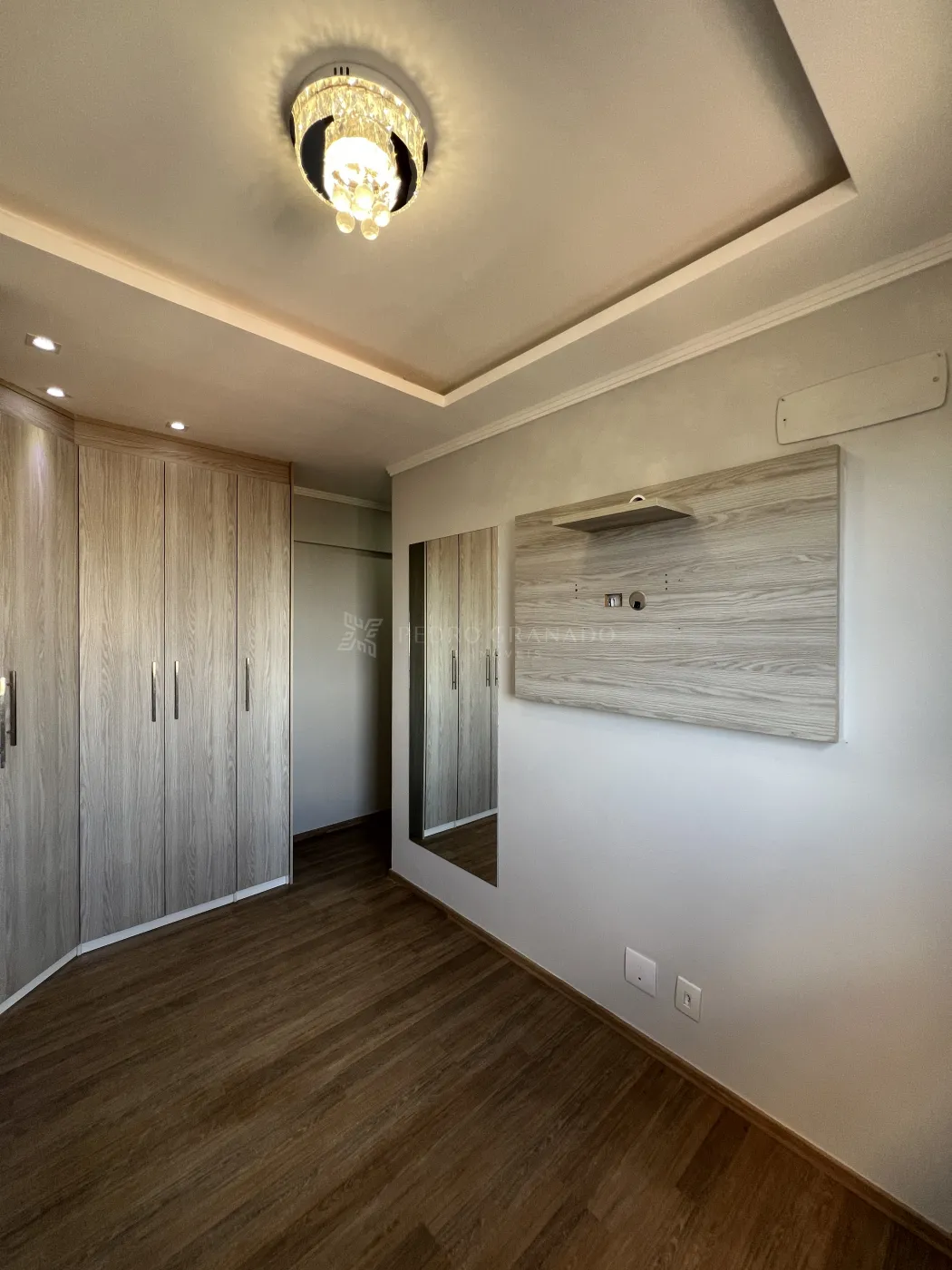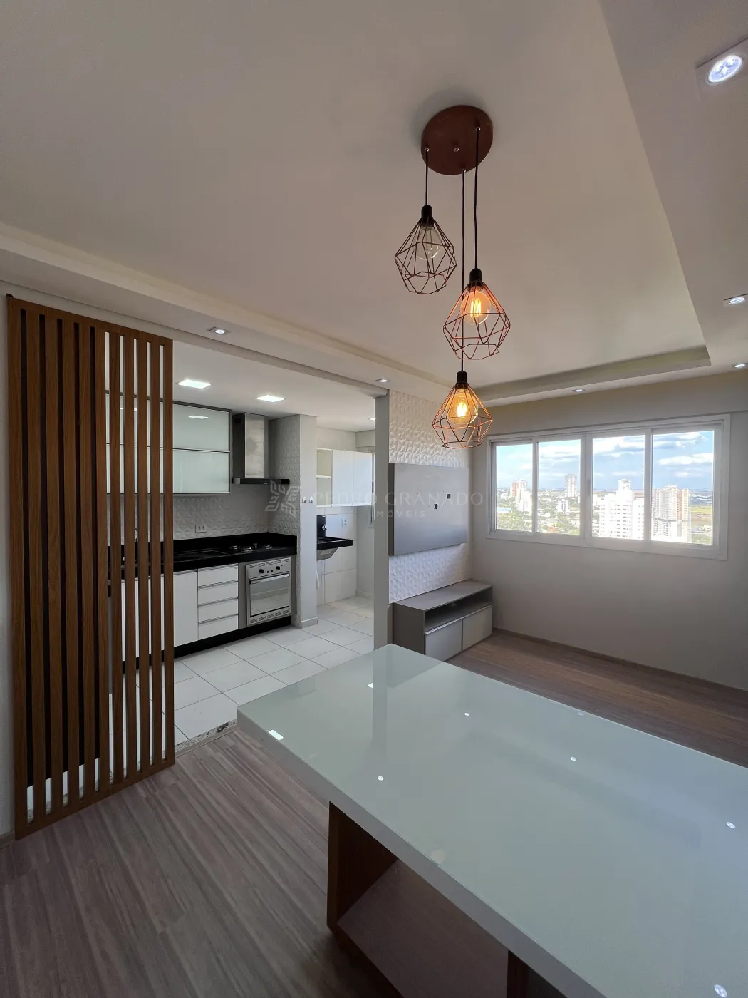 O imóvel possui sala dois ambientes com mesa, painel de TV e espelhos, cozinha planejada, fogão, forno embutido e depurador de ar, área de serviço, banheiro social e 2 quartos com móveis planejados.