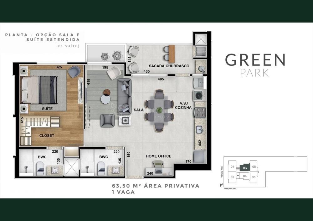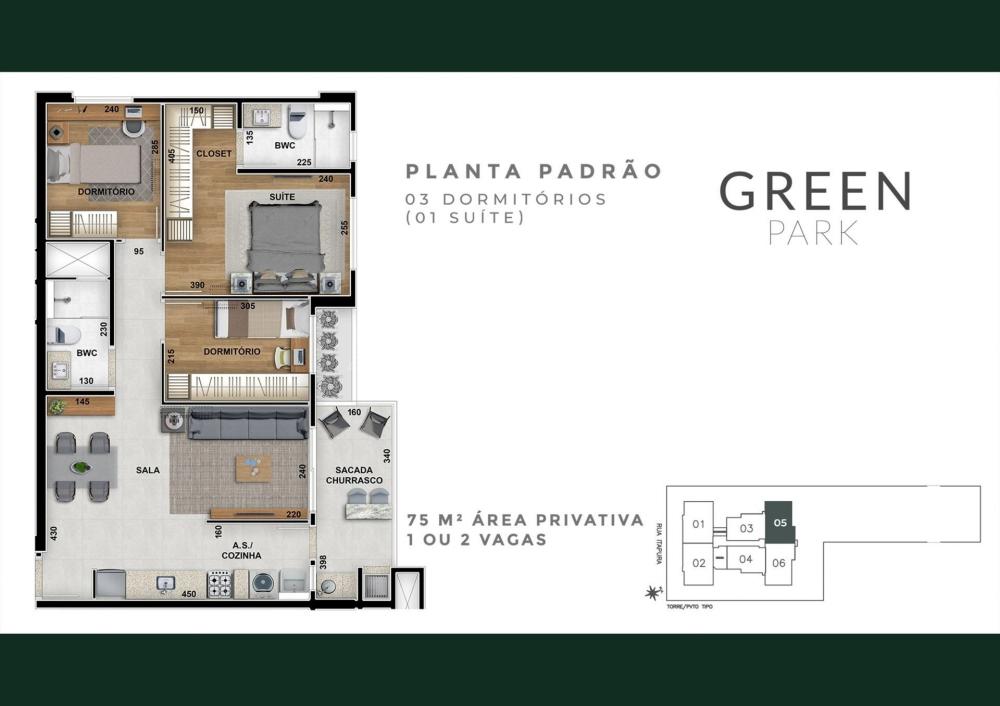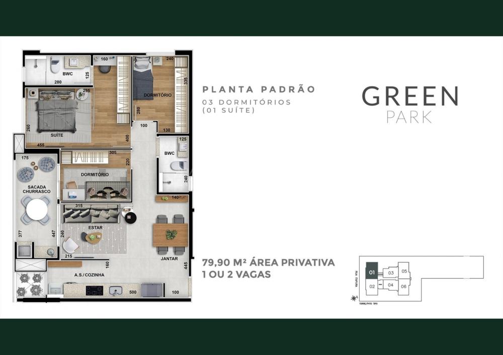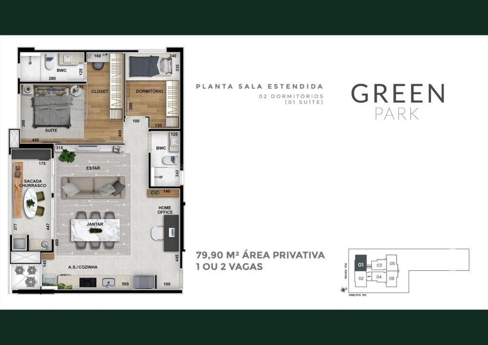 O imóvel conta com 1 suíte e mais 1 quarto (possibilidade de mais um quarto, devido a sala estar estendida), cozinha integrada, sala de tv/jantar, banheiro social e sacada gourmet com churrasqueira a carvão.