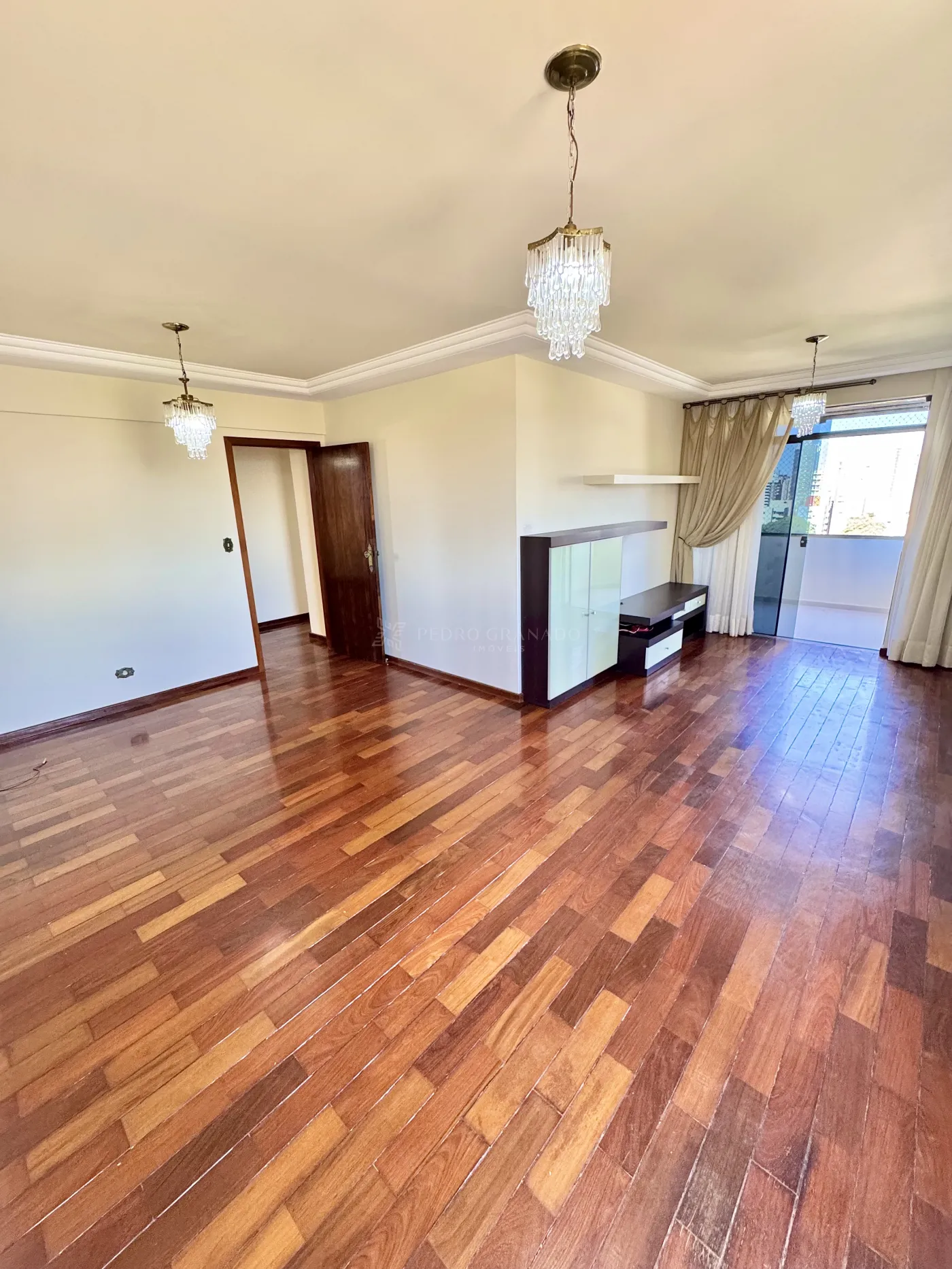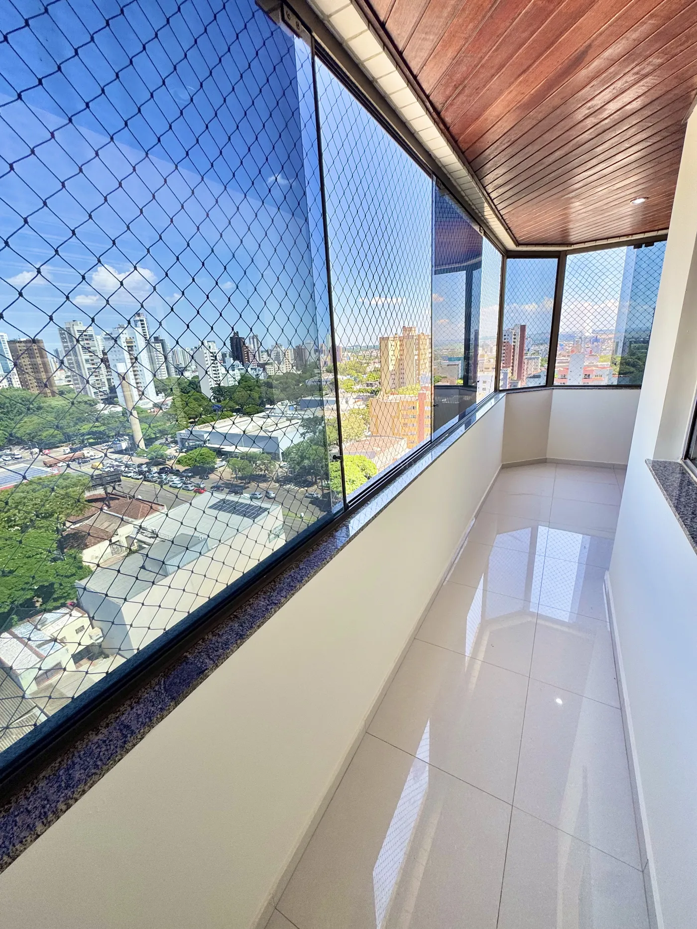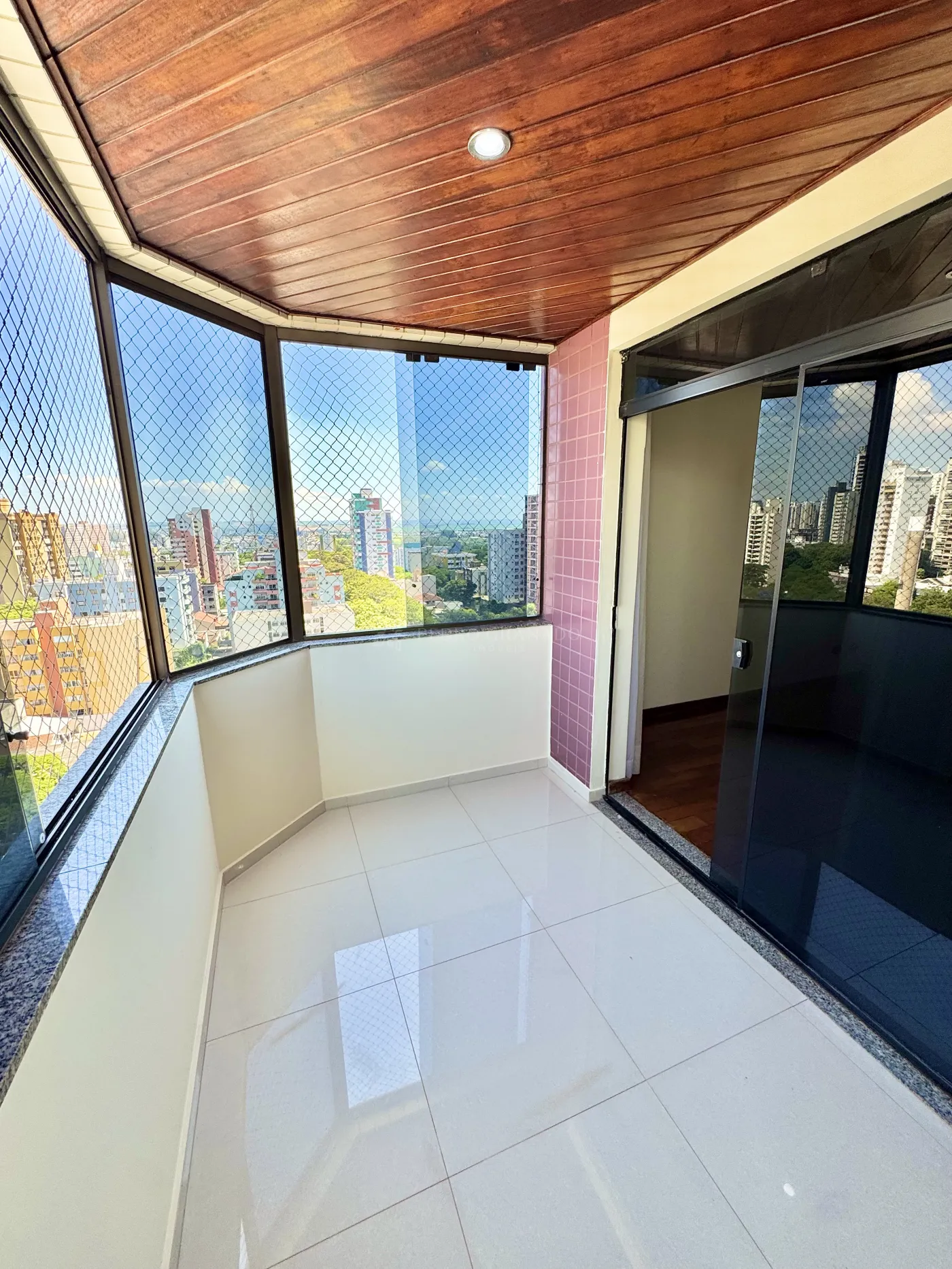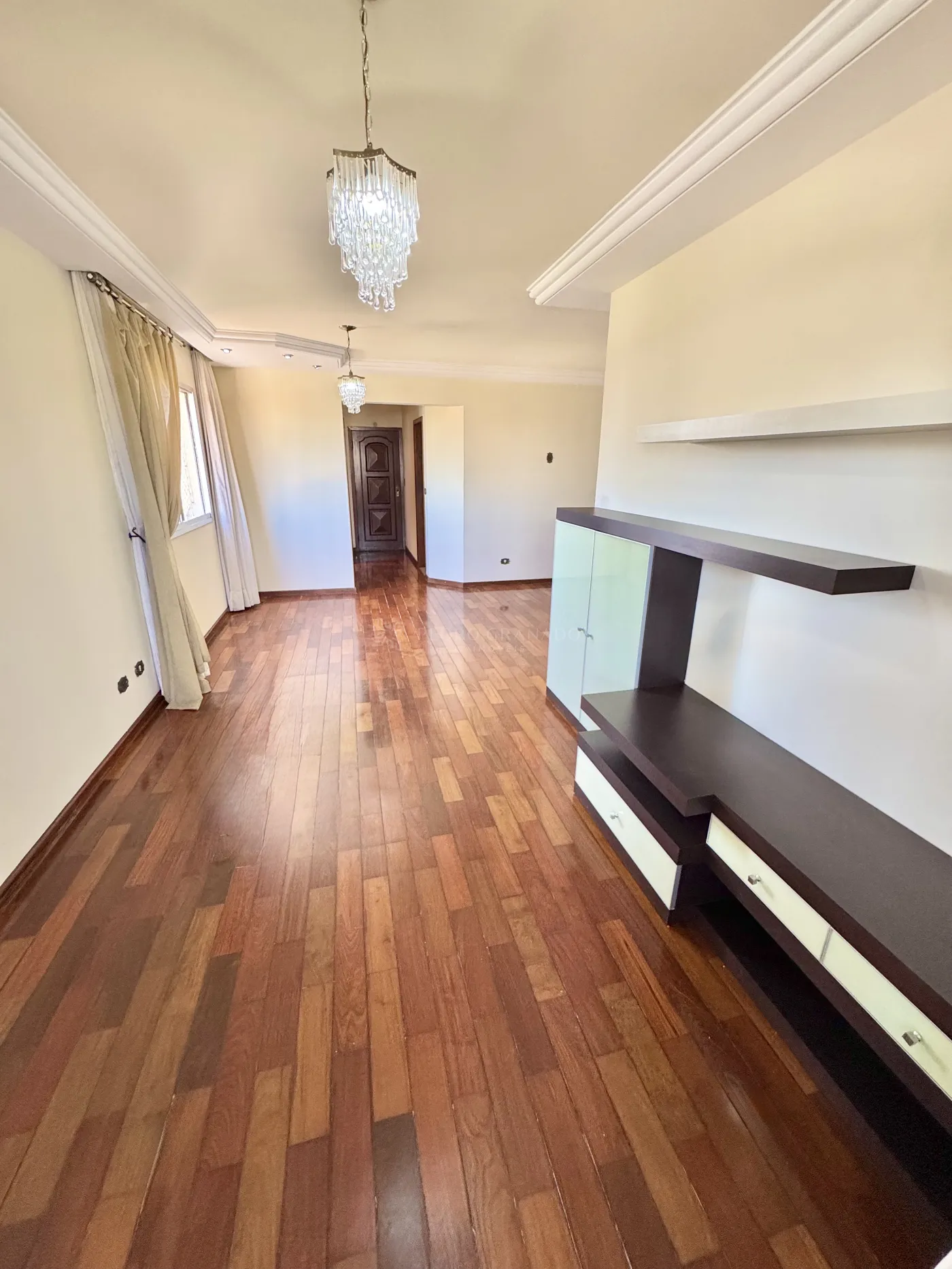 * Salas de TV e jantar integradas com armários e rack; sacada com fechamento em vidro e lavabo.