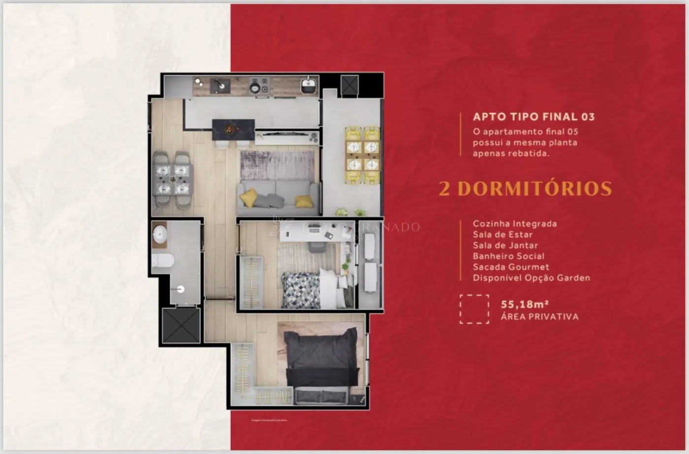 O apartamento possui 2 quartos, sala com ambientes integrados, ampla sacada com churrasqueira a carvão, 1 vaga de garagem no primeiro pavimento, infra de ar condicionado nos quartos e sala, e o melhor de tudo todos os ambientes são de frente para o acesso social do empreendimento.