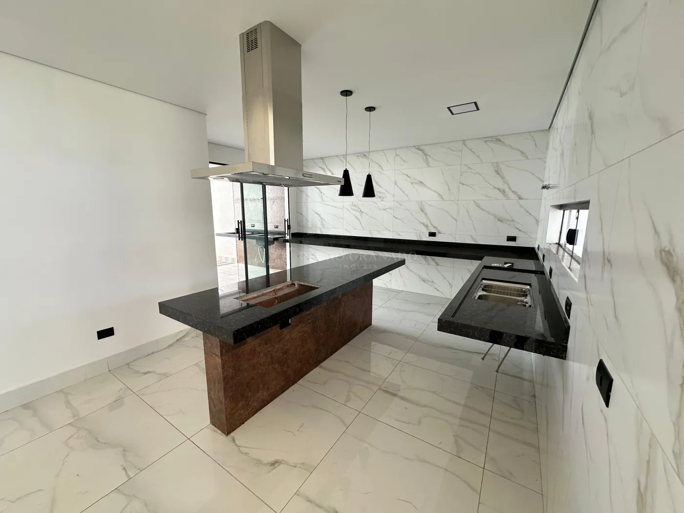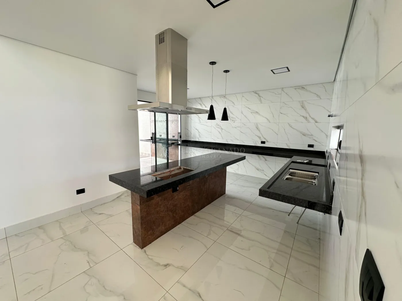 Conta com suíte com closet, 1 demi-suíte, sala dois ambientes com pé-direito duplo e luminárias em LED, cozinha planejada com bancada em L, ilha com exaustor de teto e luminárias, área gourmet com churrasqueira e torneira gourmet, piscina com hidromassagem, cascata e LED, lavabo e área de serviço.