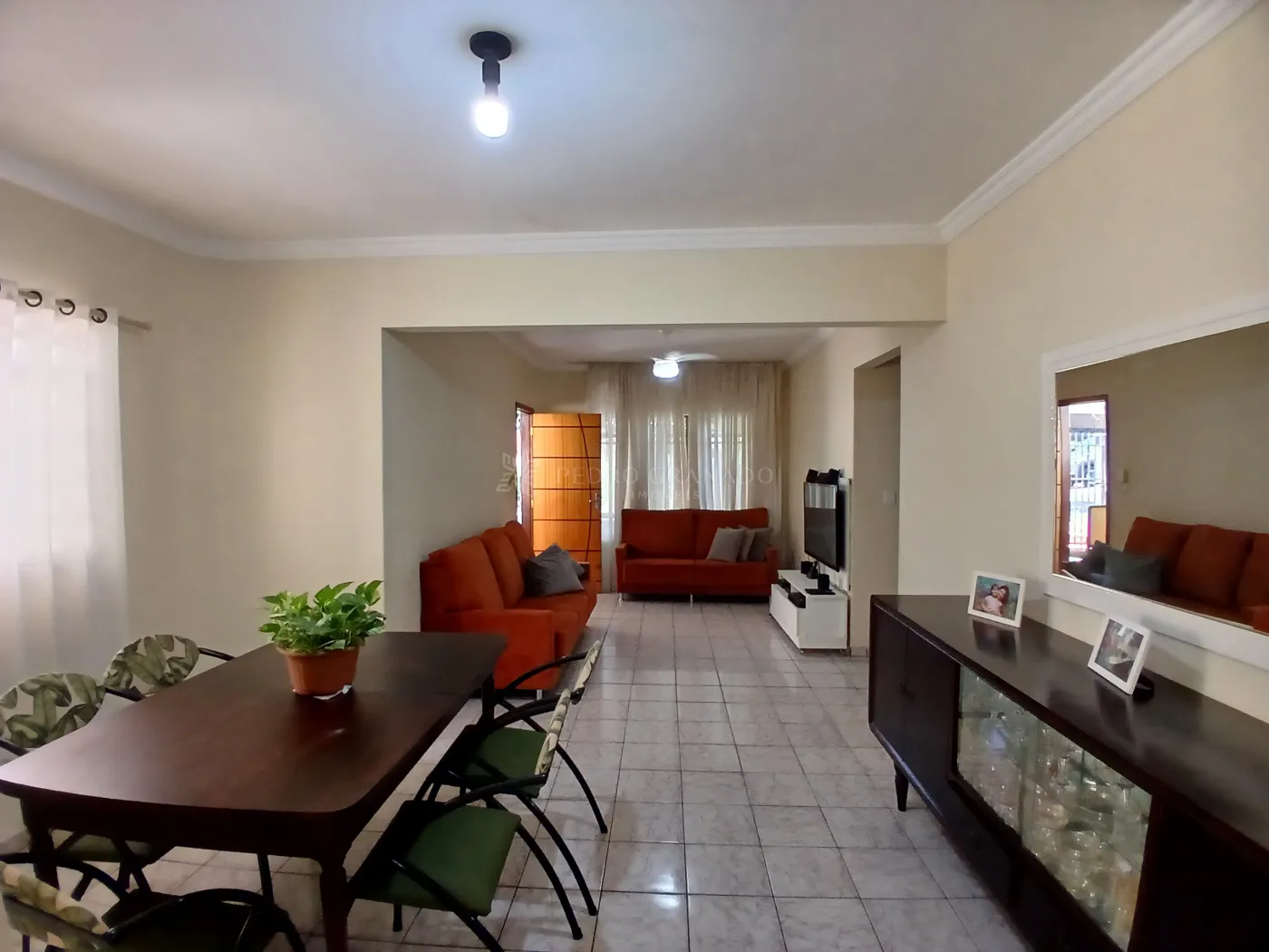 - Sala de estar/TV integrada à sala de jantar, localizada na parte frontal da casa