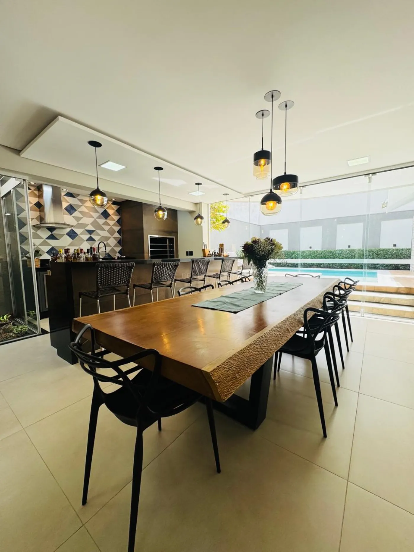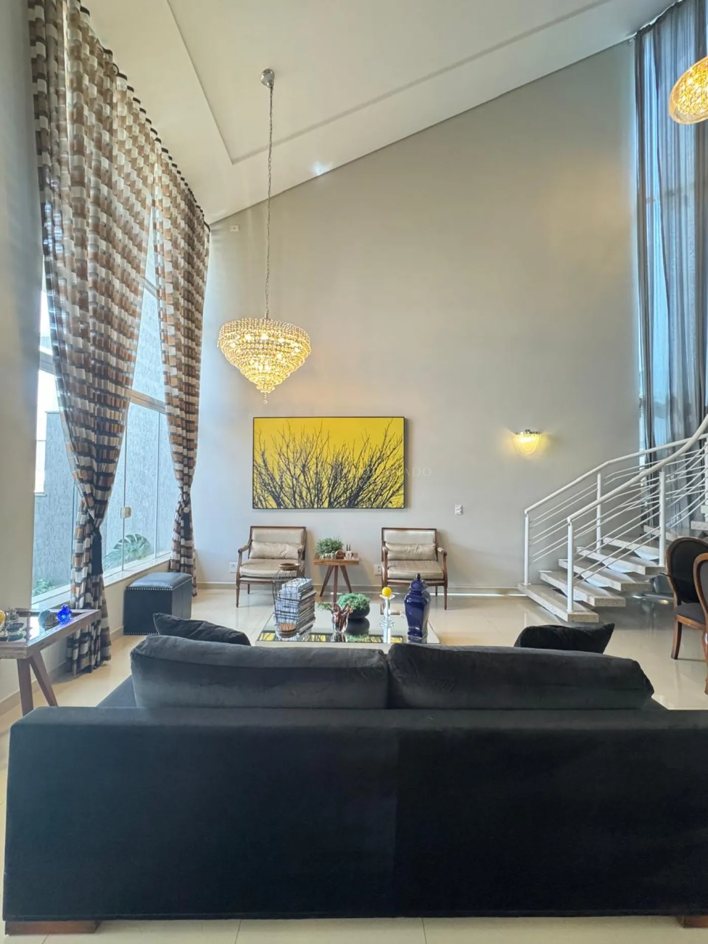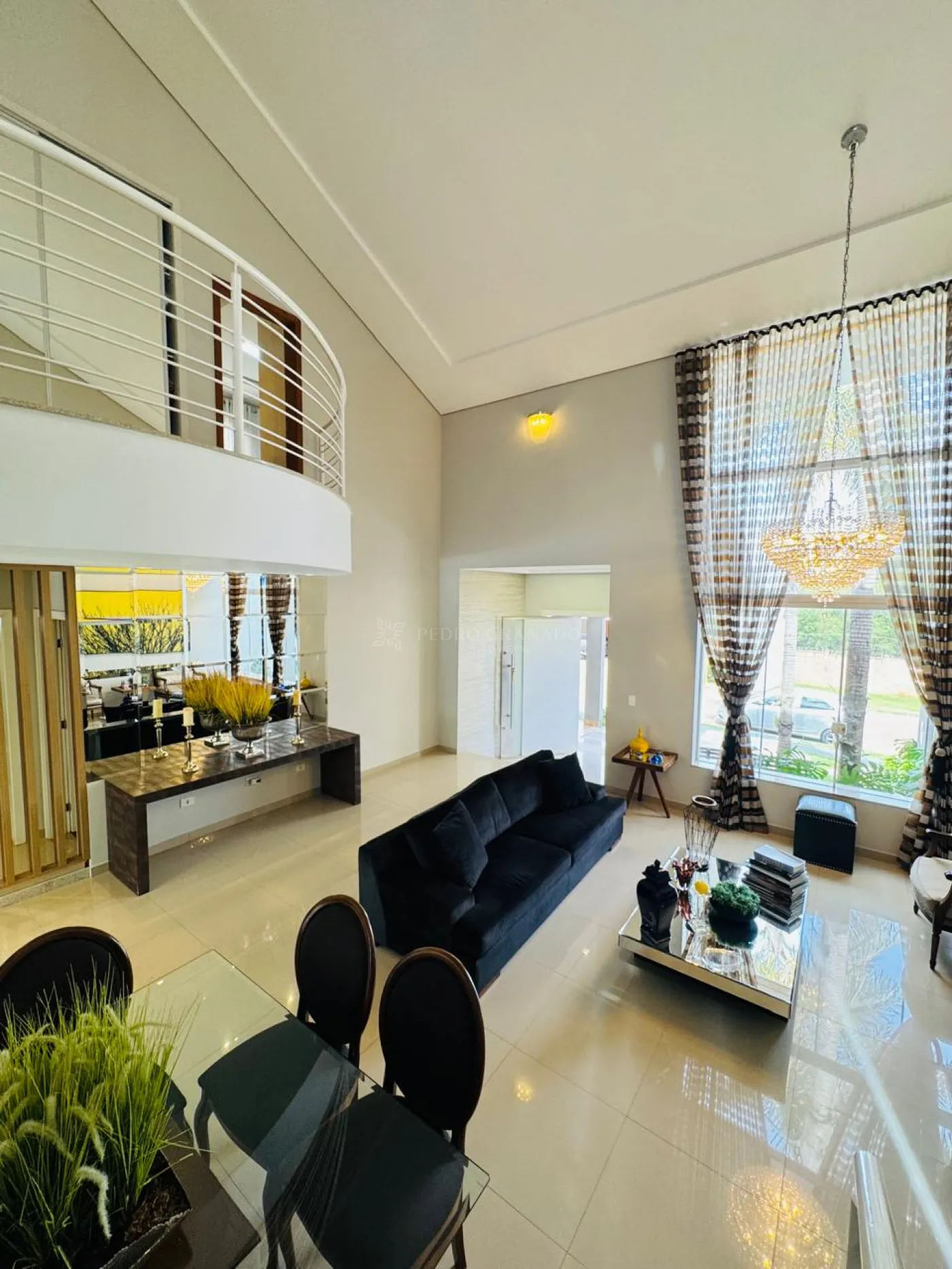 Conta com uma sala imponente com pé-direito duplo, cozinha ampla com ilha, lindo espaço gourmet completo integrado a piscina, home office, uma charmosa suíte master com closet e varanda, uma demi-suíte e lavanderia com área de serviço e dispensa independentes.